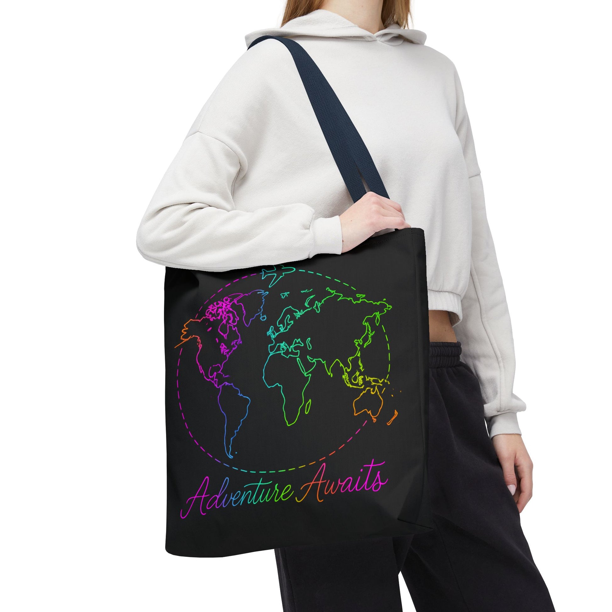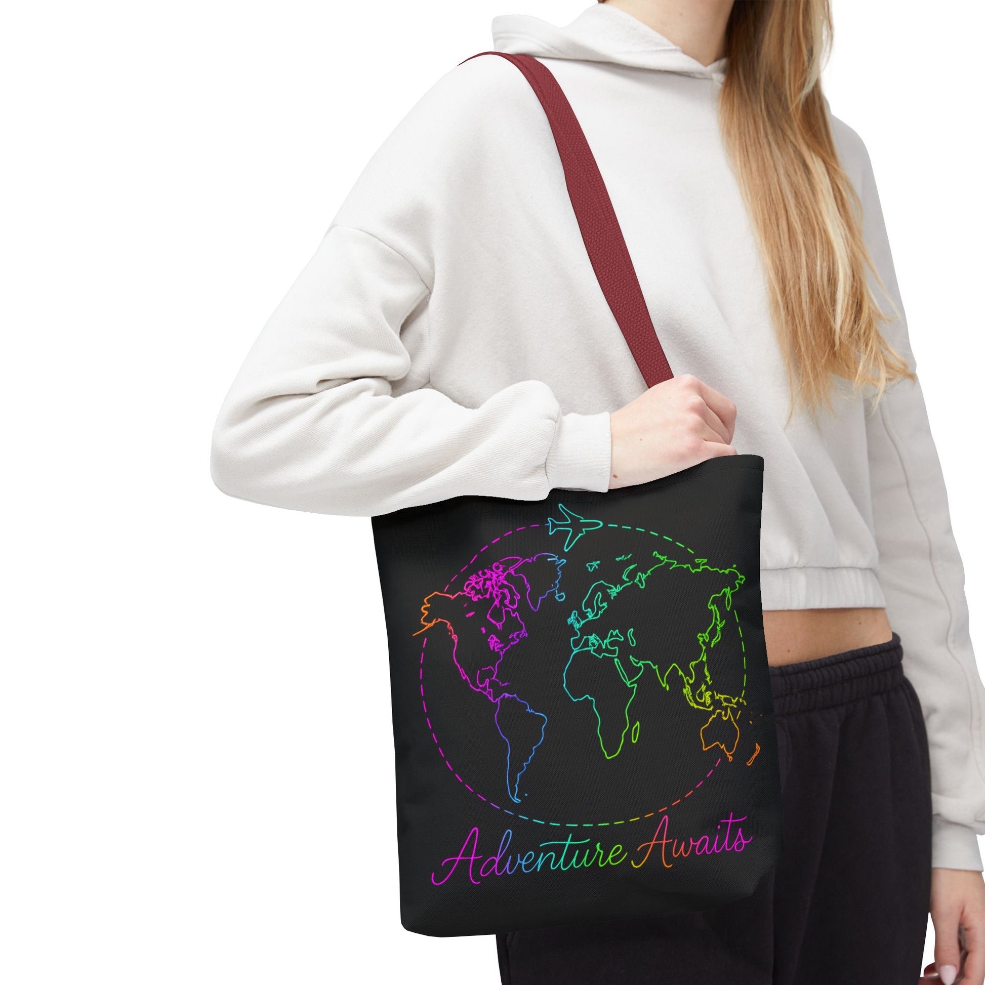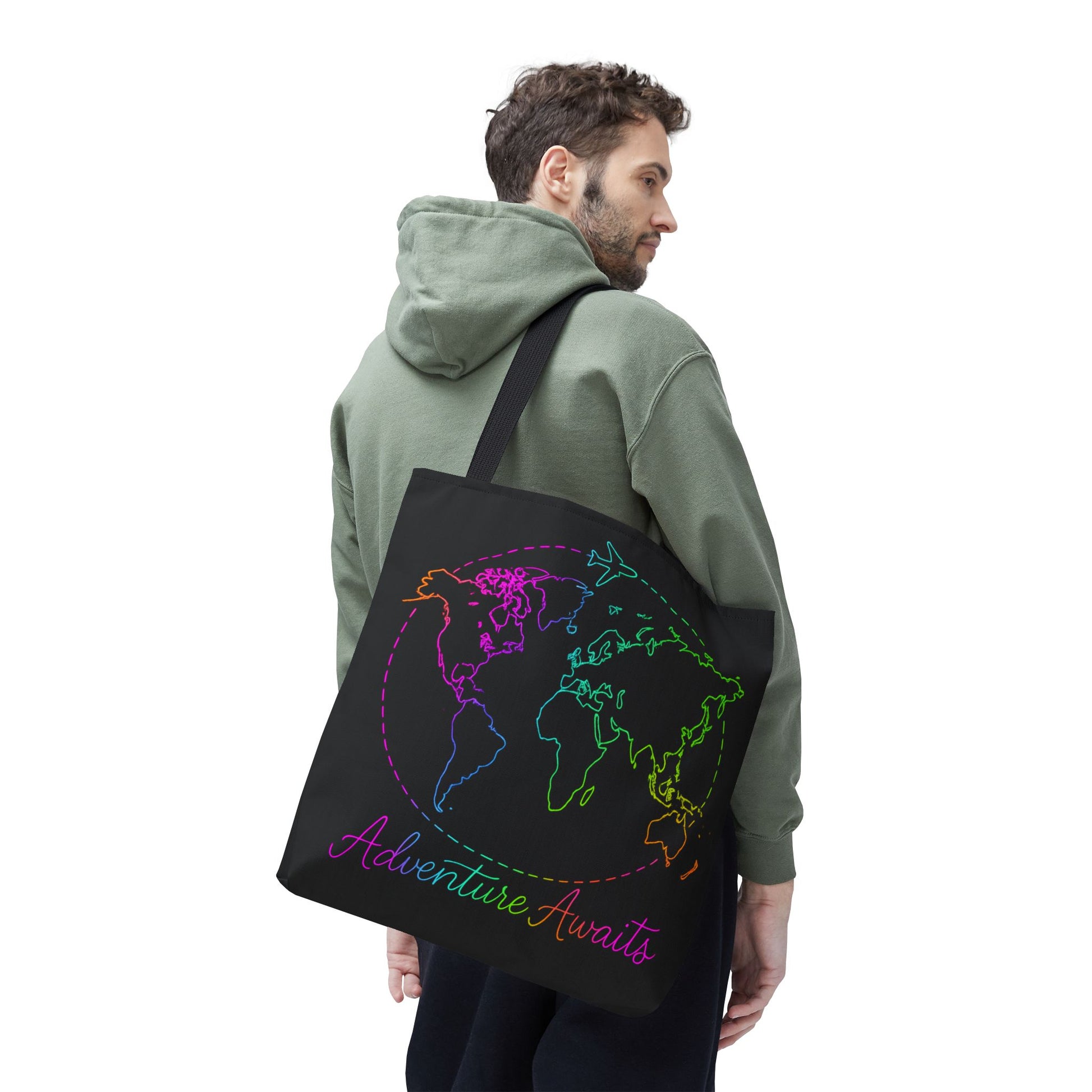 Elevate your everyday carry with our “Adventure Awaits” Neon Tote Bag—featuring a bold, Y2K-inspired rainbow world map and plane design on sleek black canvas. Perfect for travelers, retro lovers, and trendsetters.