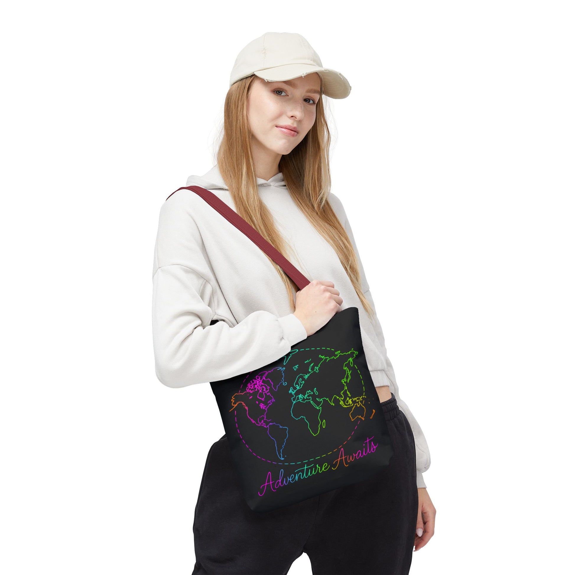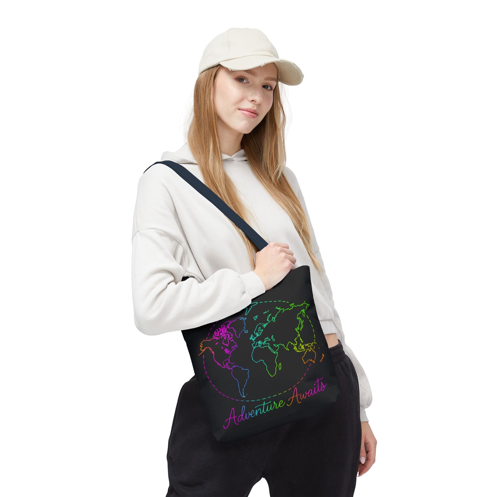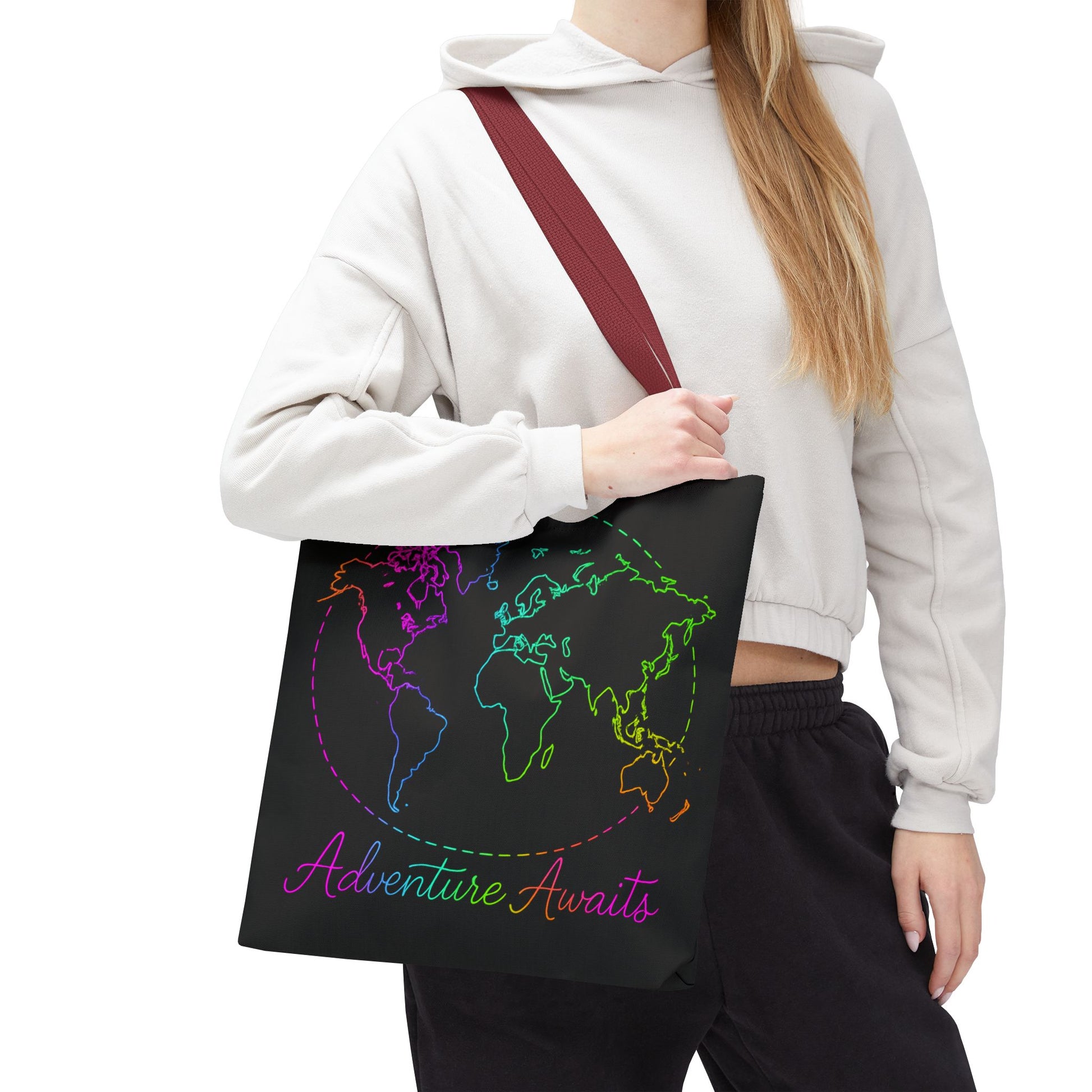 Elevate your everyday carry with our “Adventure Awaits” Neon Tote Bag—featuring a bold, Y2K-inspired rainbow world map and plane design on sleek black canvas. Perfect for travelers, retro lovers, and trendsetters.