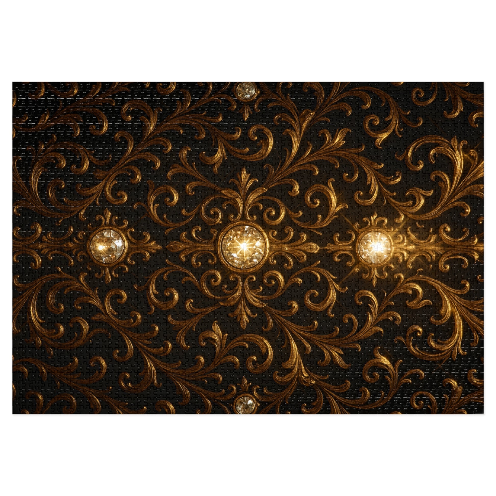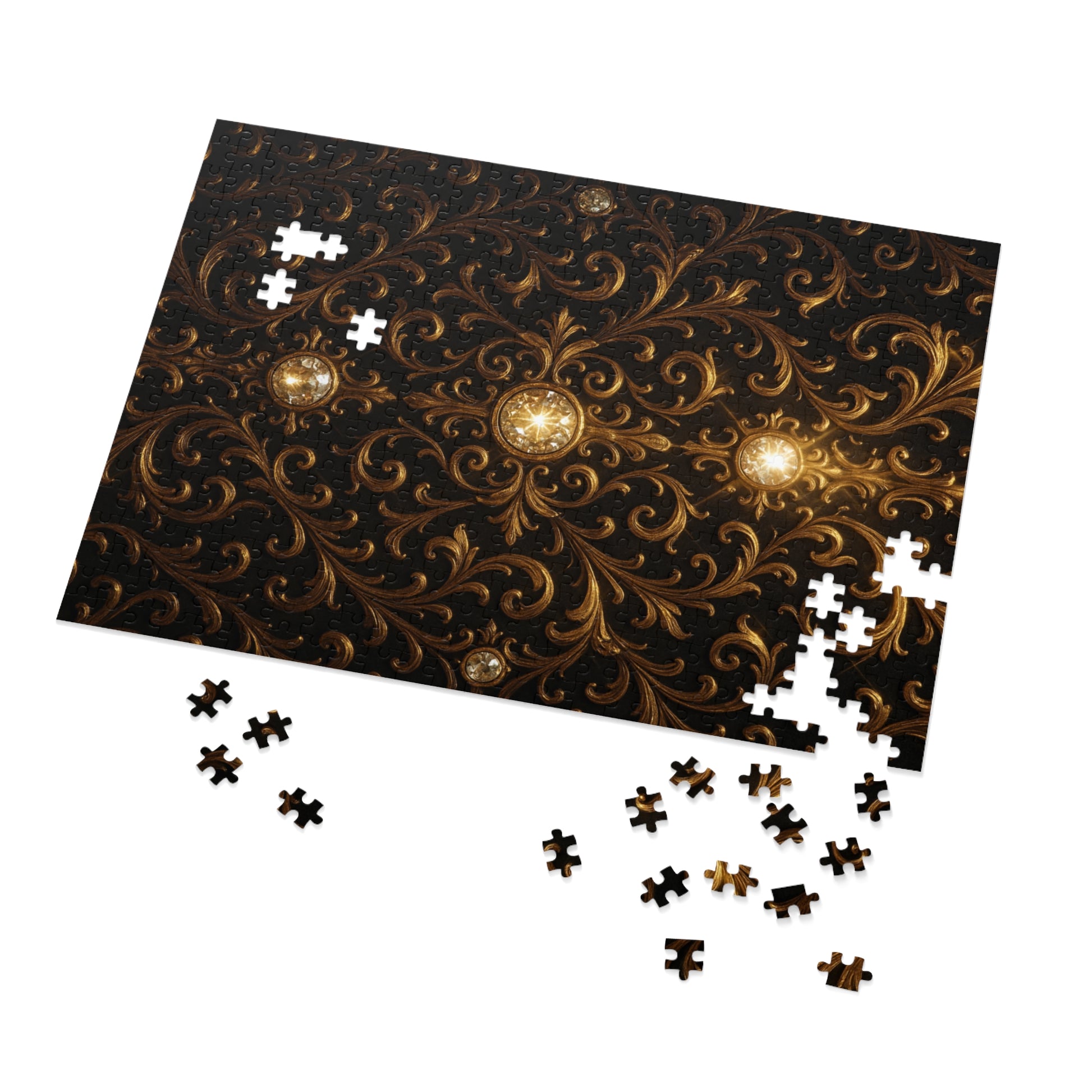 Challenge your mind in style with our Baroque Gold Jigsaw Puzzle. Featuring an opulent black background with golden scrollwork and radiant jewel-like centers, this puzzle turns a fun brain game into a piece of art. Designed for adults and puzzle lovers who appreciate dark elegance and intricate detail.