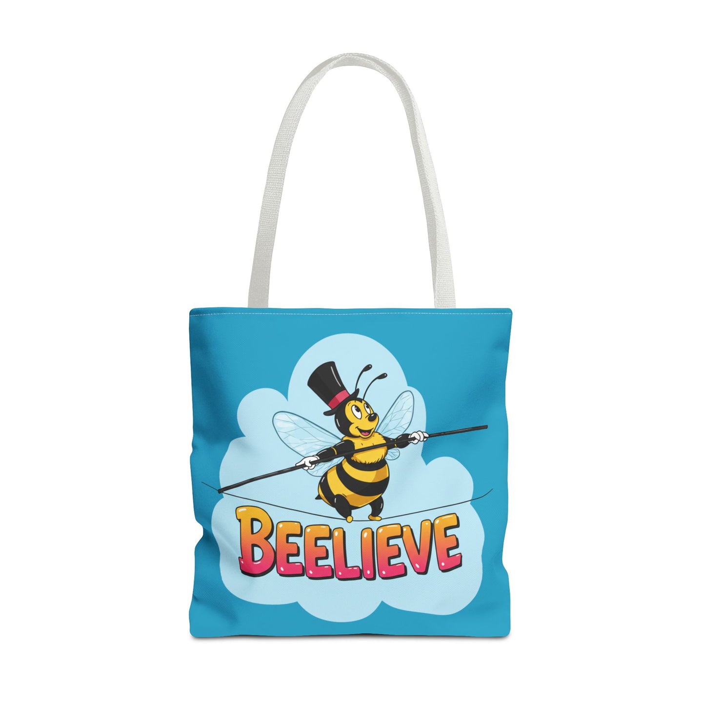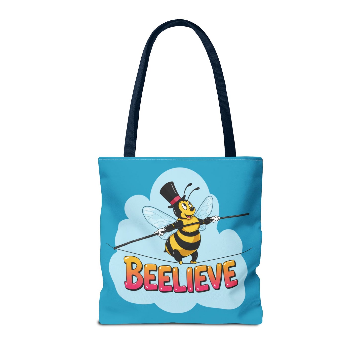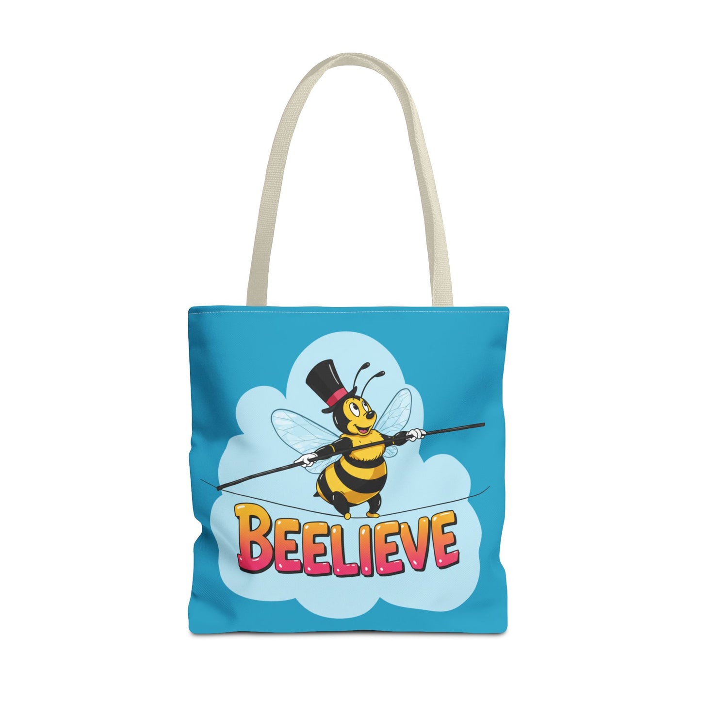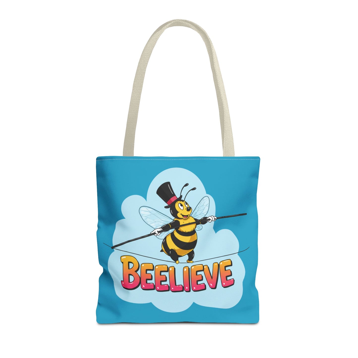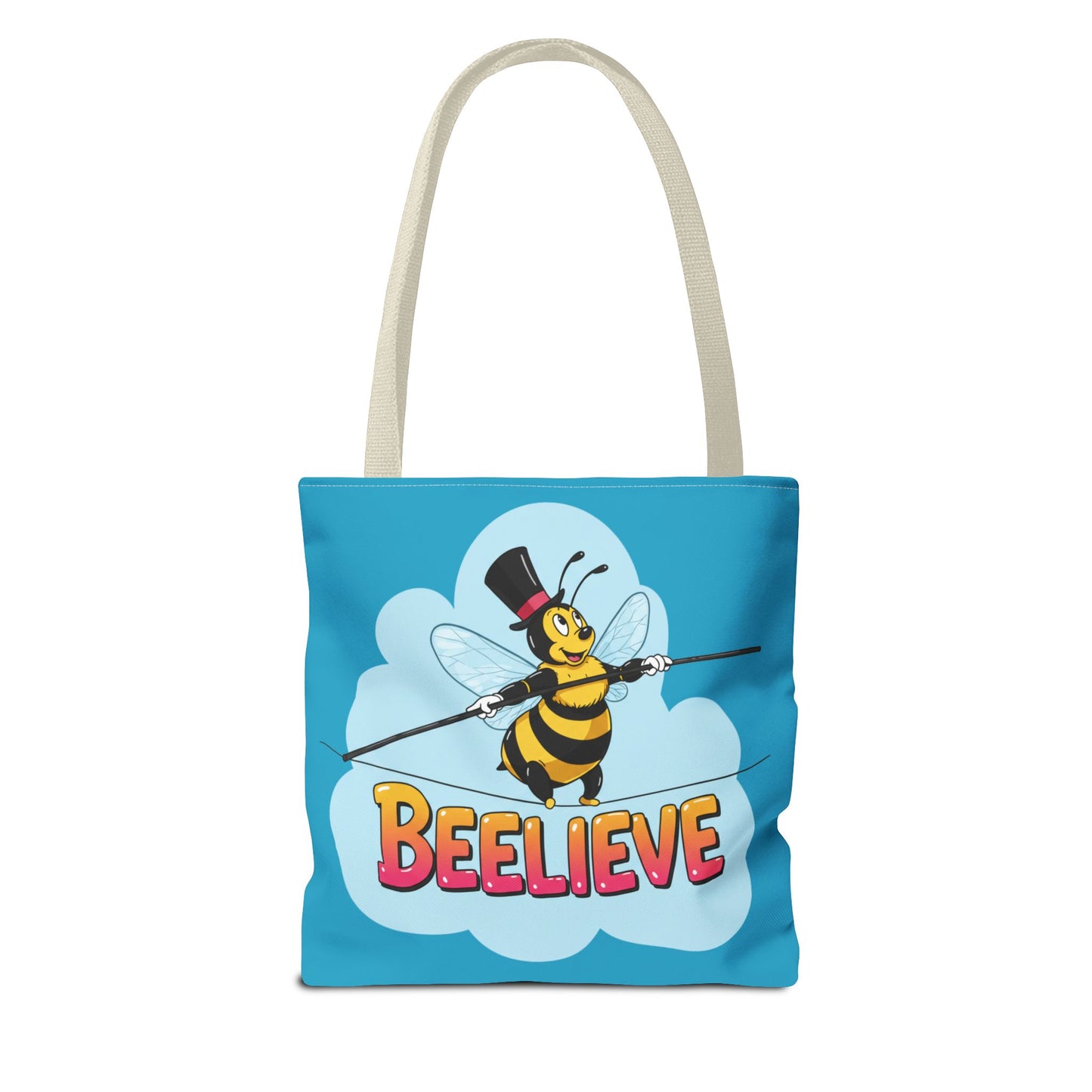 A fun pun tote bag with a bee crossing a tightrope that states "Beelieve". This tote bag gives off a whimsical and playful vibe, perfect for those who appreciate cute and quirky designs. Ideal for everyday use, this tote is relevant for bee lovers, nature enthusiasts, and those looking for a unique accessory to add personality to their outfit. Great for gift-giving during birthdays, Mother's Day, or any occasion that calls for a thoughtful present.