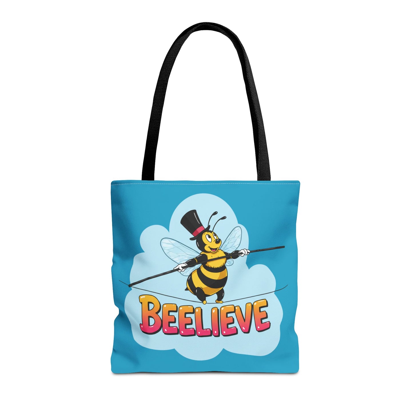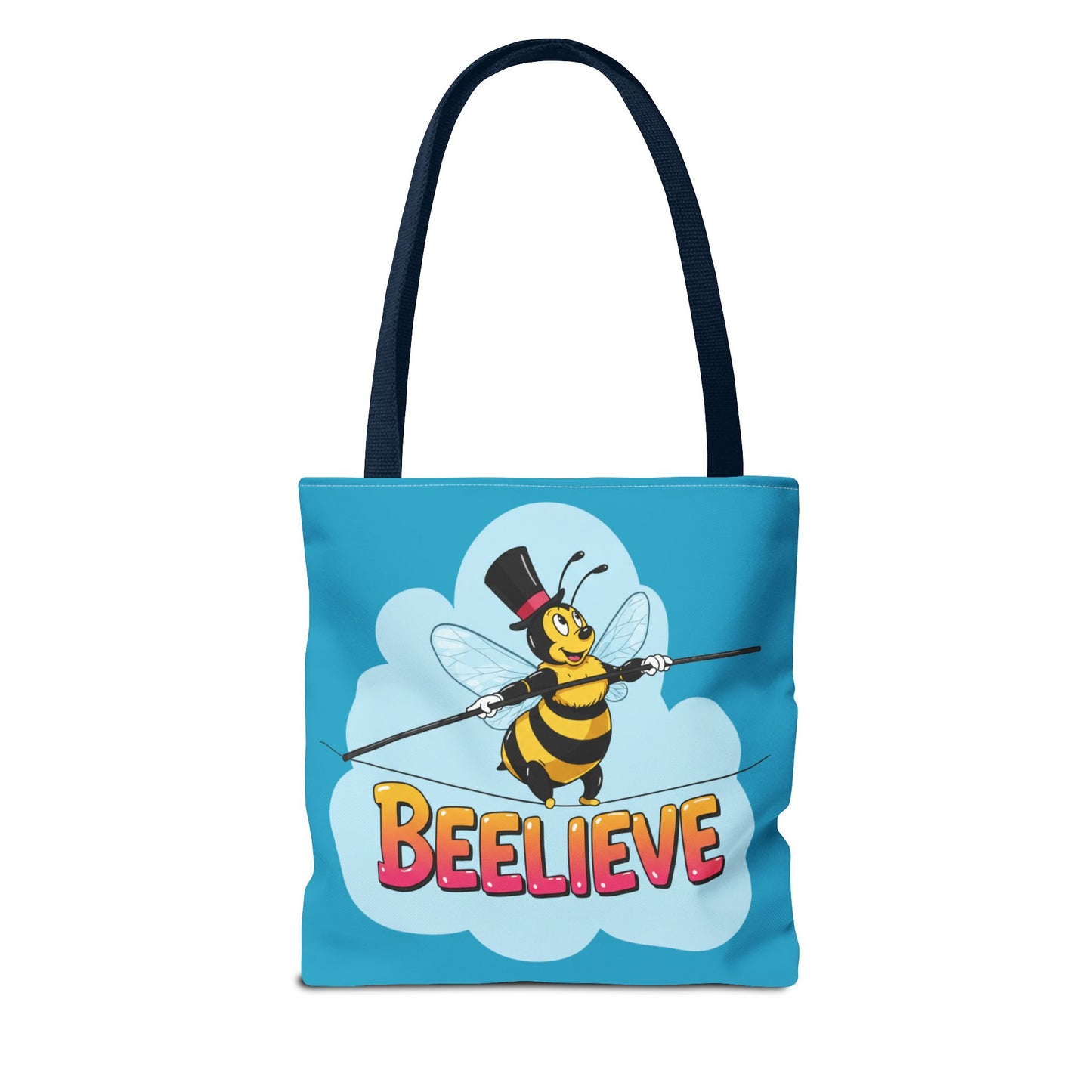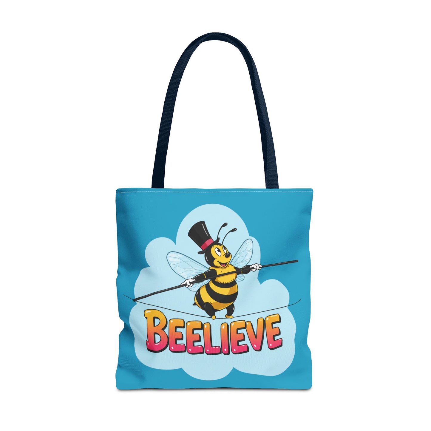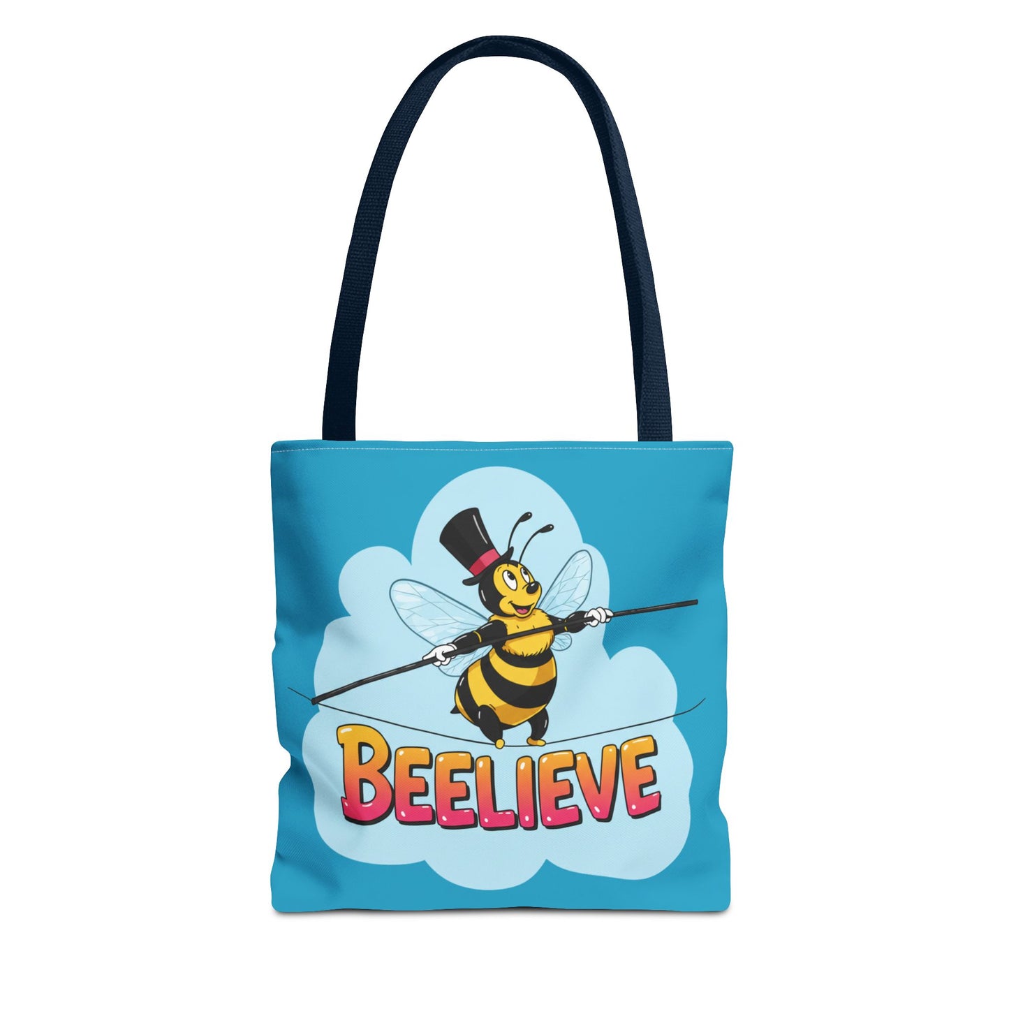 A fun pun tote bag with a bee crossing a tightrope that states "Beelieve". This tote bag gives off a whimsical and playful vibe, perfect for those who appreciate cute and quirky designs. Ideal for everyday use, this tote is relevant for bee lovers, nature enthusiasts, and those looking for a unique accessory to add personality to their outfit. Great for gift-giving during birthdays, Mother's Day, or any occasion that calls for a thoughtful present.