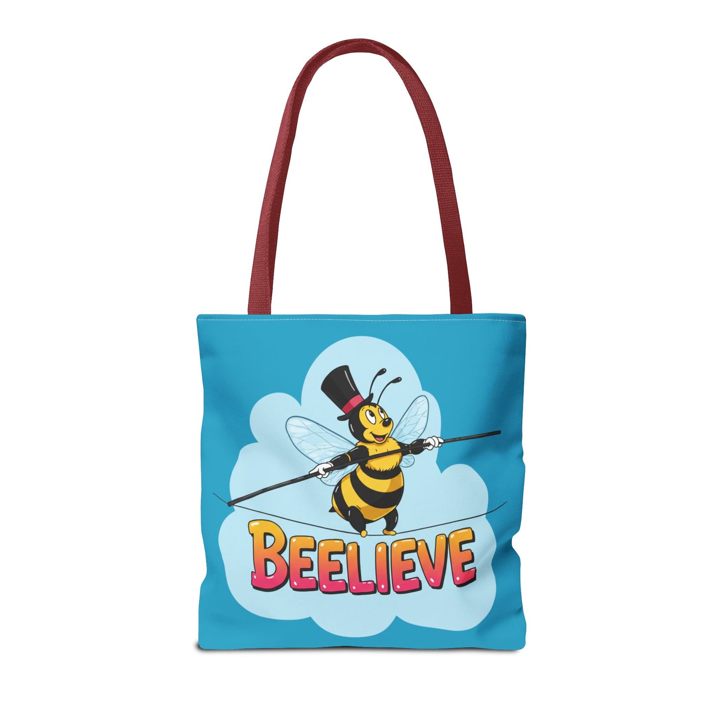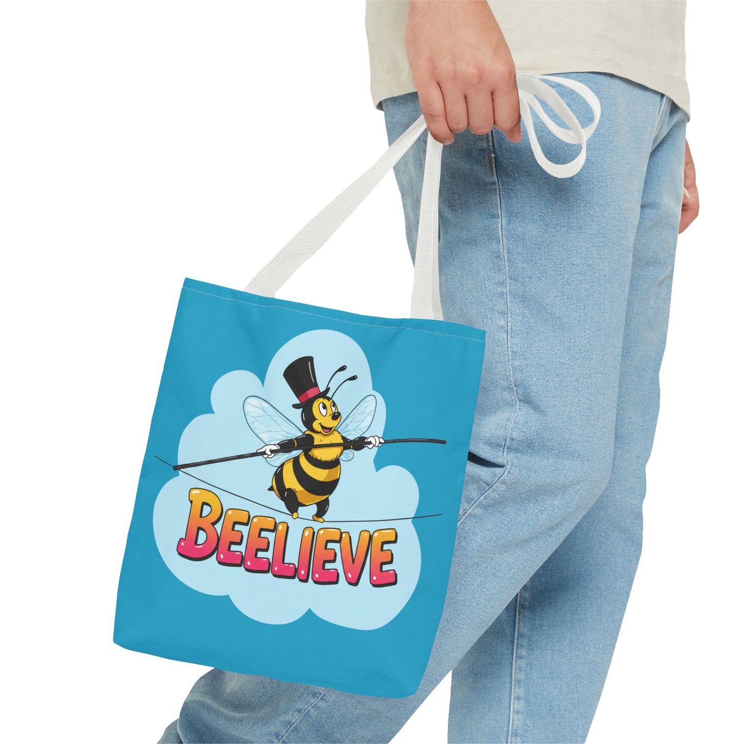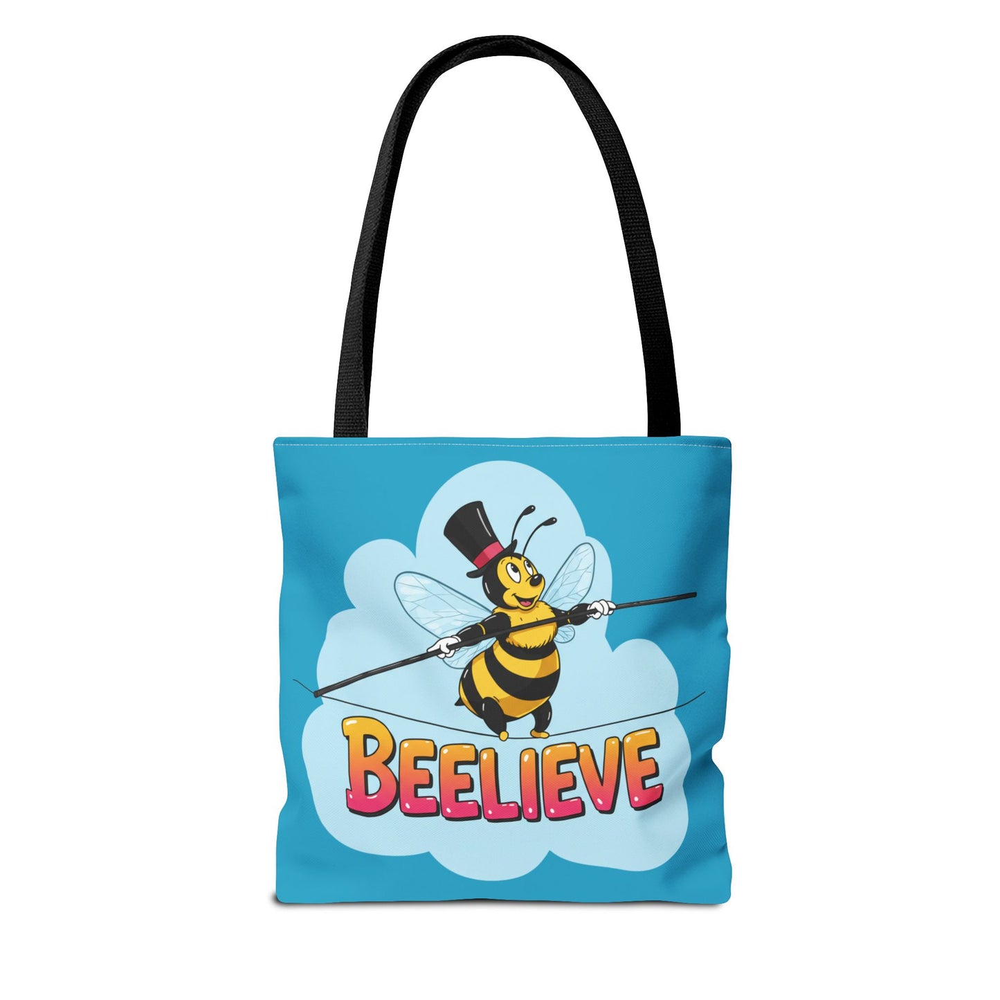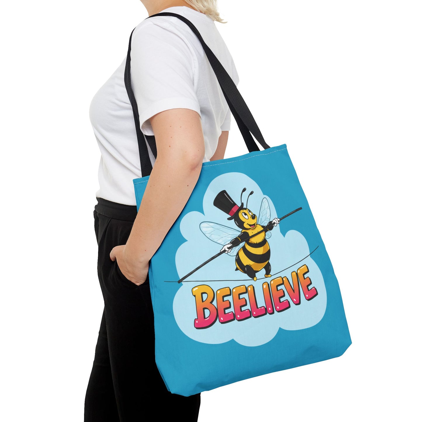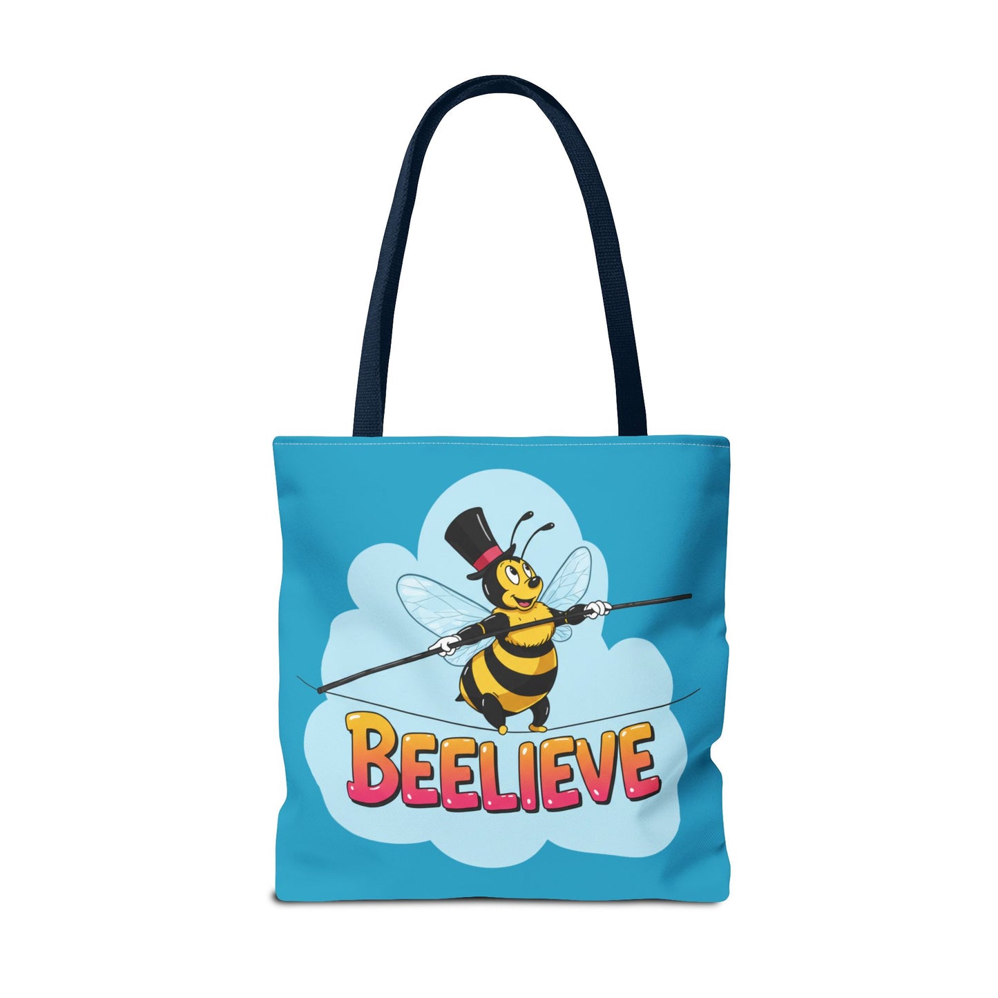 A fun pun tote bag with a bee crossing a tightrope that states "Beelieve". This tote bag gives off a whimsical and playful vibe, perfect for those who appreciate cute and quirky designs. Ideal for everyday use, this tote is relevant for bee lovers, nature enthusiasts, and those looking for a unique accessory to add personality to their outfit. Great for gift-giving during birthdays, Mother's Day, or any occasion that calls for a thoughtful present.