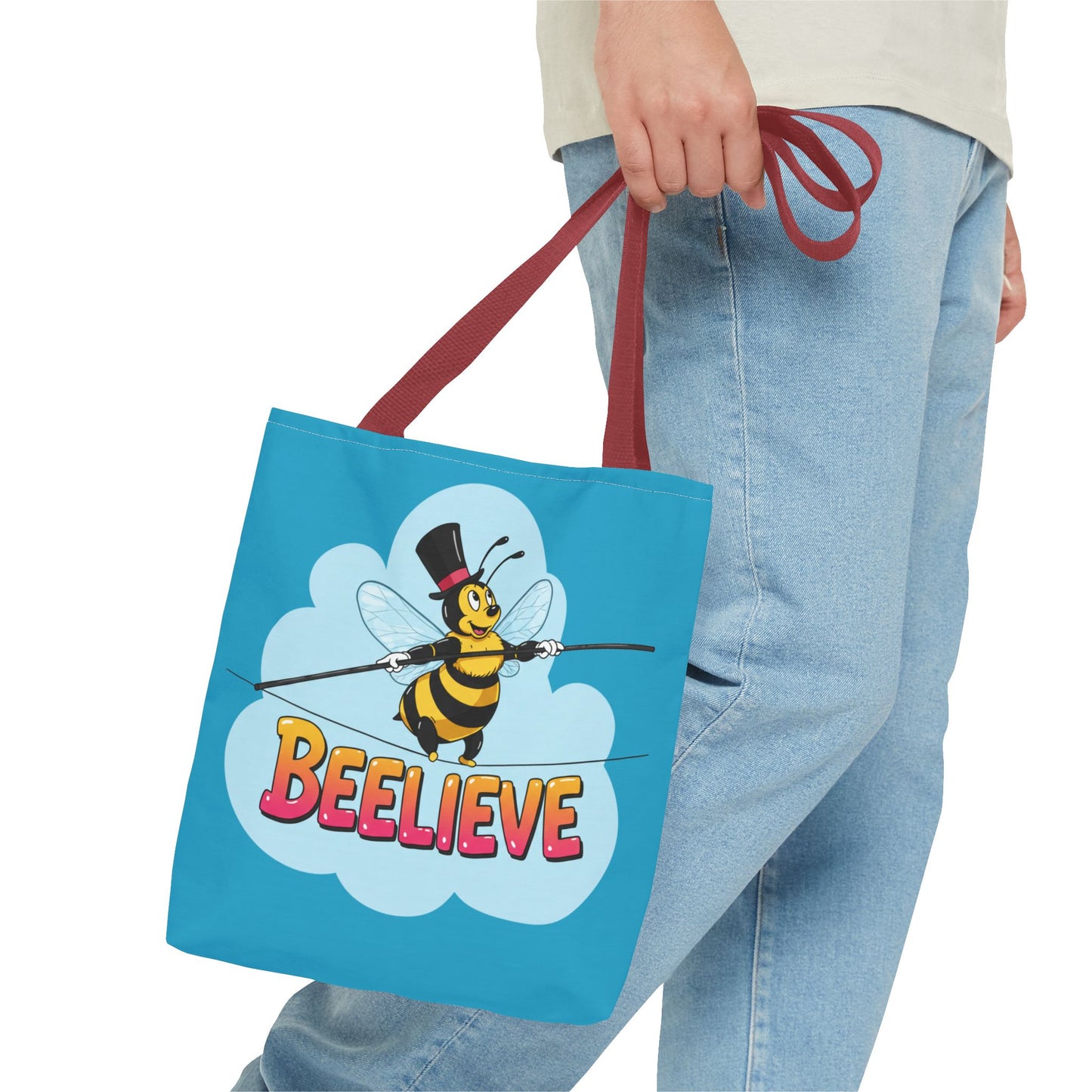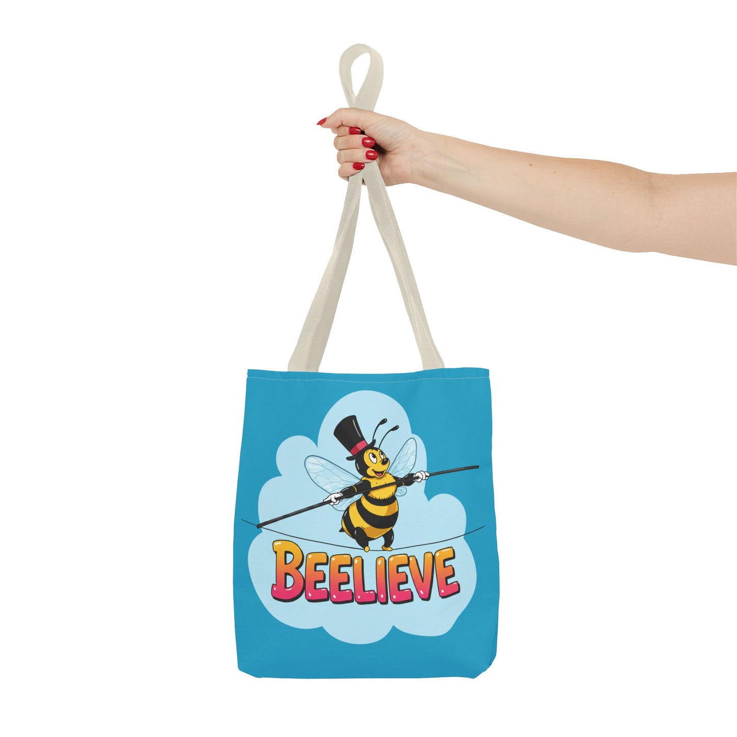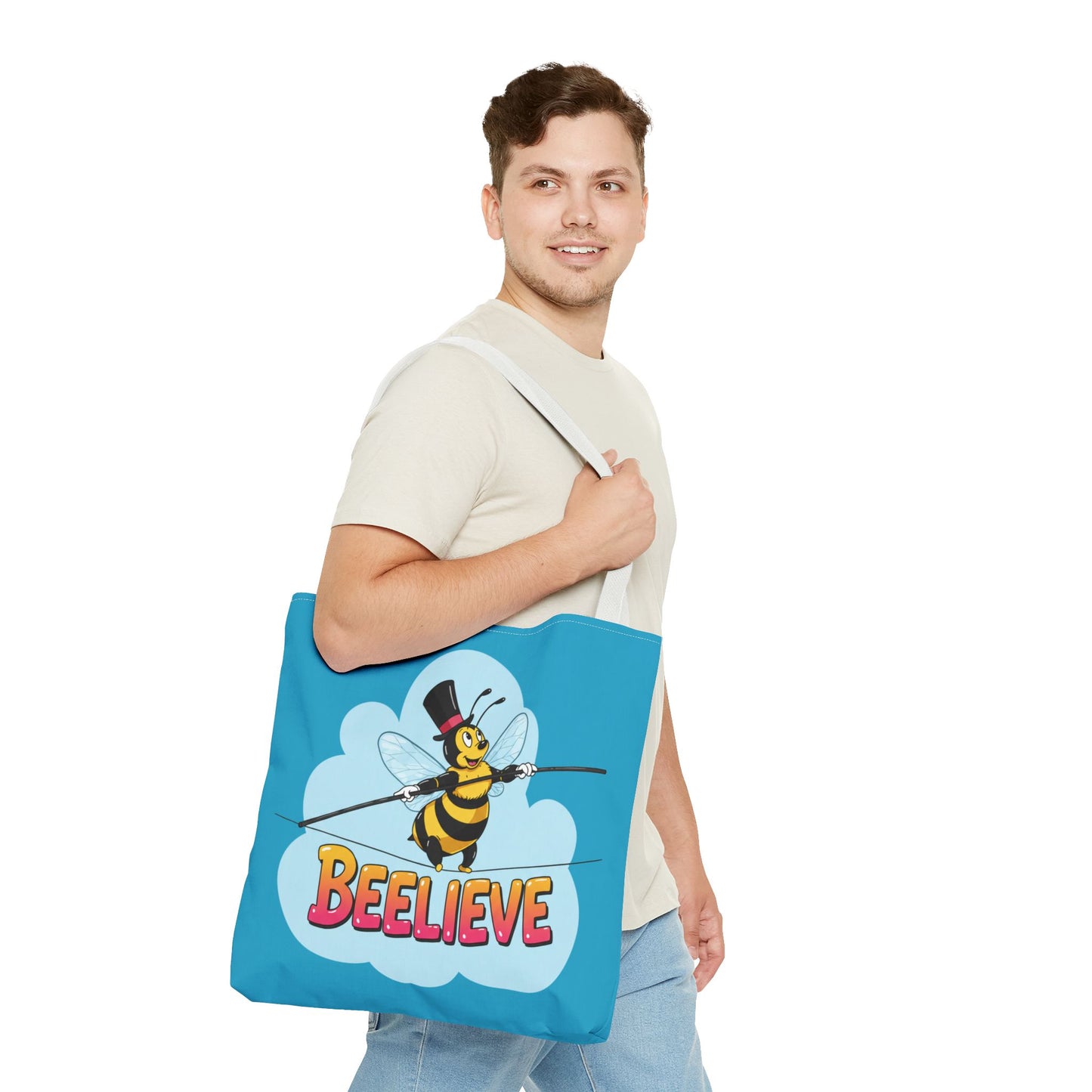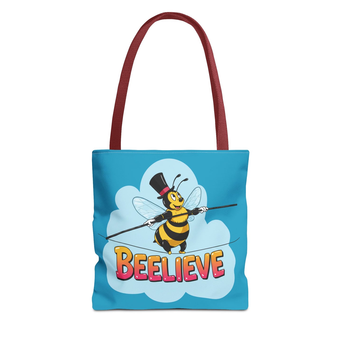 A fun pun tote bag with a bee crossing a tightrope that states "Beelieve". This tote bag gives off a whimsical and playful vibe, perfect for those who appreciate cute and quirky designs. Ideal for everyday use, this tote is relevant for bee lovers, nature enthusiasts, and those looking for a unique accessory to add personality to their outfit. Great for gift-giving during birthdays, Mother's Day, or any occasion that calls for a thoughtful present.