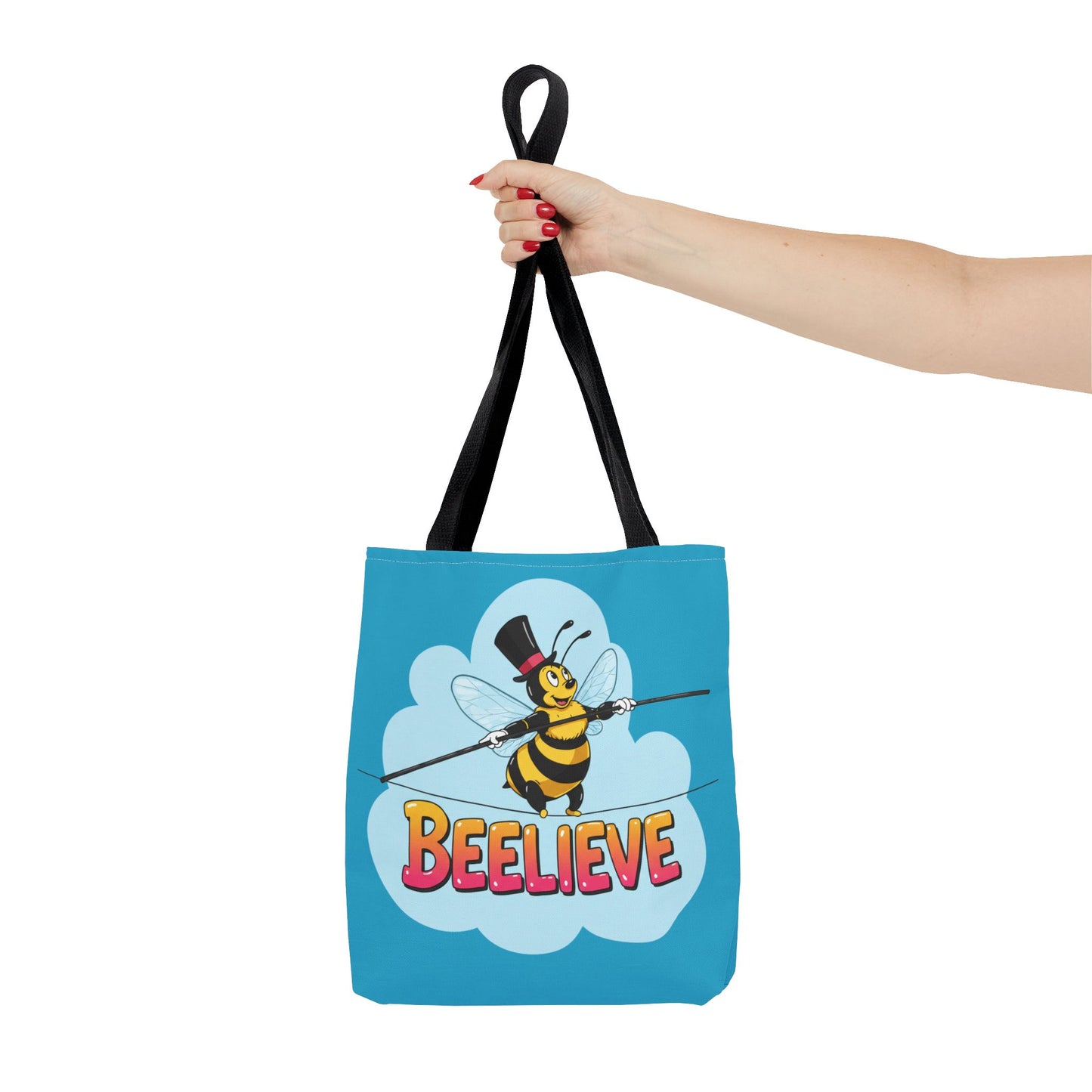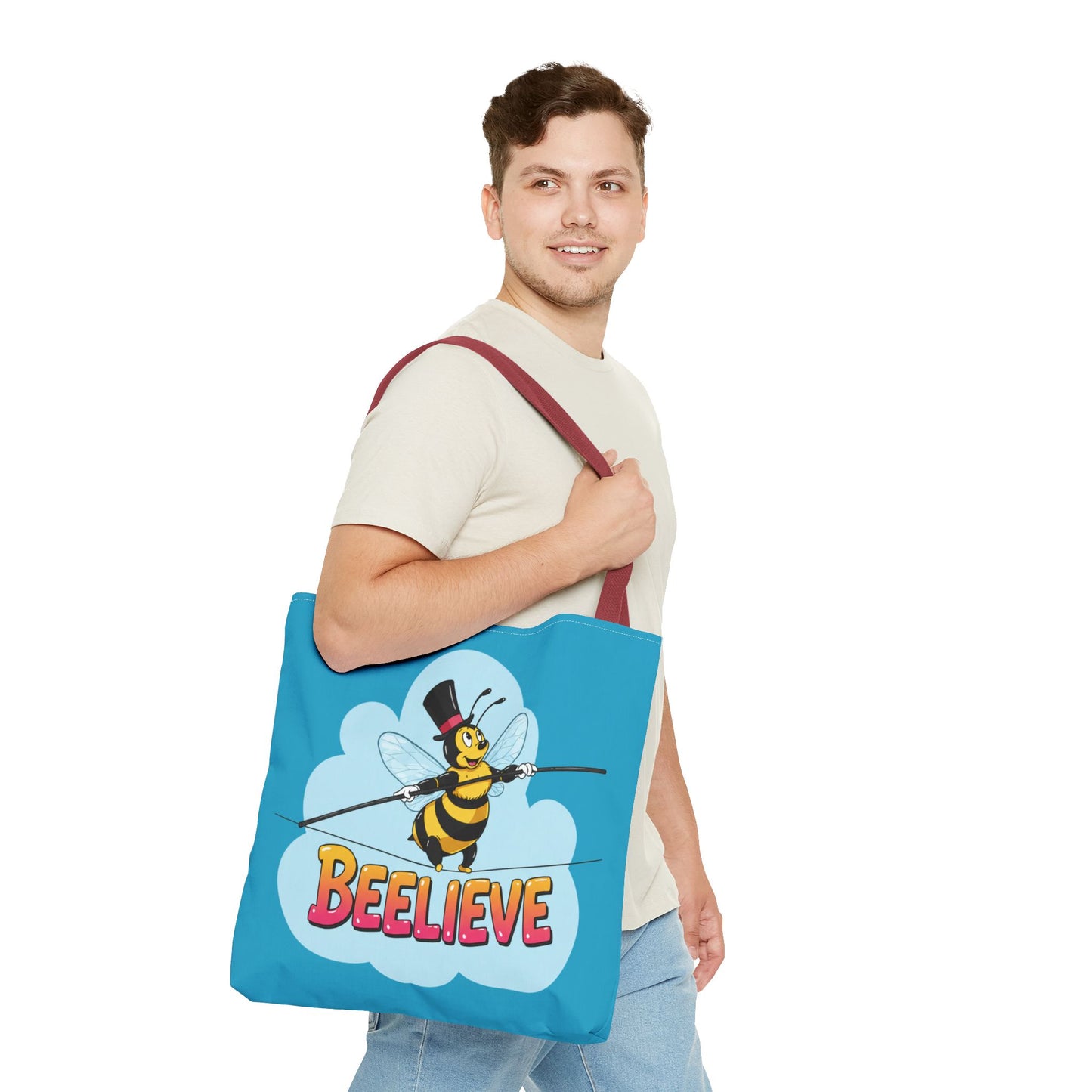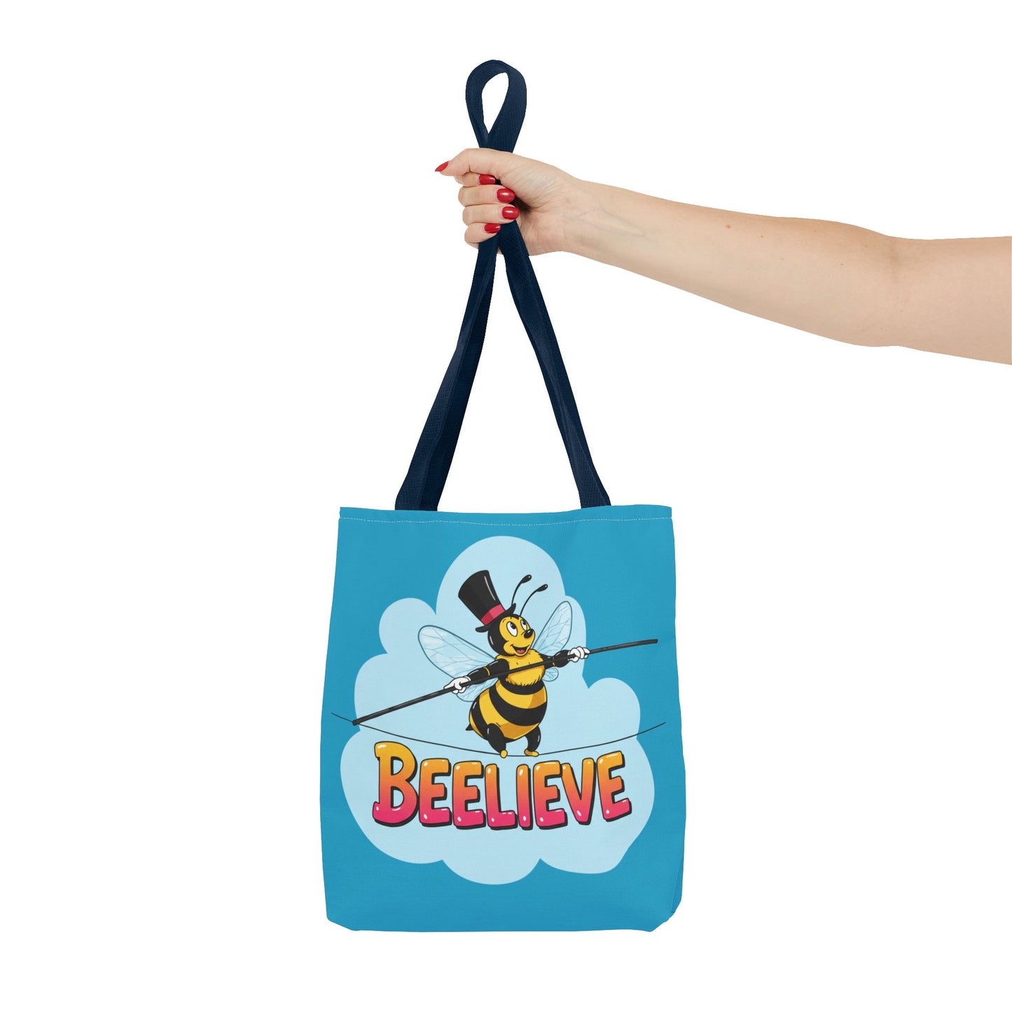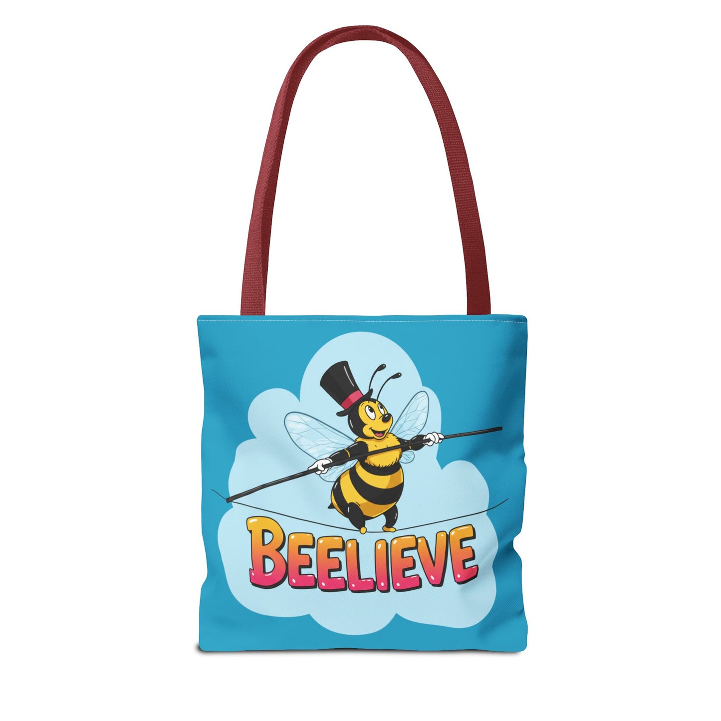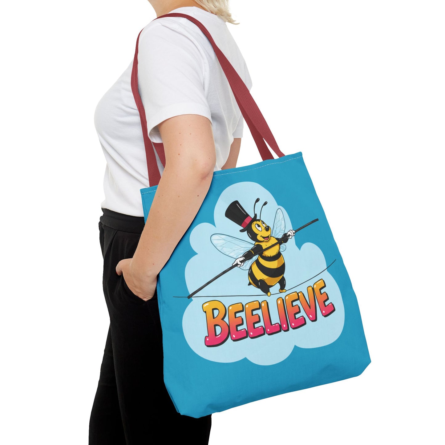 A fun pun tote bag with a bee crossing a tightrope that states "Beelieve". This tote bag gives off a whimsical and playful vibe, perfect for those who appreciate cute and quirky designs. Ideal for everyday use, this tote is relevant for bee lovers, nature enthusiasts, and those looking for a unique accessory to add personality to their outfit. Great for gift-giving during birthdays, Mother's Day, or any occasion that calls for a thoughtful present.