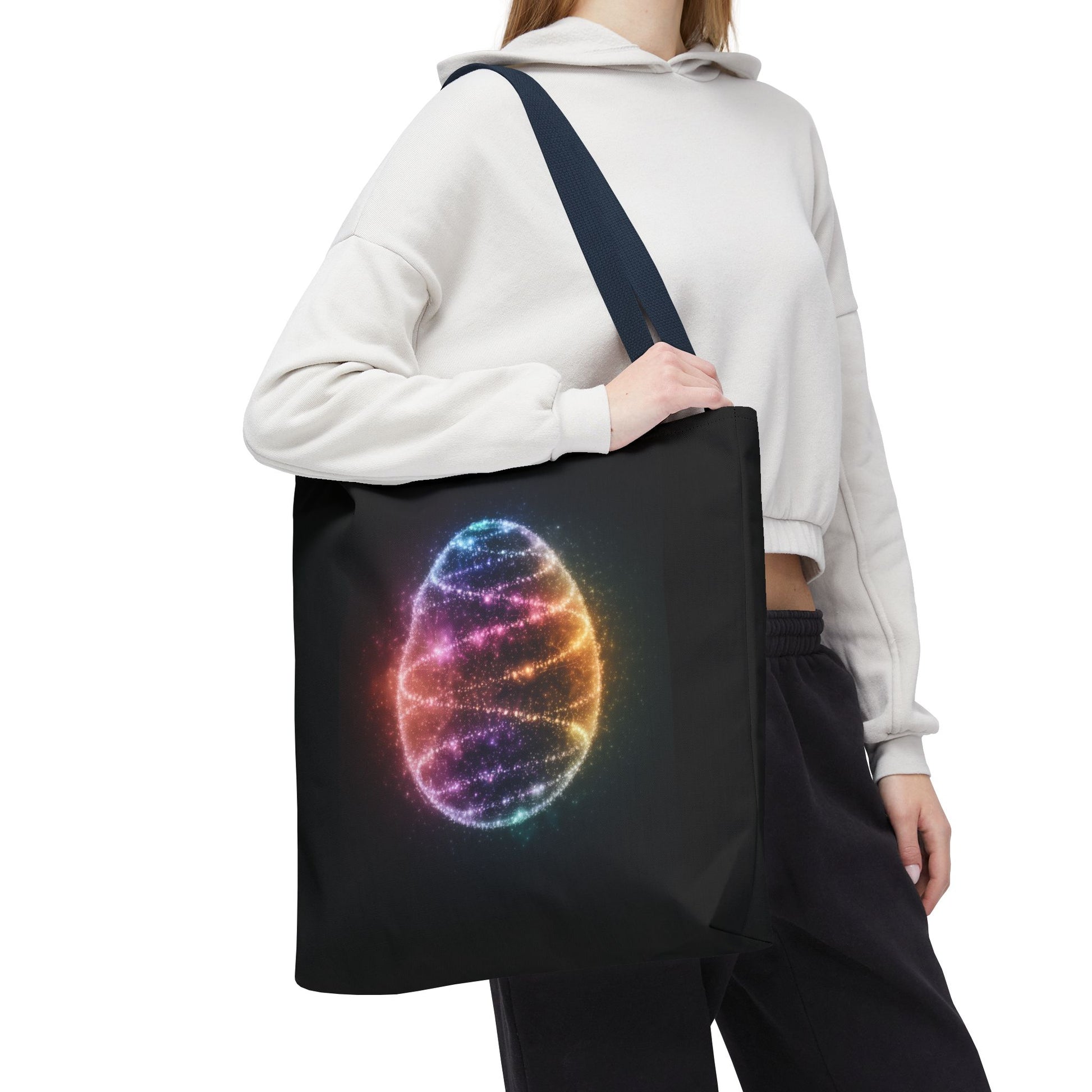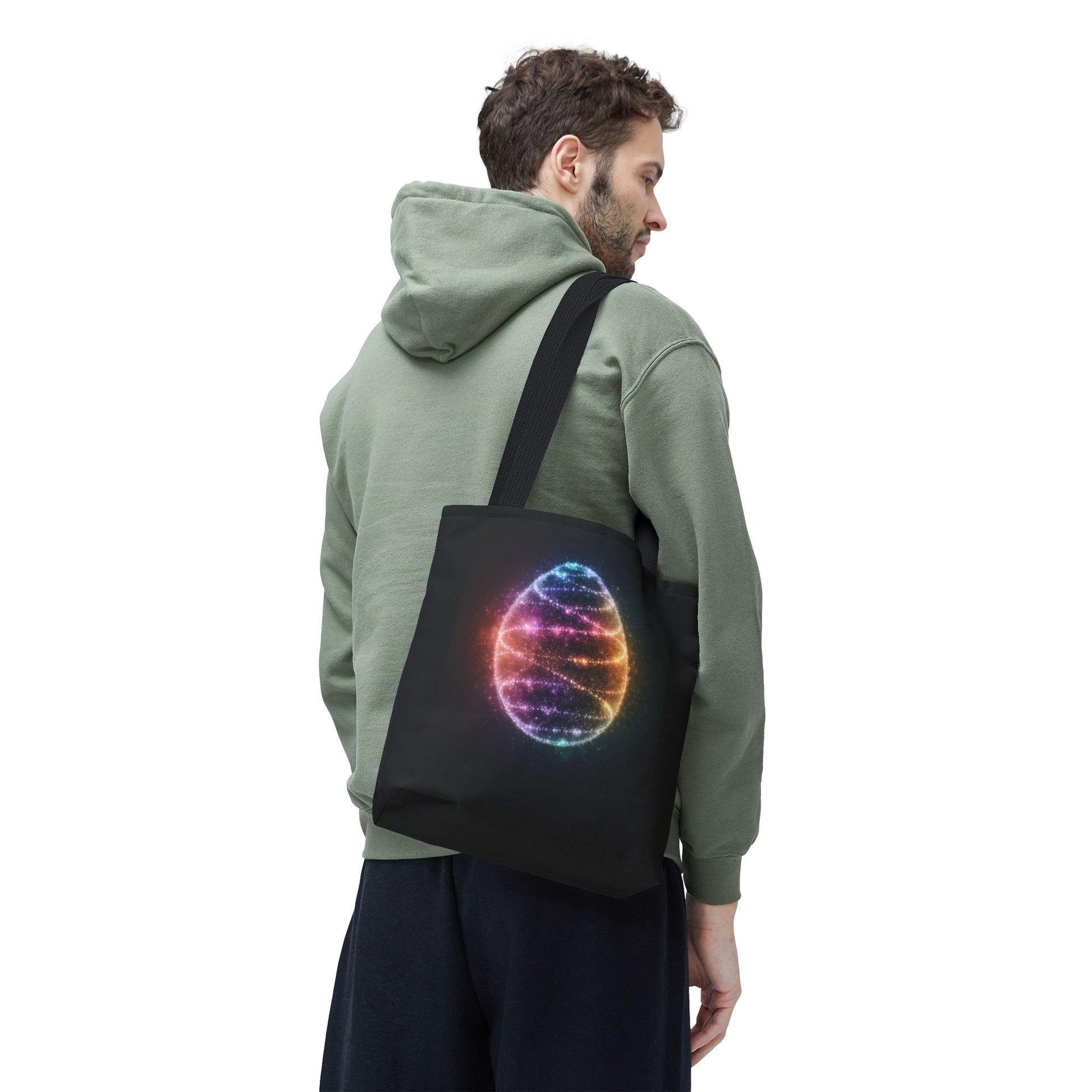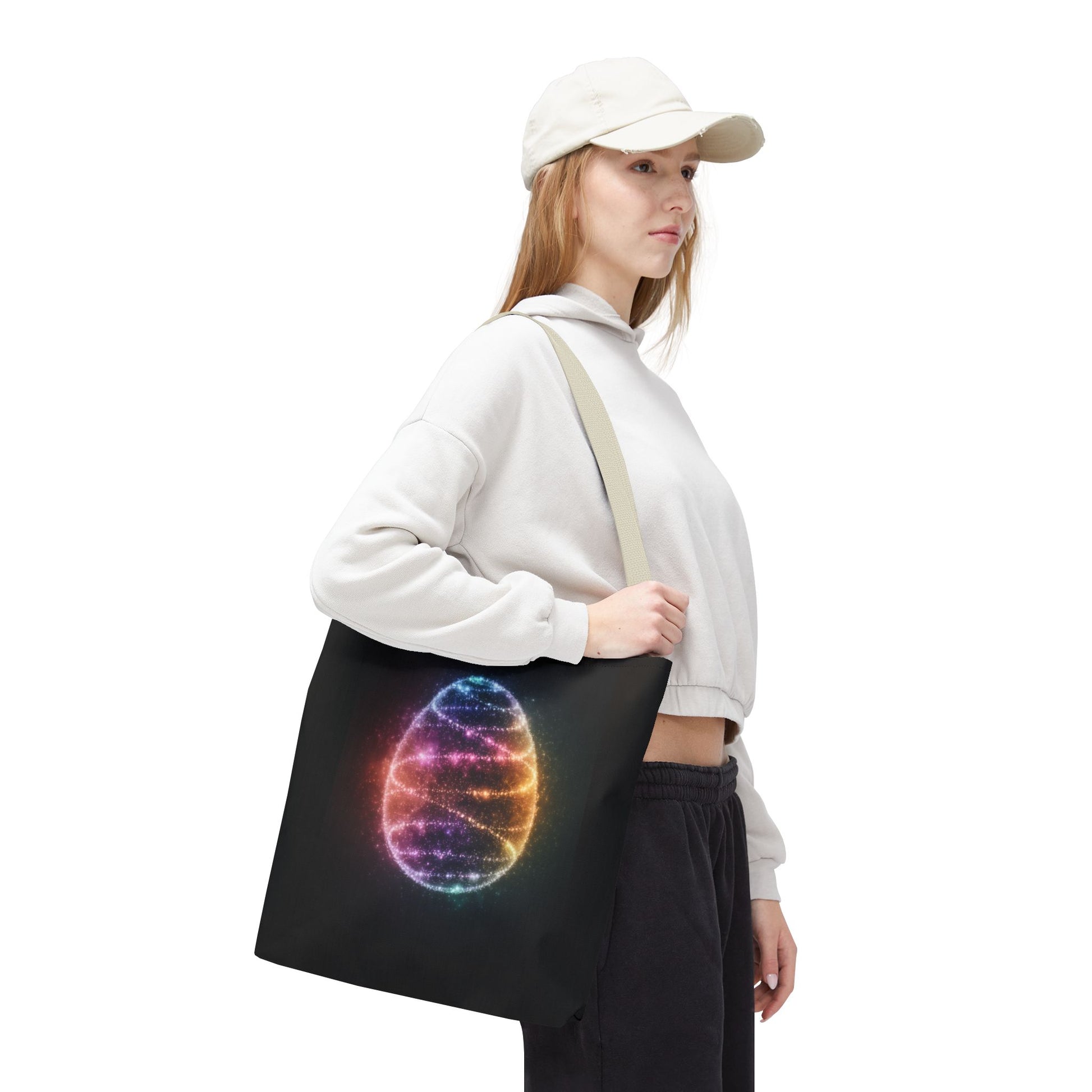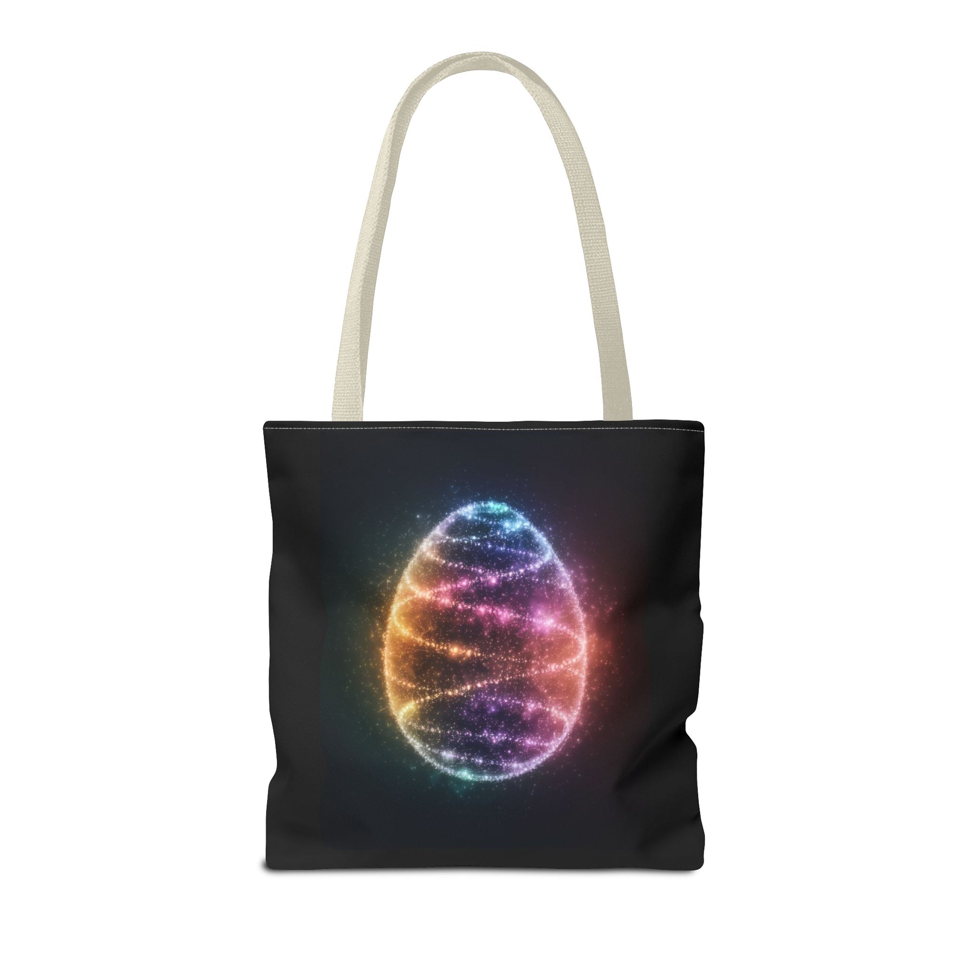 A fun tote bag featuring a bioluminescent Easter Egg design. Perfect for adding a touch of whimsy to your everyday errands or shopping trips. Ideal for those who love unique and playful accessories. Relevant for Easter celebrations and egg hunts.
