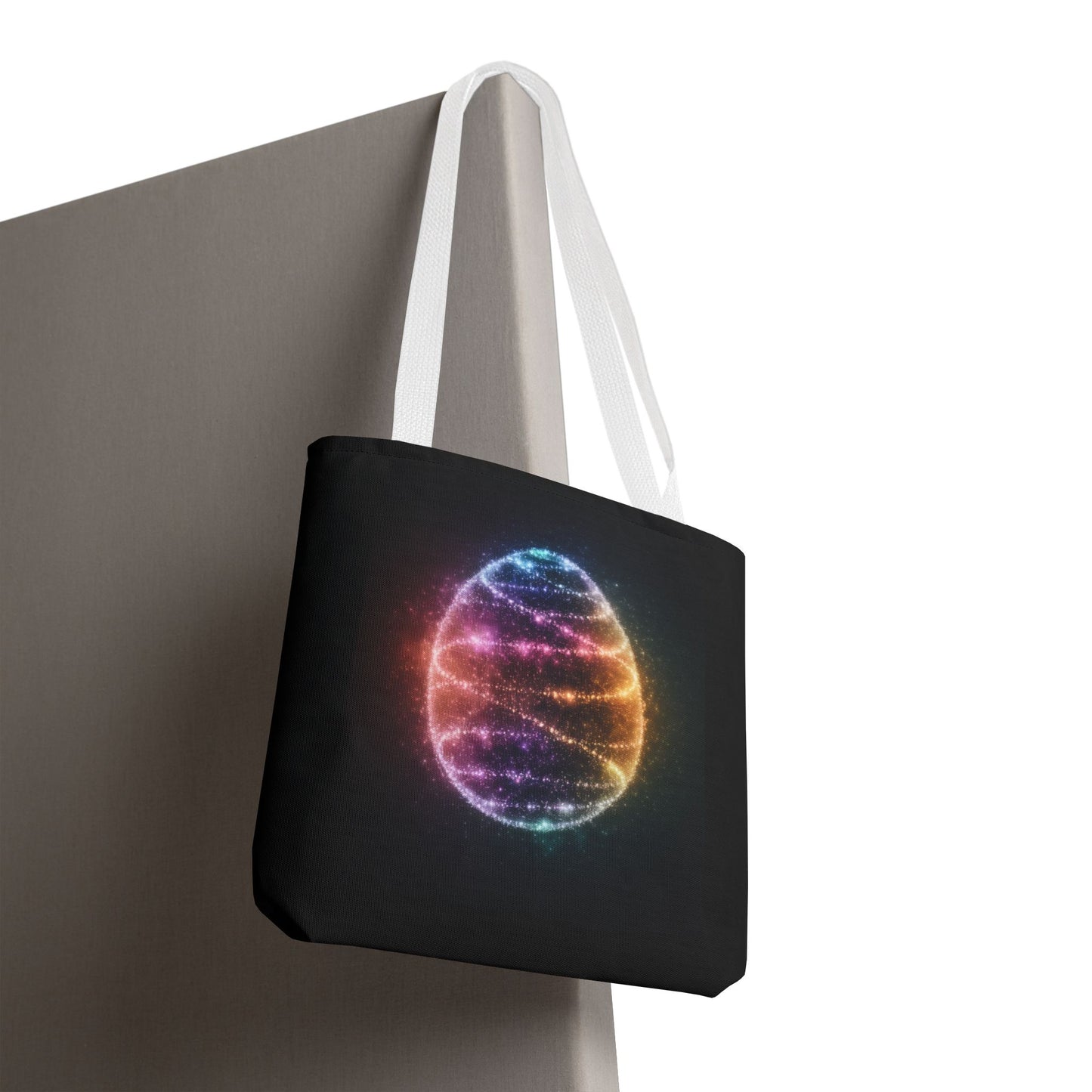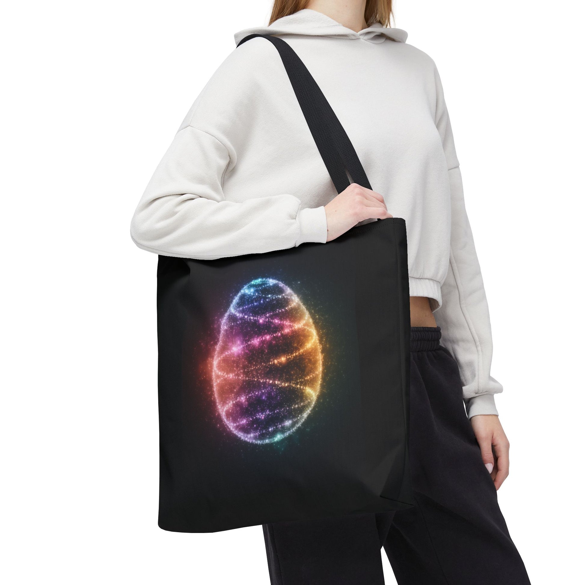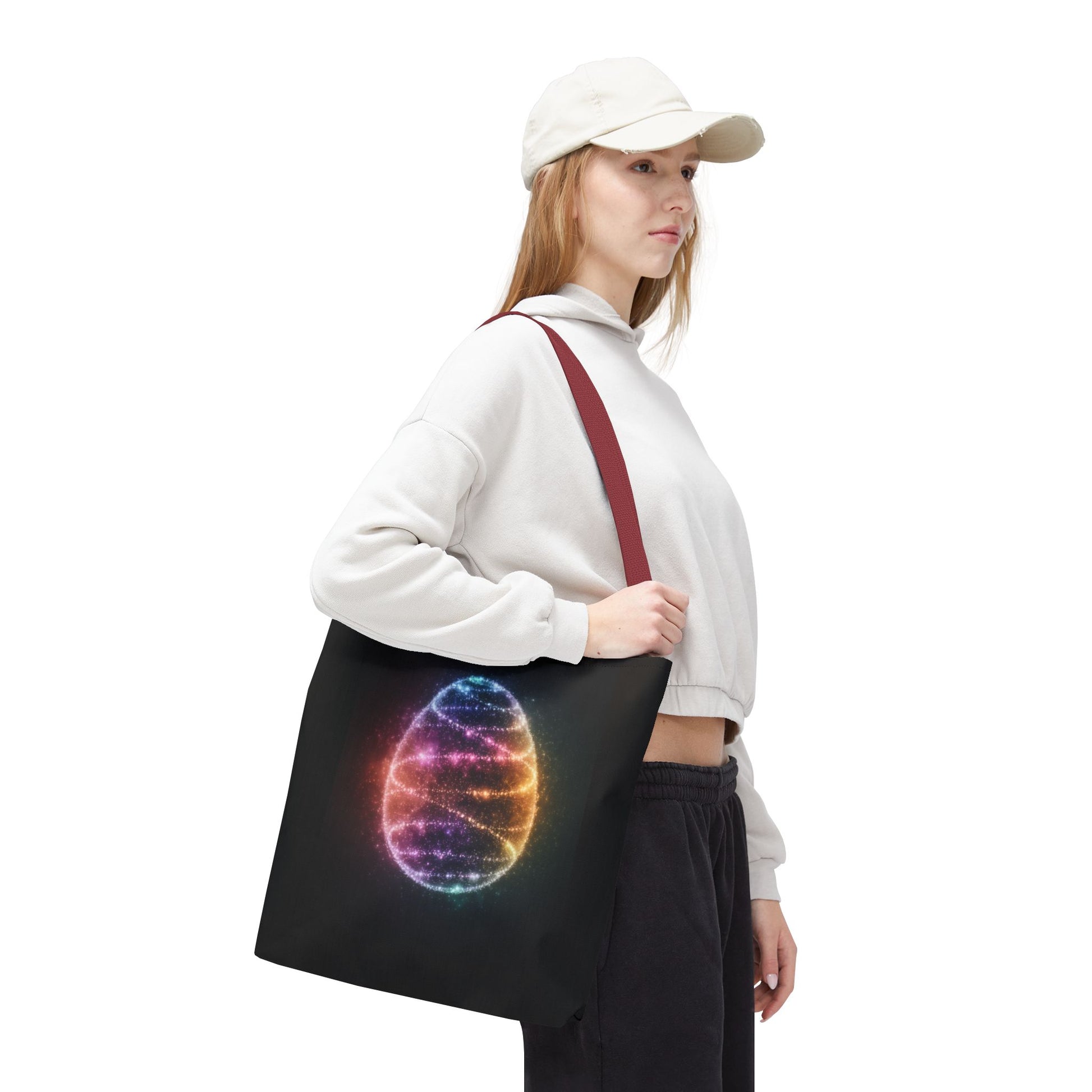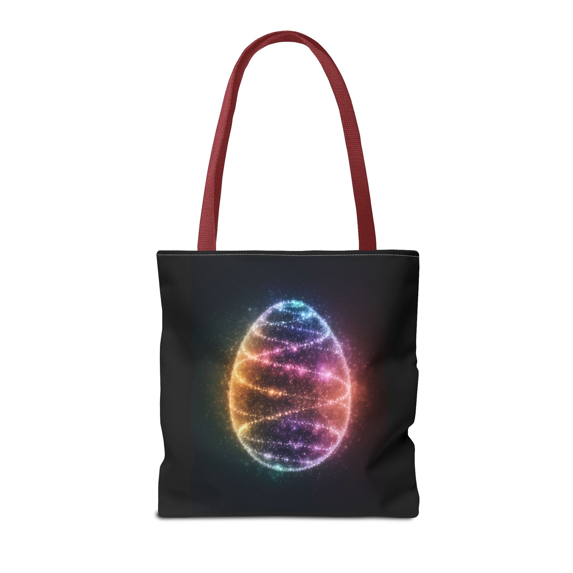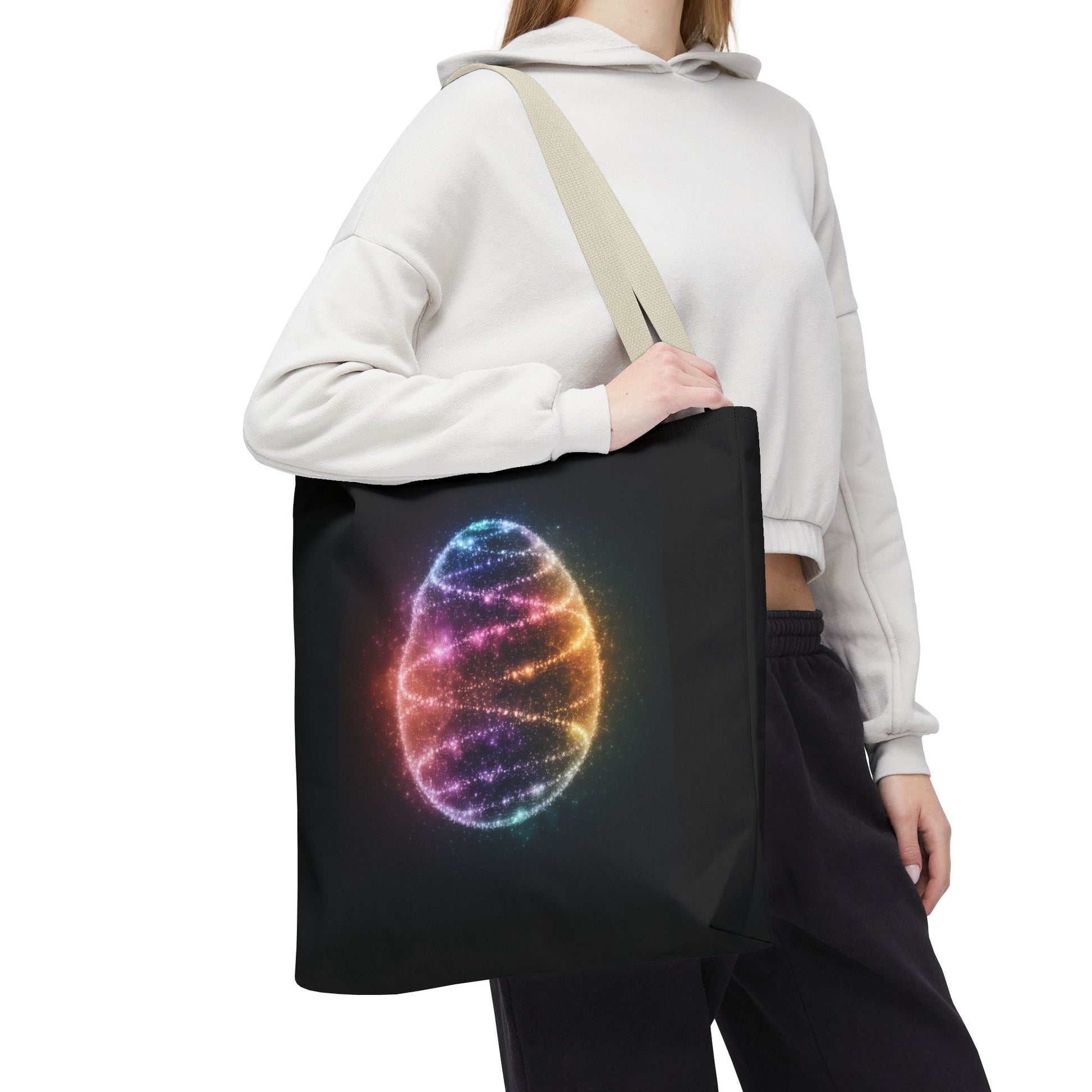 A fun tote bag featuring a bioluminescent Easter Egg design. Perfect for adding a touch of whimsy to your everyday errands or shopping trips. Ideal for those who love unique and playful accessories. Relevant for Easter celebrations and egg hunts.