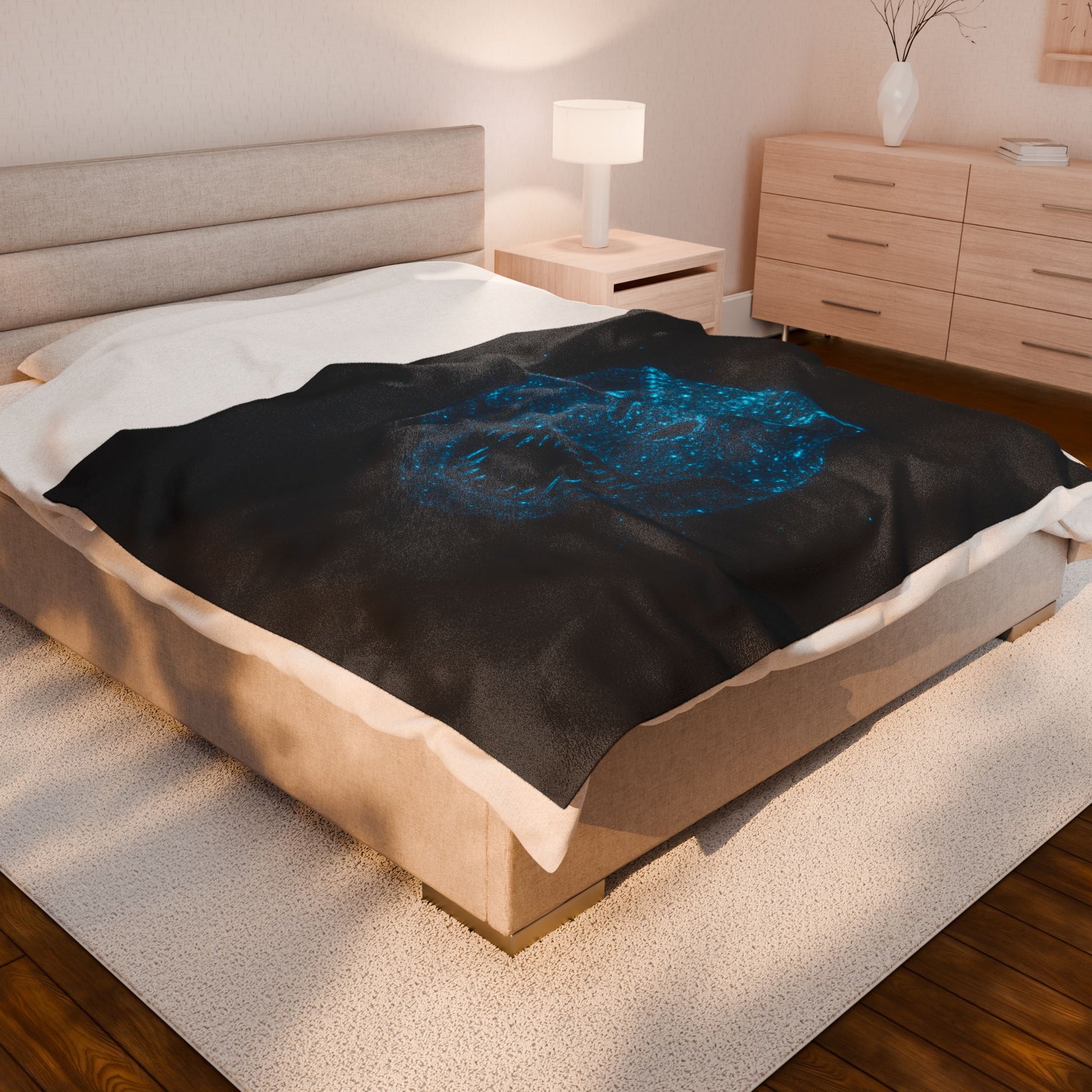 Add prehistoric power to your bedroom or lounge with this bioluminescent-style T-Rex blanket. Featuring a cosmic neon-blue dinosaur skull printed on ultra-soft fleece, this throw delivers epic dino vibes without the roar. While it doesn’t actually glow in the dark, the design looks brilliantly illuminated in bright rooms and cozy settings.