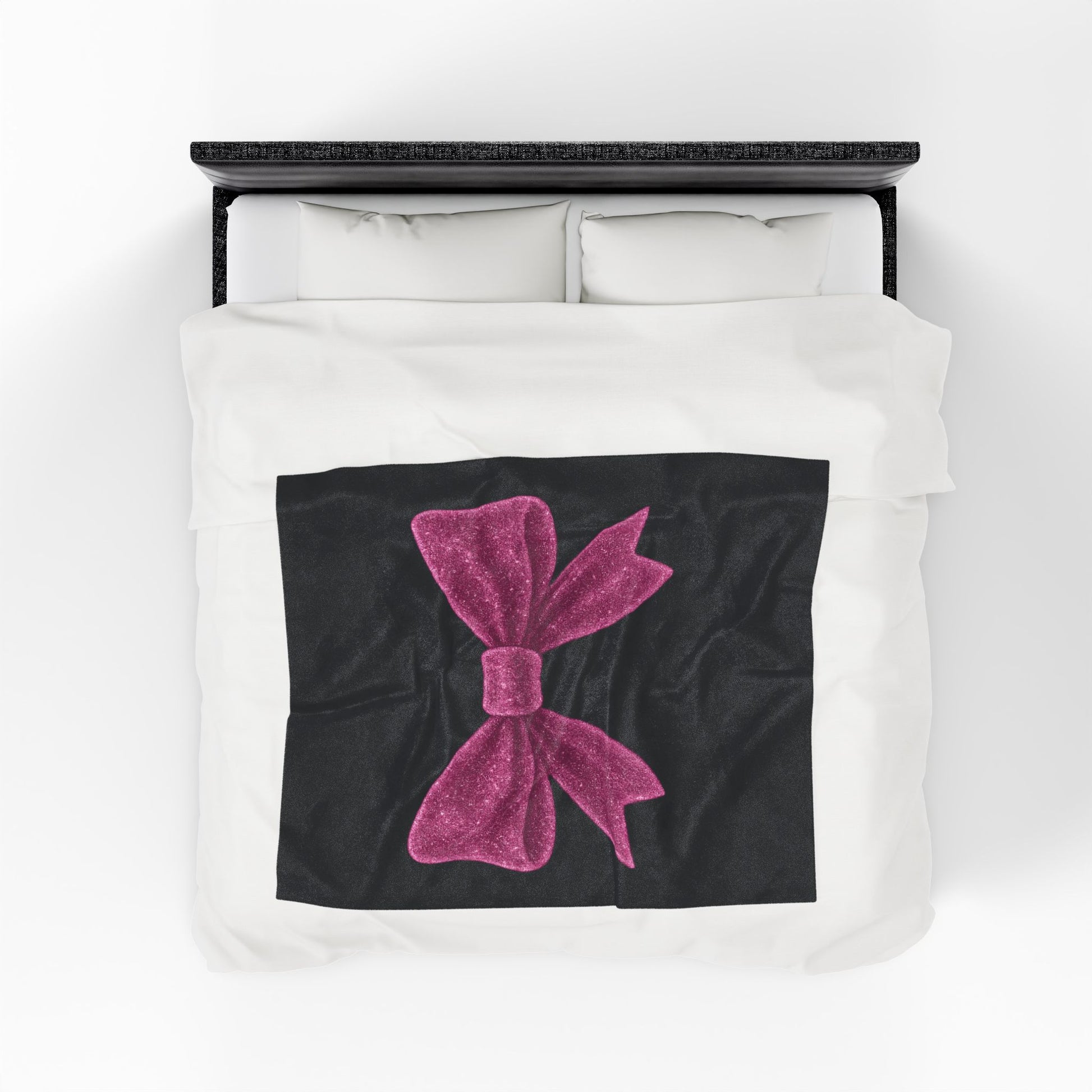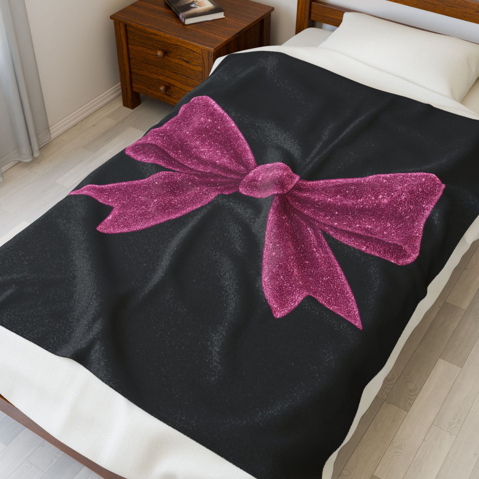 Black Throw Blanket with Glitter Pink Bow – Cozy Soft Bed Cover – Girly Glam Room Decor – Teen Girl Gift – Elegant Bedding Accent