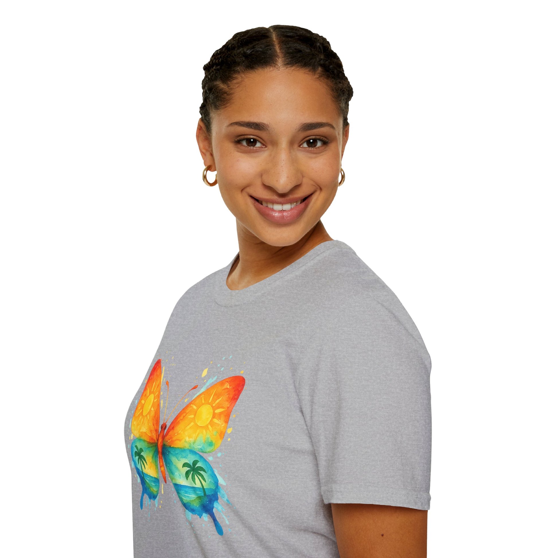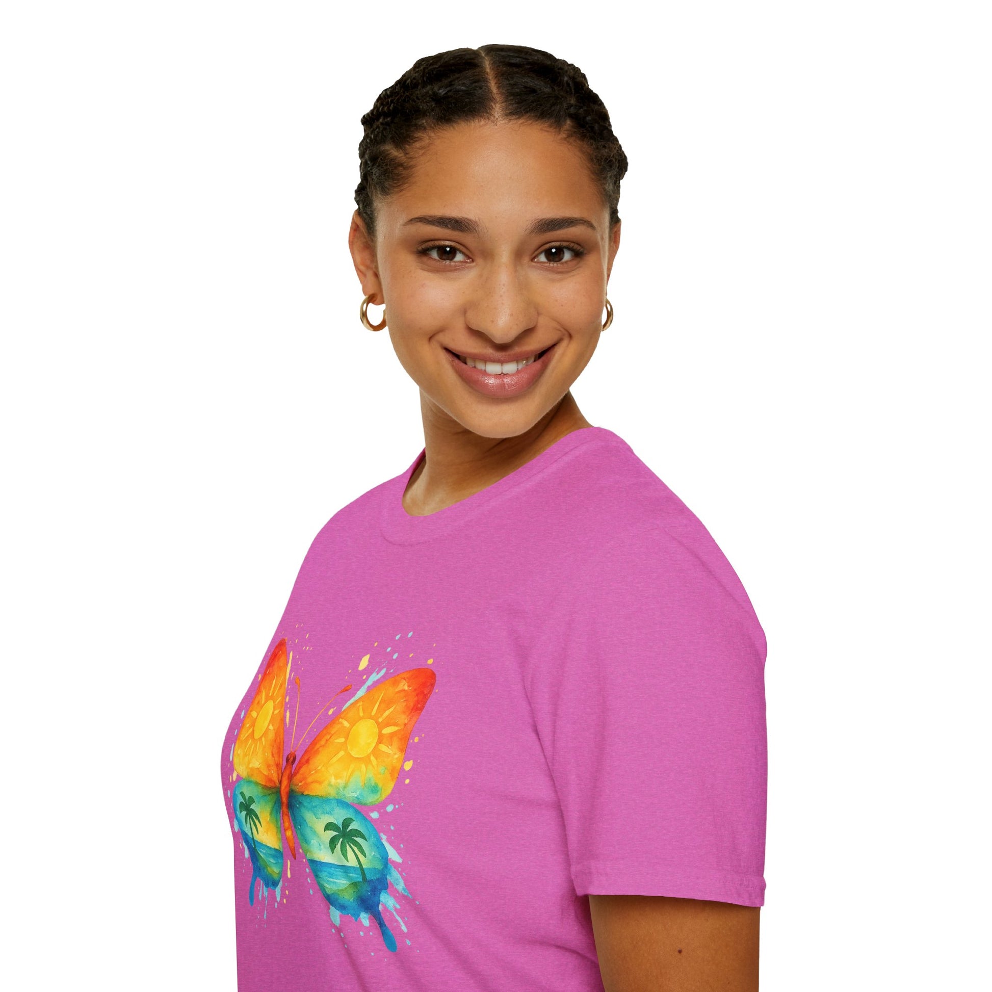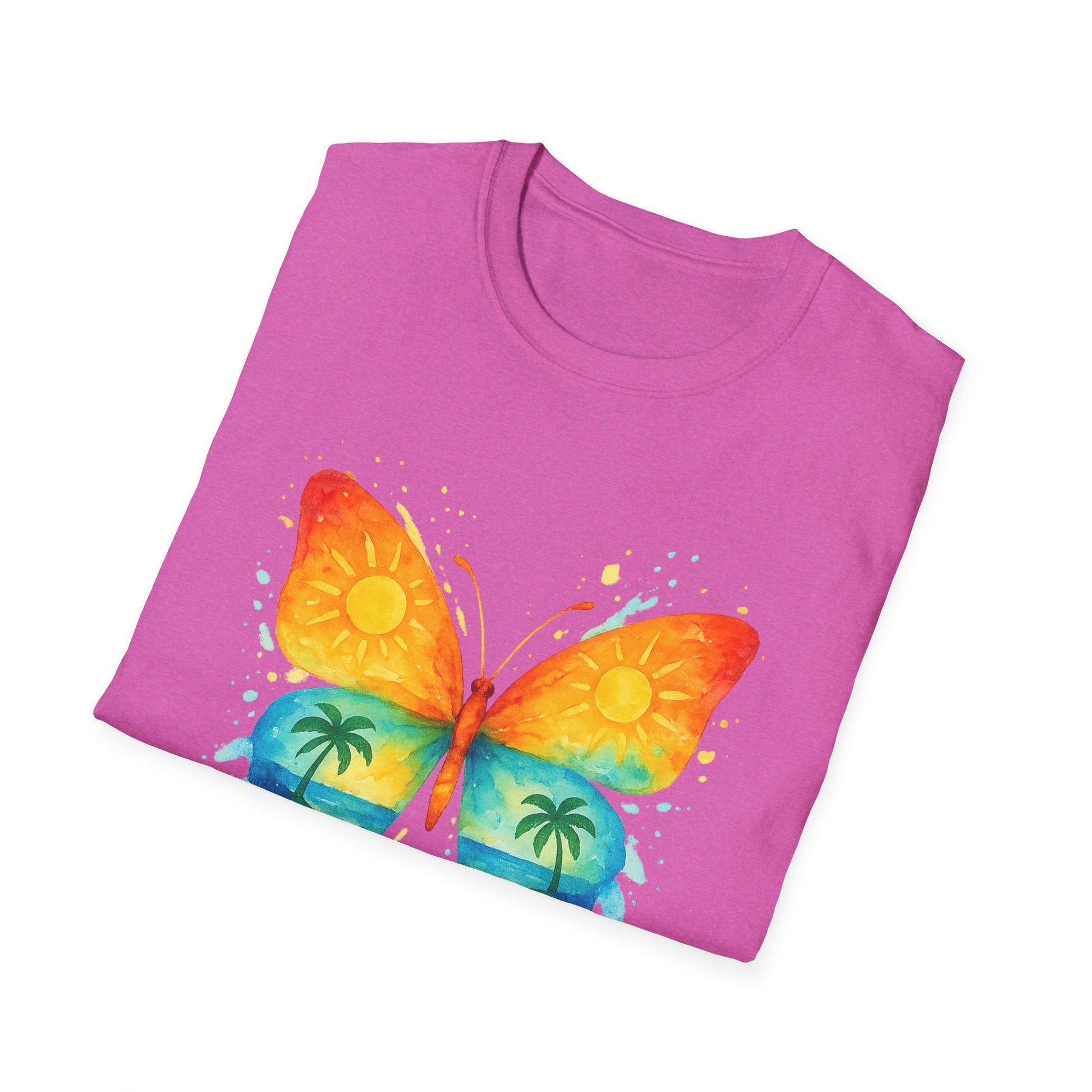 Butterfly Sunset Beach Tee - Ocean & Palm Watercolor Butterfly T-Shirt, Coastal Boho Graphic, Nature Lover Gift, Unisex Casual Tee