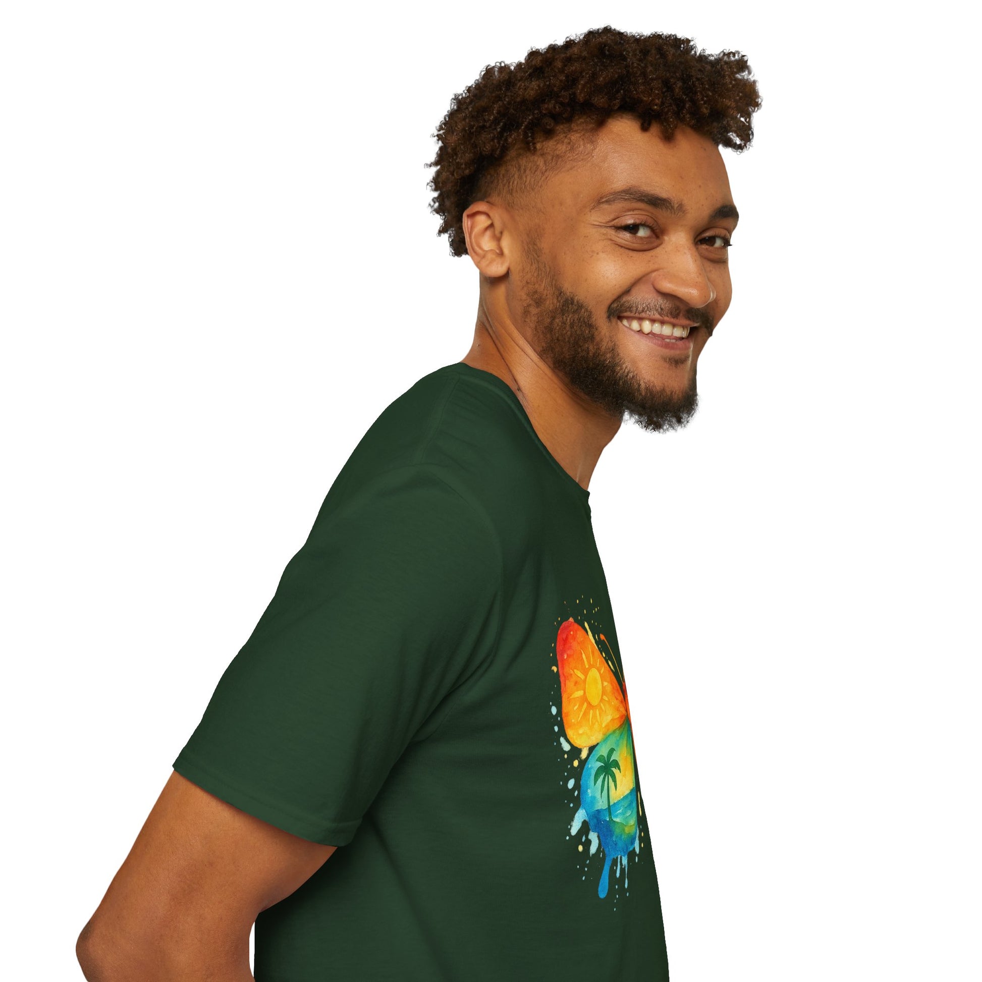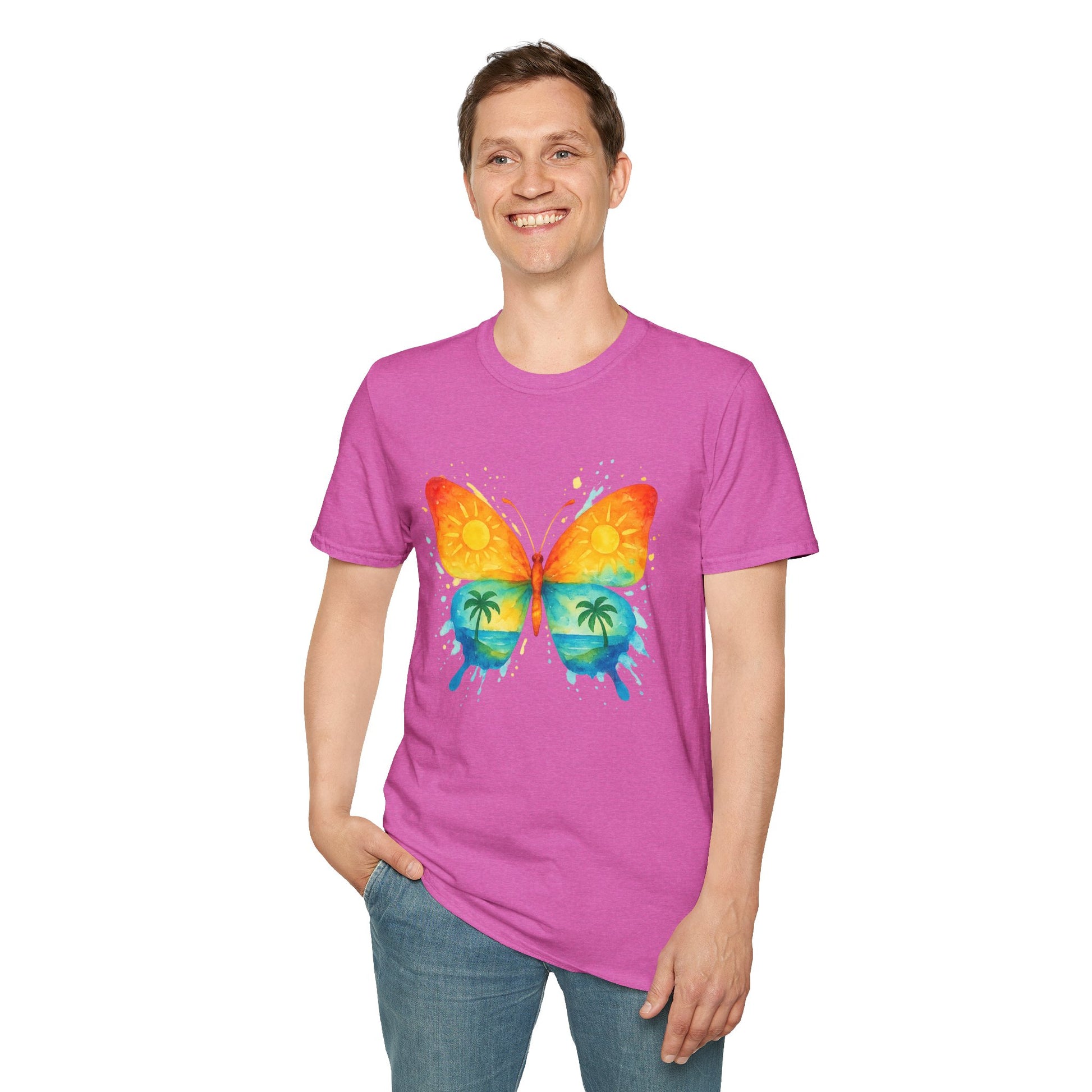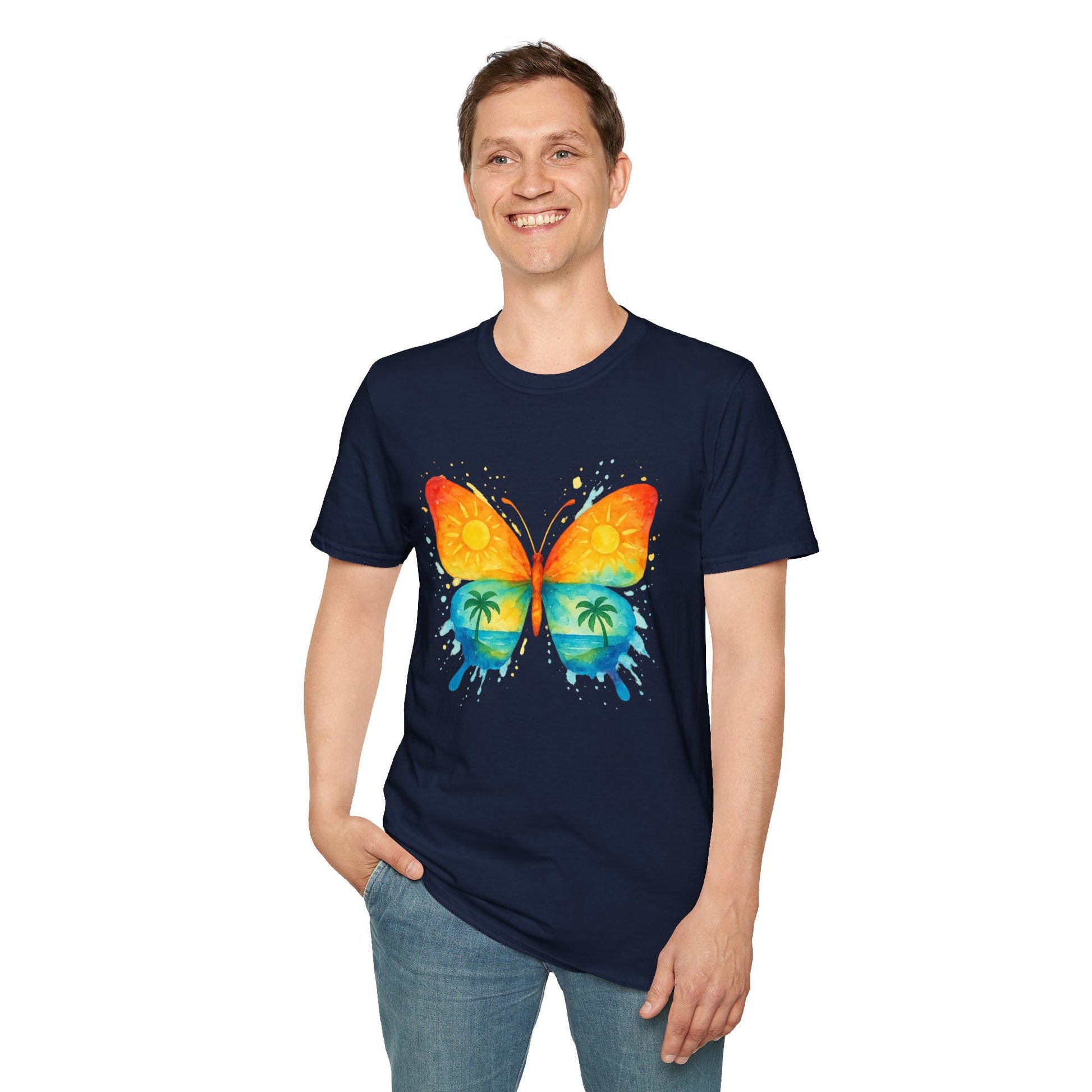 Butterfly Sunset Beach Tee - Ocean & Palm Watercolor Butterfly T-Shirt, Coastal Boho Graphic, Nature Lover Gift, Unisex Casual Tee