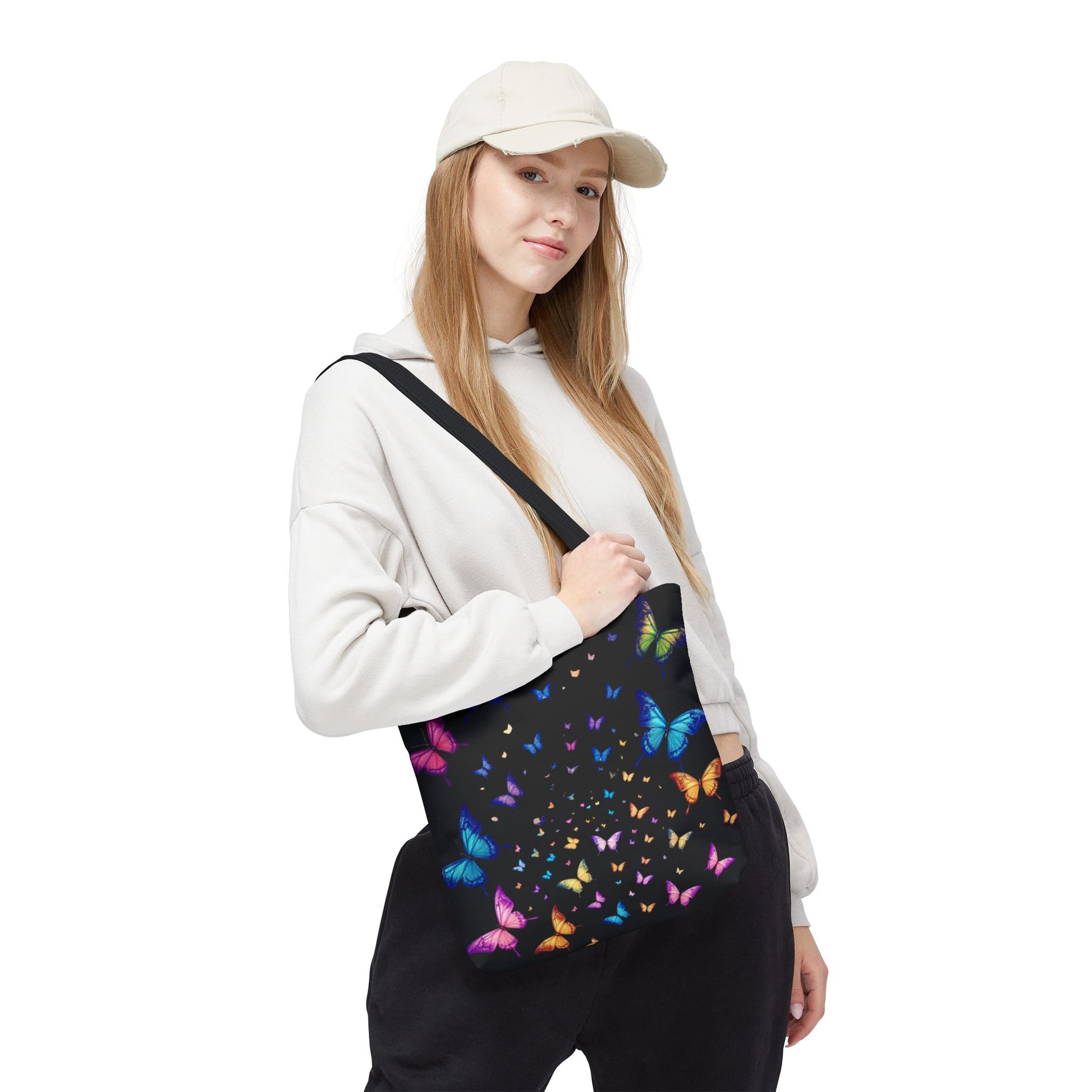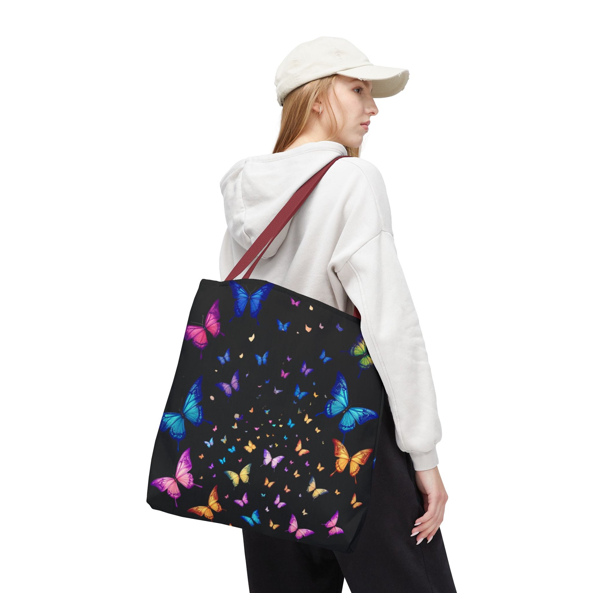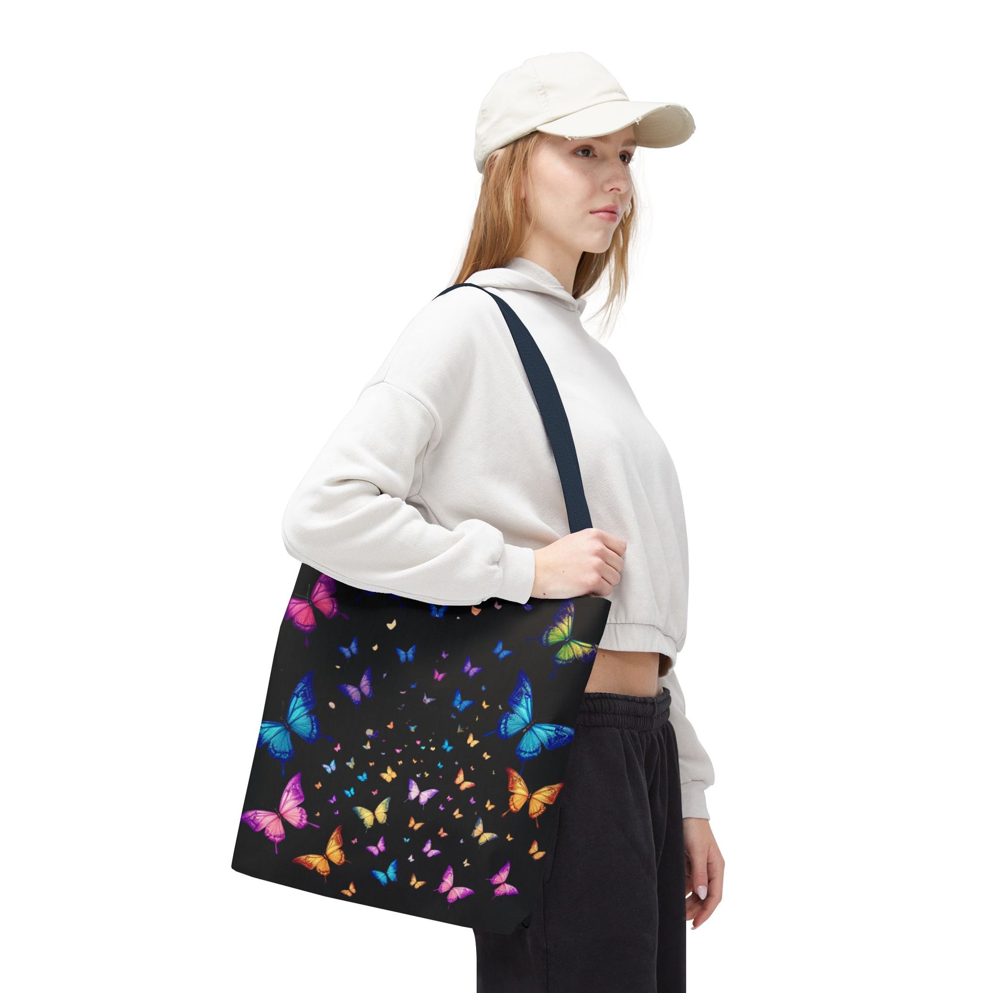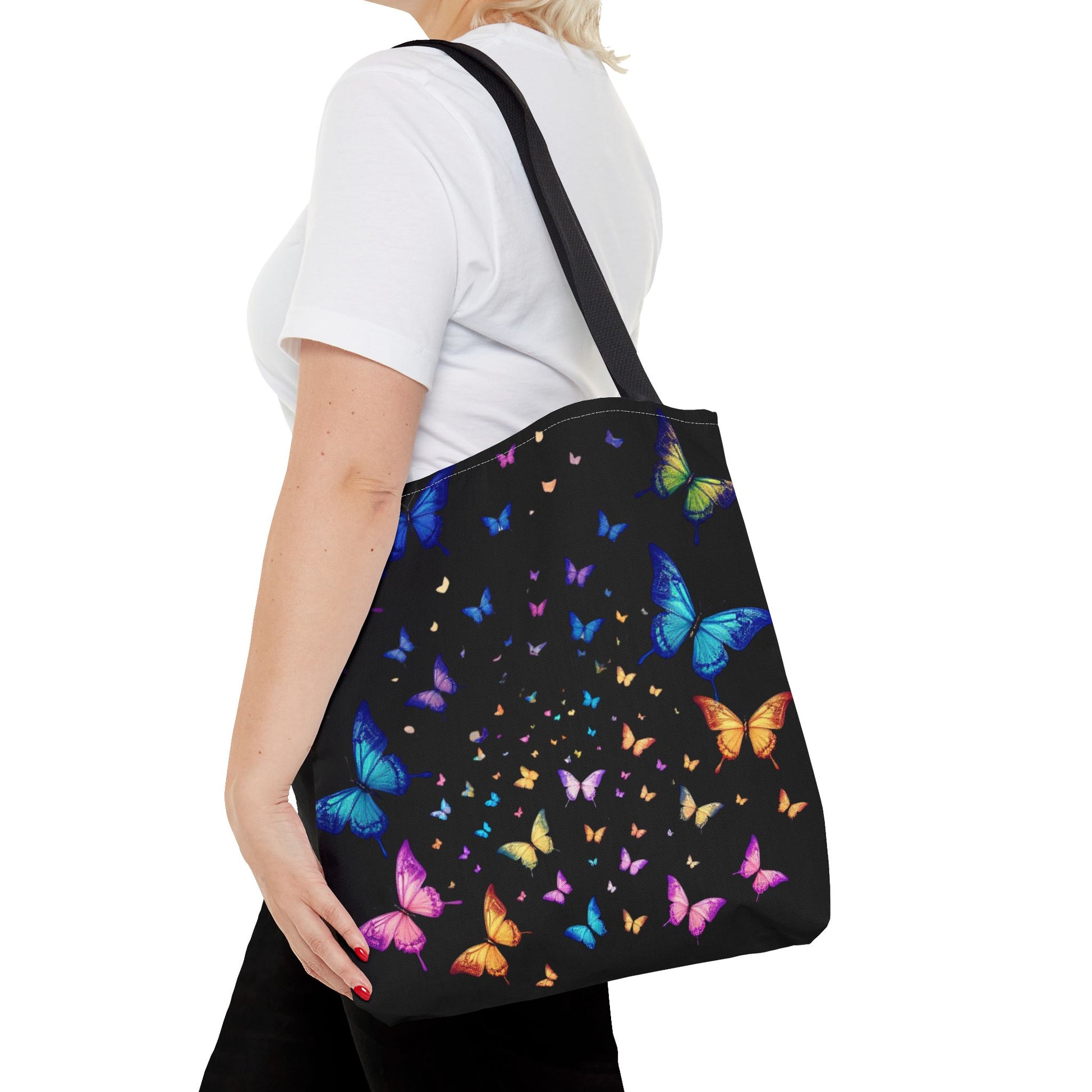 Let your style take flight with this vibrant butterfly swarm tote bag, featuring a swirl of neon-colored butterflies on a deep black canvas. Designed to stand out, this tote is equal parts whimsical, bold, and practical. With its rich rainbow palette and dreamy design, it’s perfect for free spirits, nature lovers, and anyone who believes in a little everyday magic.