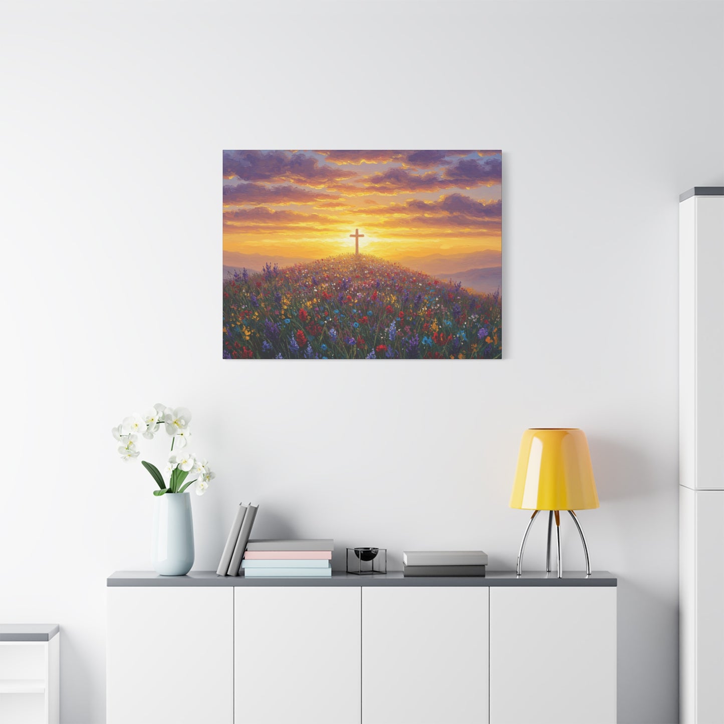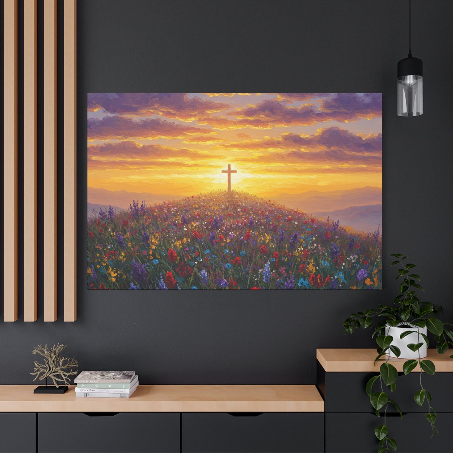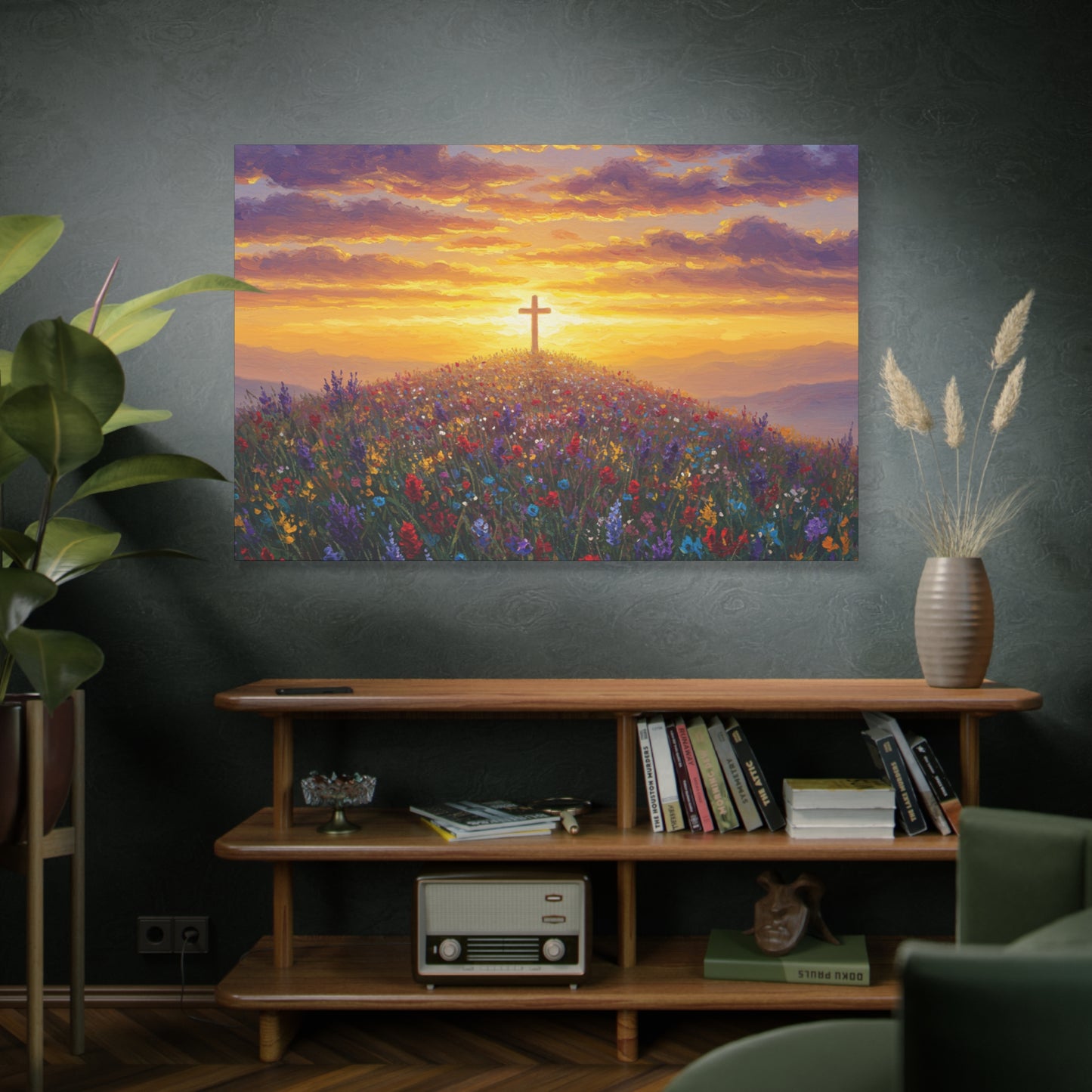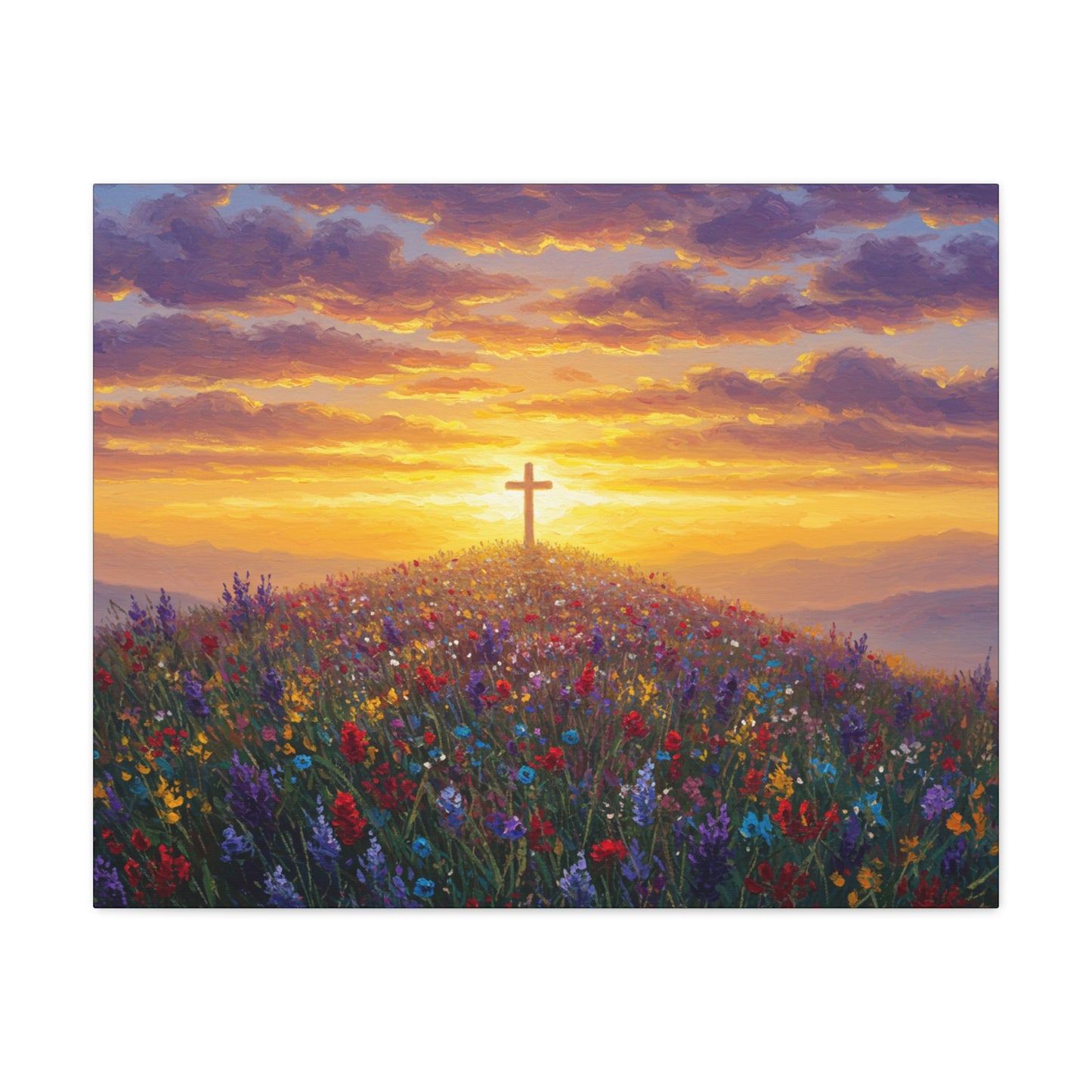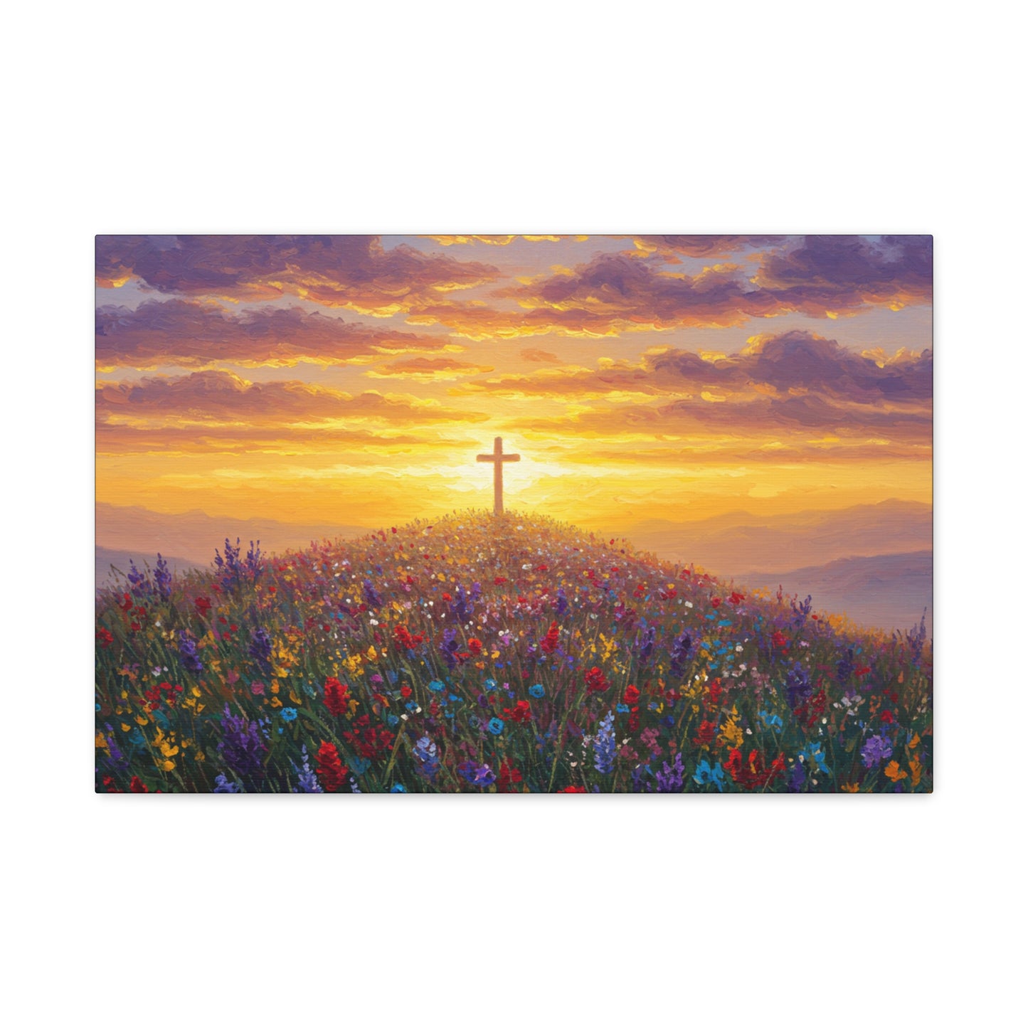 A fun painting of a cross on a hill in the style of Monet, perfect for adding a touch of art to any space. This canvas print exudes a classic and artistic vibe, suitable for art enthusiasts and those looking to decorate their home with unique pieces. Ideal for religious holidays or occasions.
