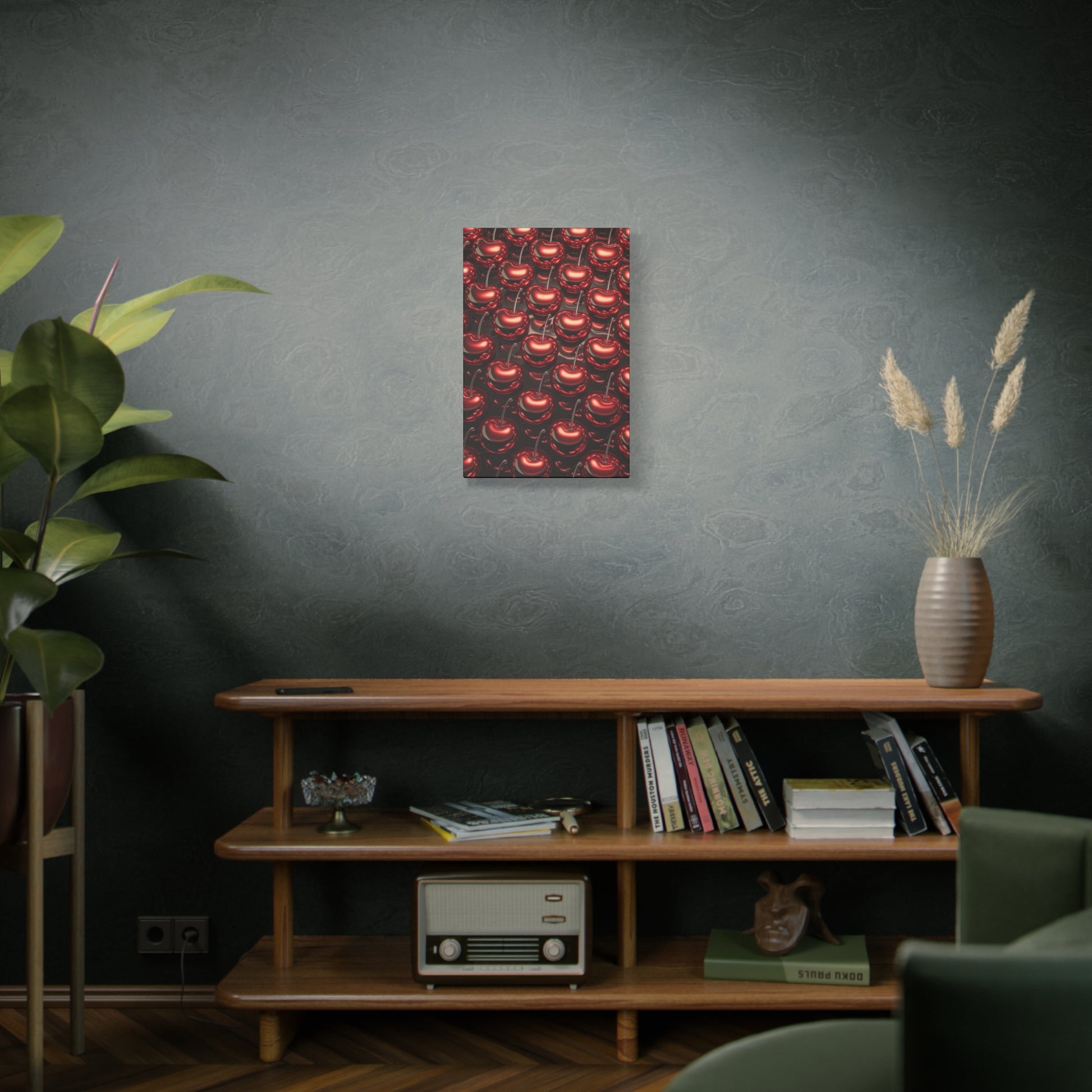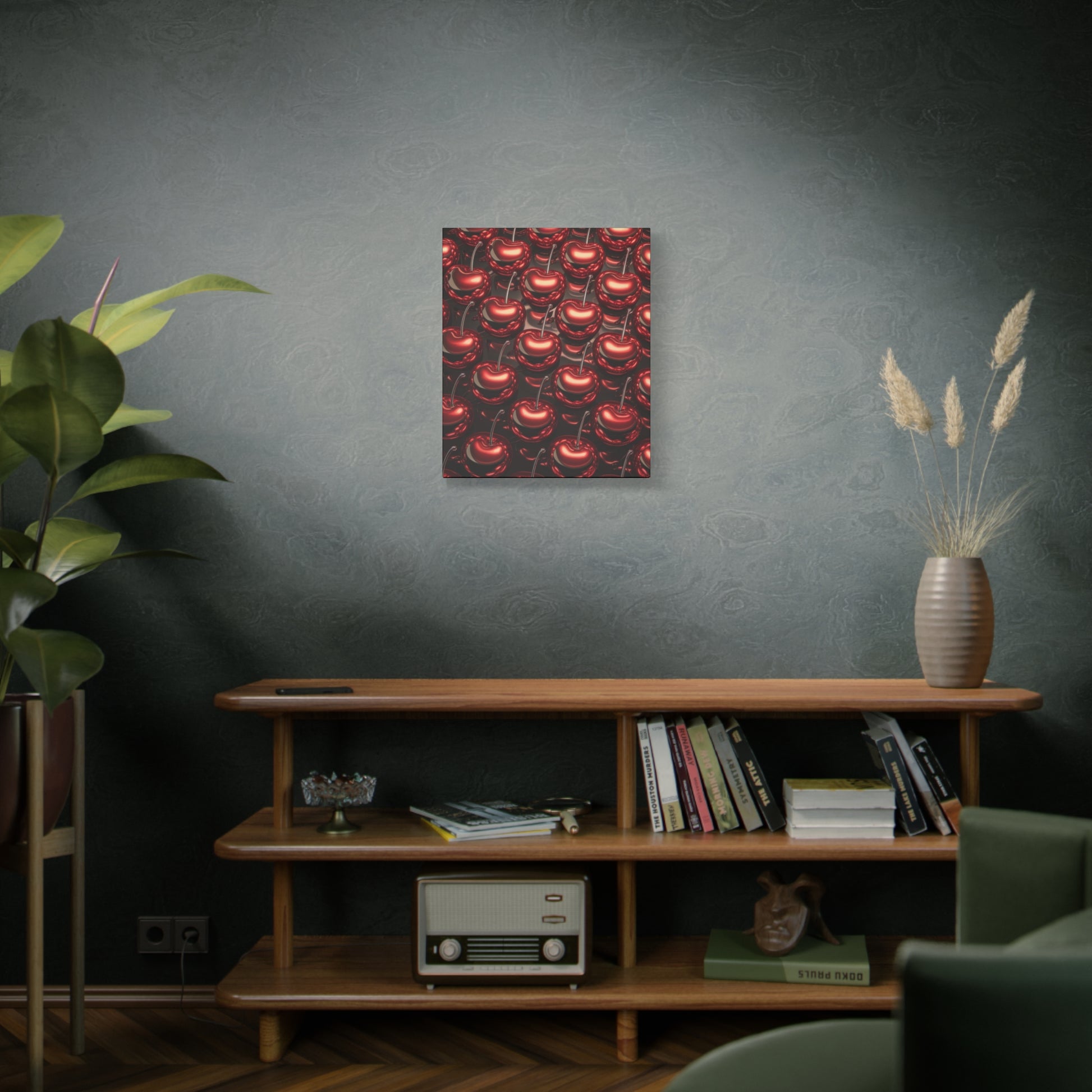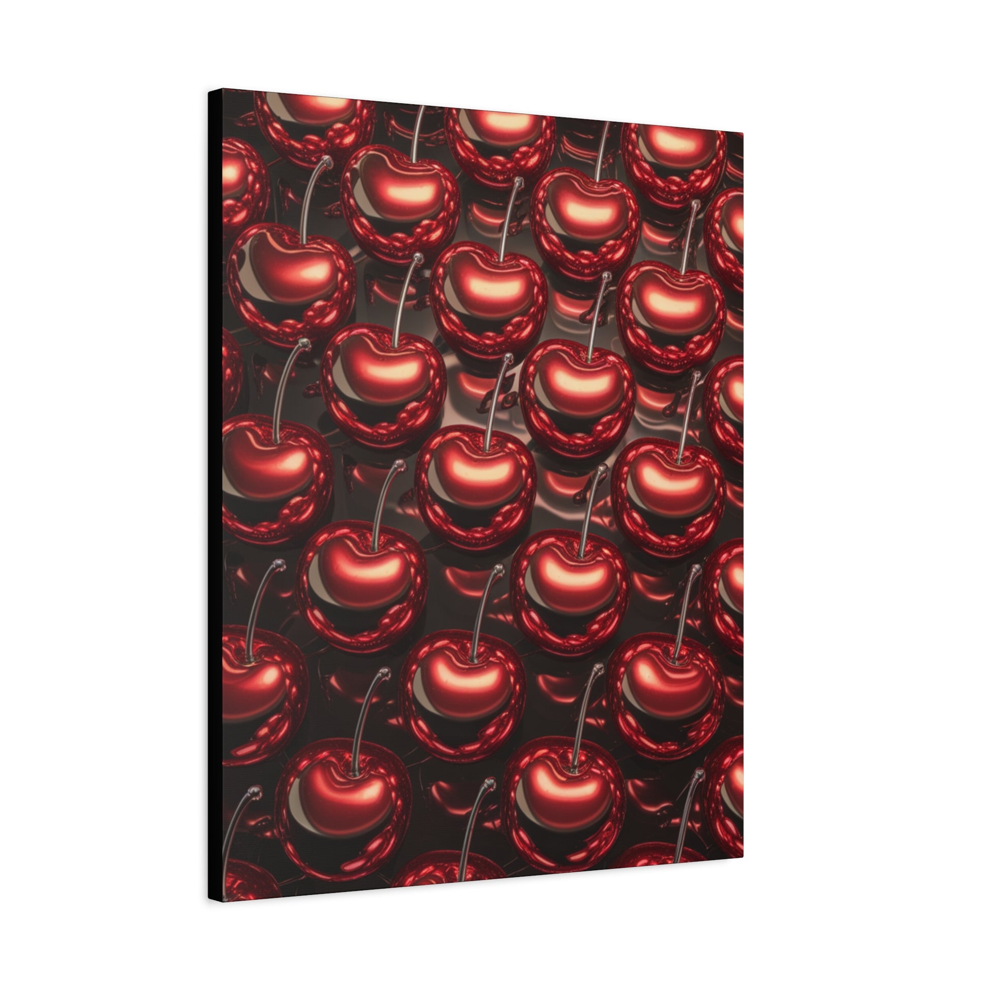 A fun canvas with colorful shiny cherries printed on it, adding a cheerful and vibrant touch to any room. Perfect for those looking to add a pop of color to their home decor or for fruit lovers. Ideal for kitchen, dining room, or living room decor. Great for summer decorating, picnics, and fruit-themed parties.