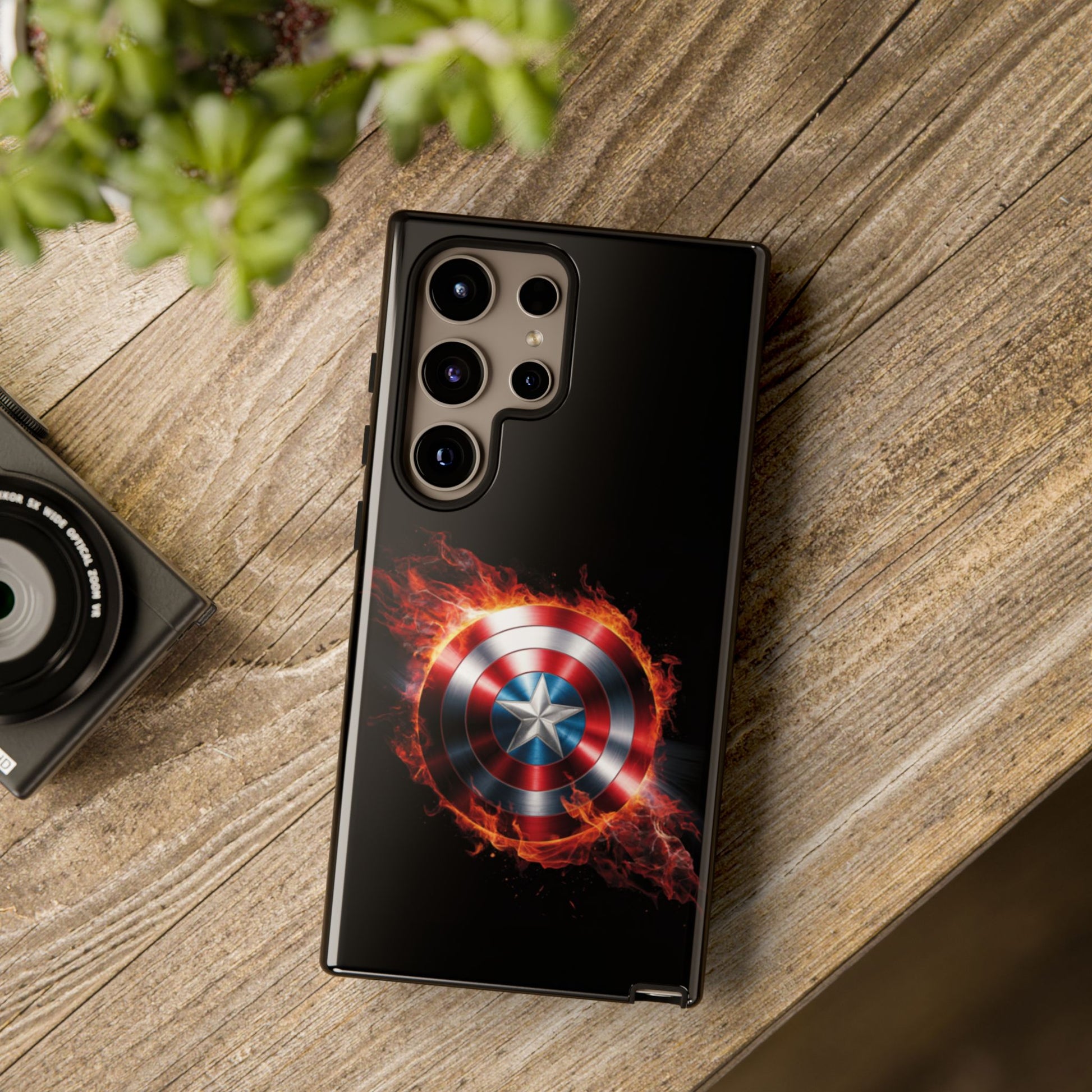 A fun Samsung Galaxy phone case featuring the Shield of Captain America engulfed in Flames. This phone case is perfect for Marvel fans who want to protect their device with style. Ideal for birthdays, holidays, and special occasions.