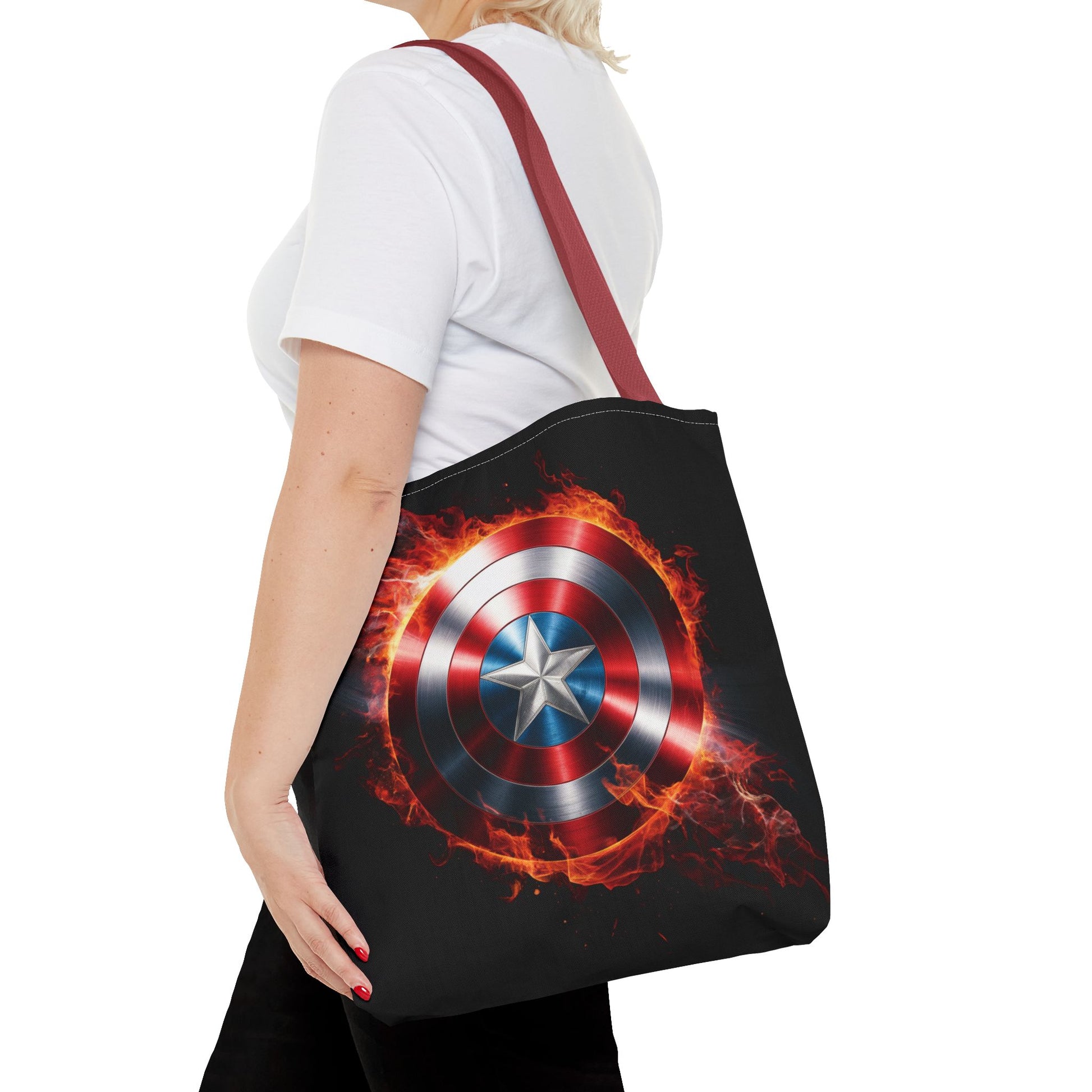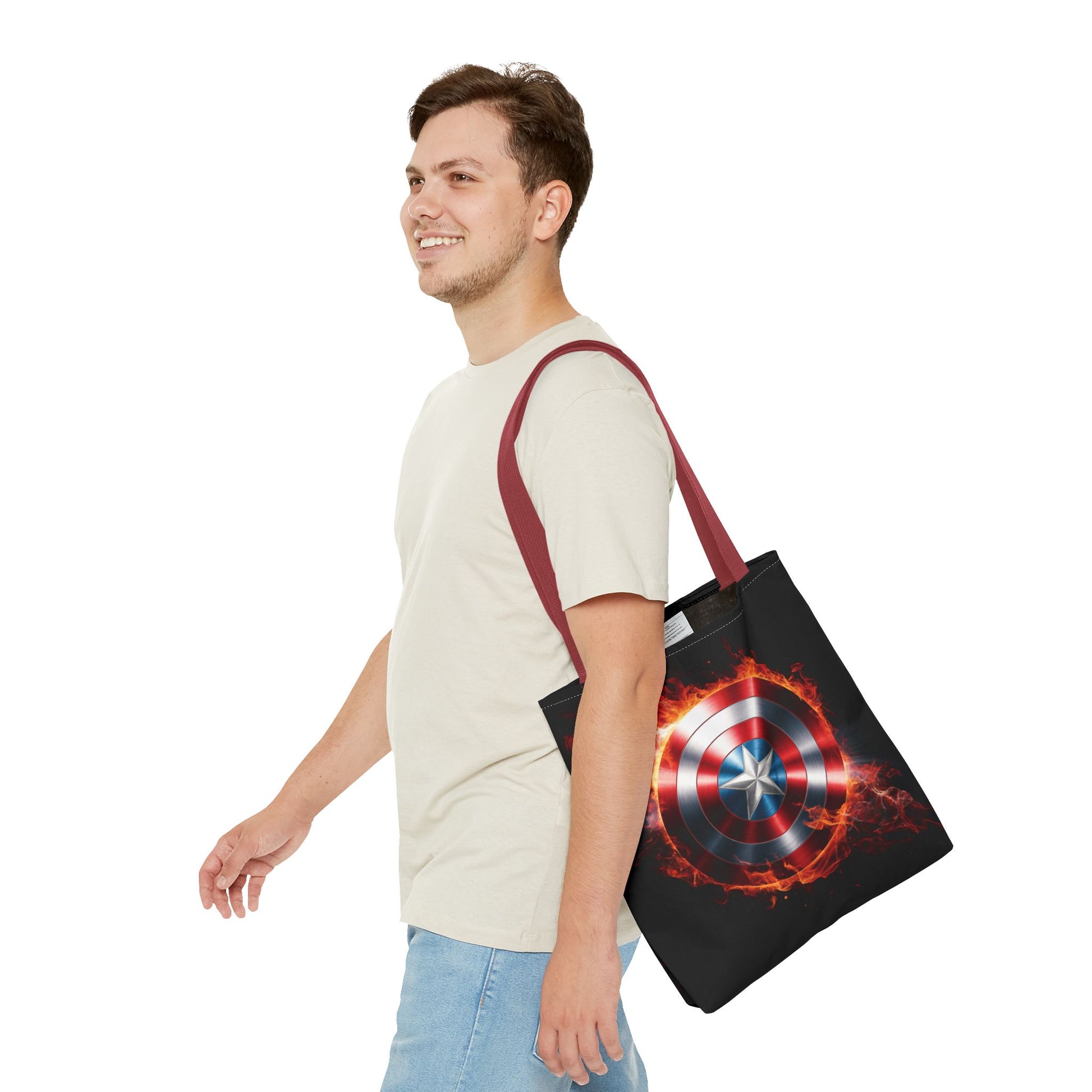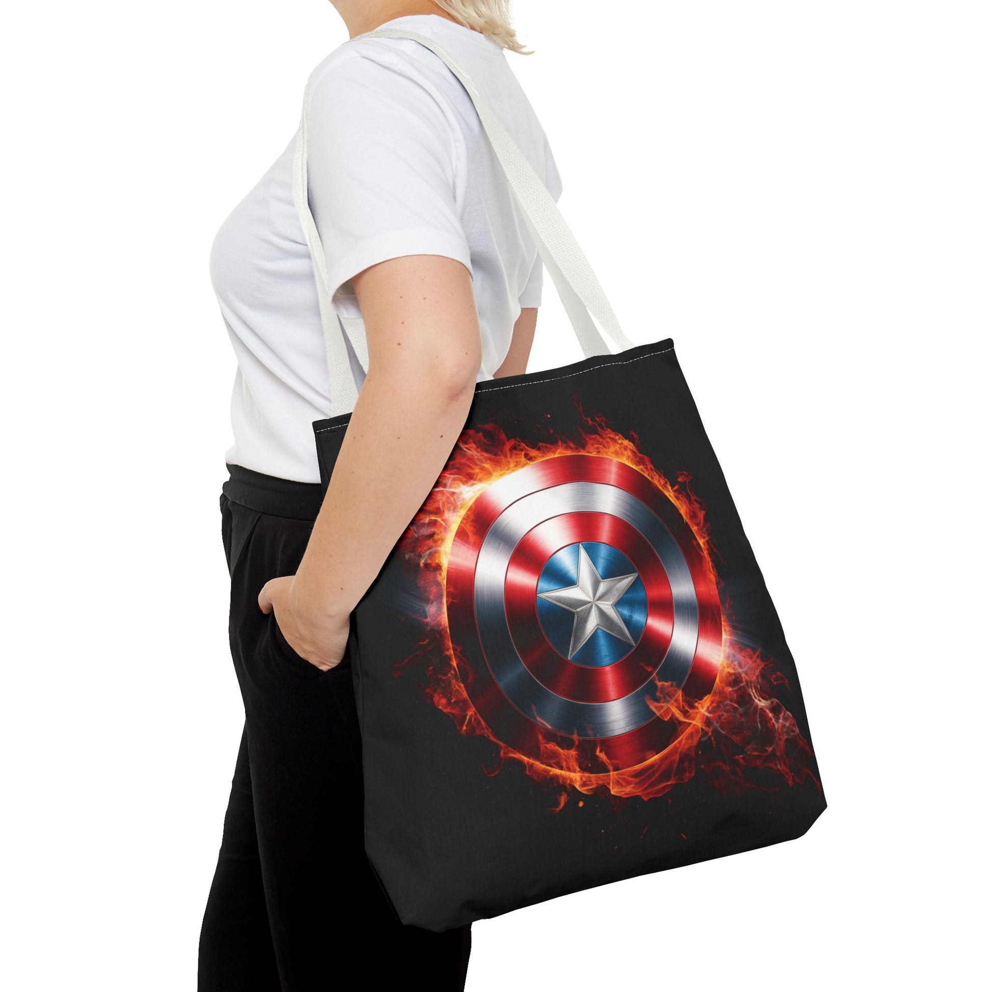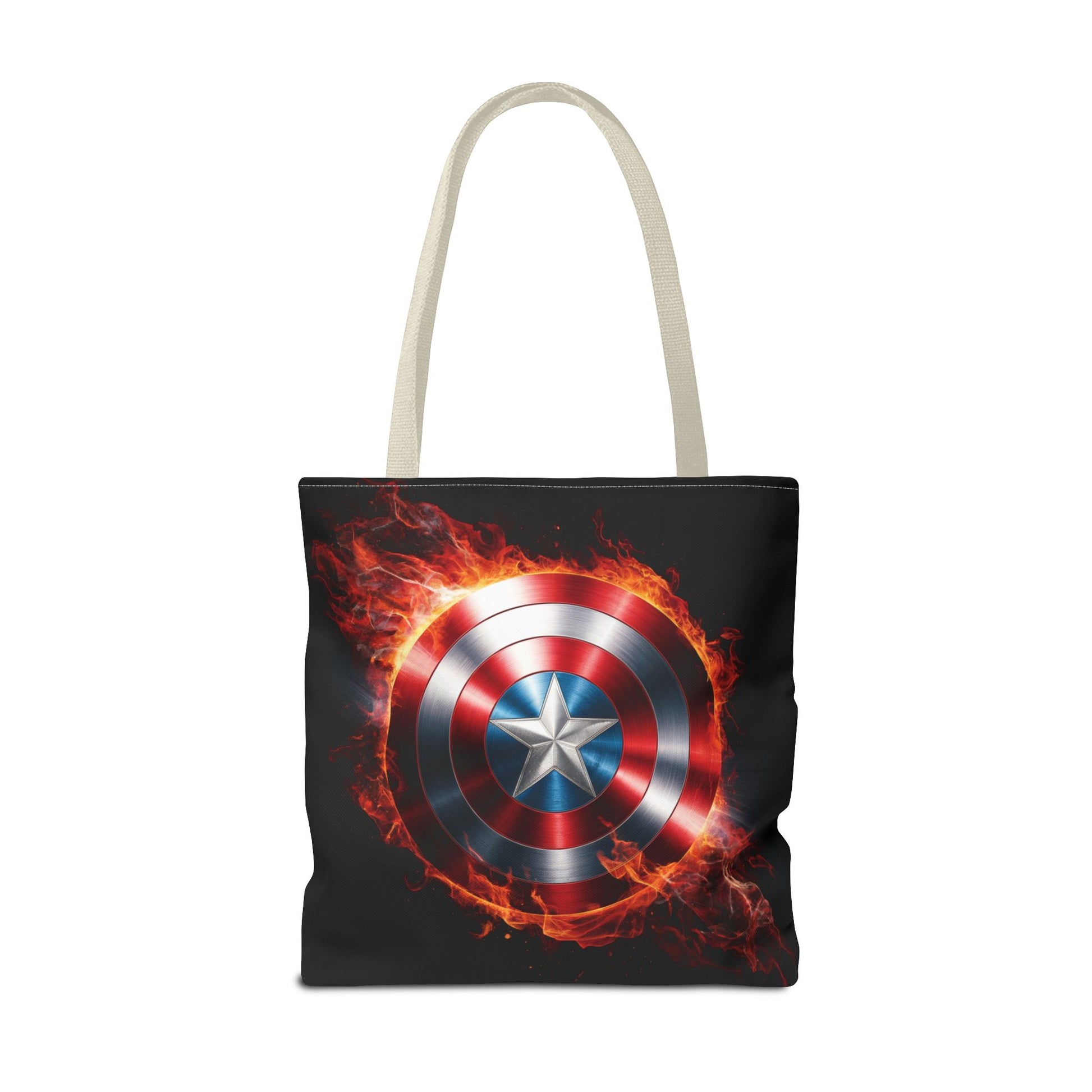A fun tote bag with the shield of Captain America engulfed in flames. This tote bag is perfect for superhero fans, comic book lovers, and anyone looking to add a pop of color to their outfit. Great for everyday use, this durable tote bag is ideal for carrying groceries, books, and essentials.