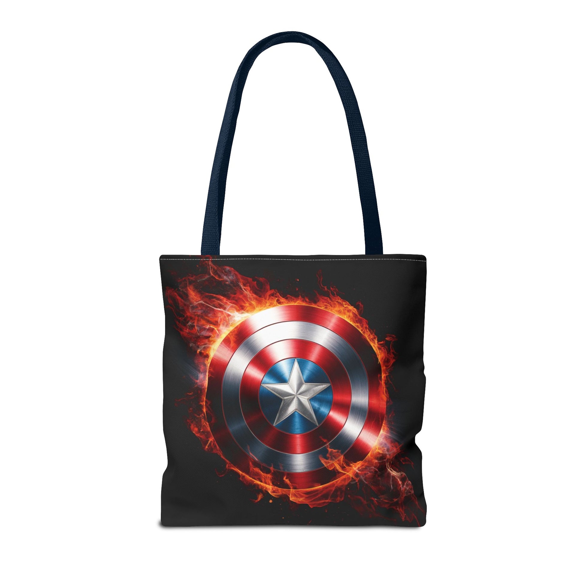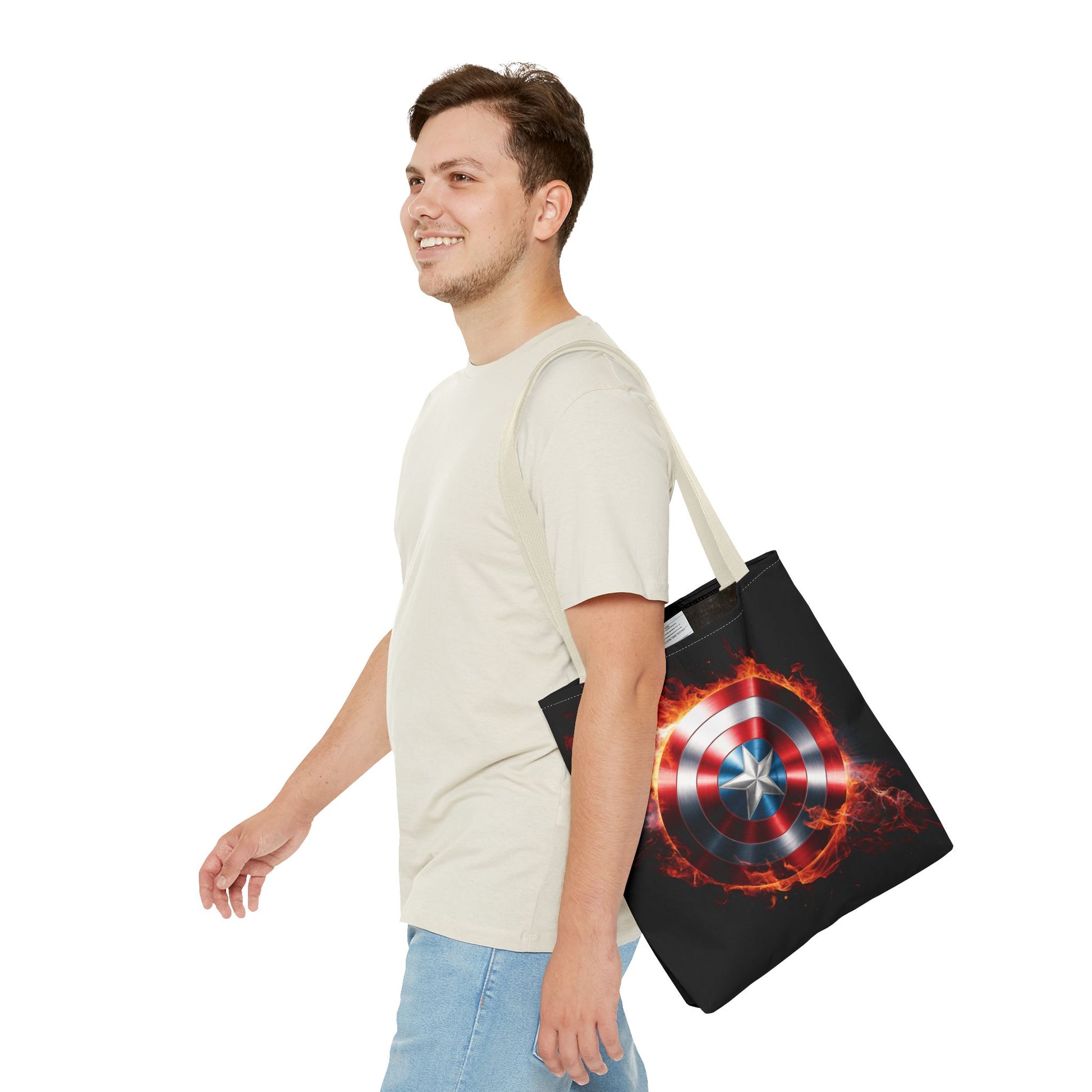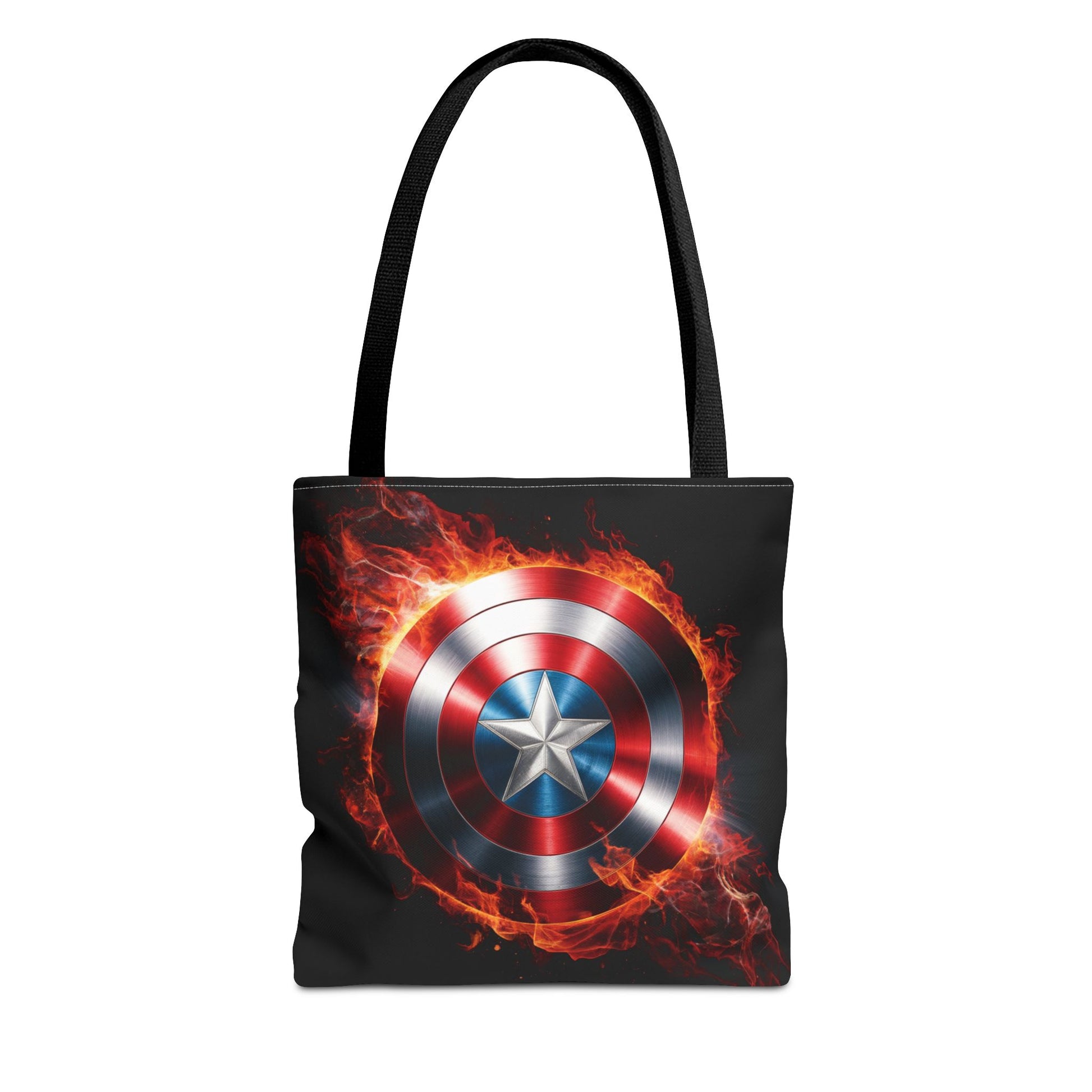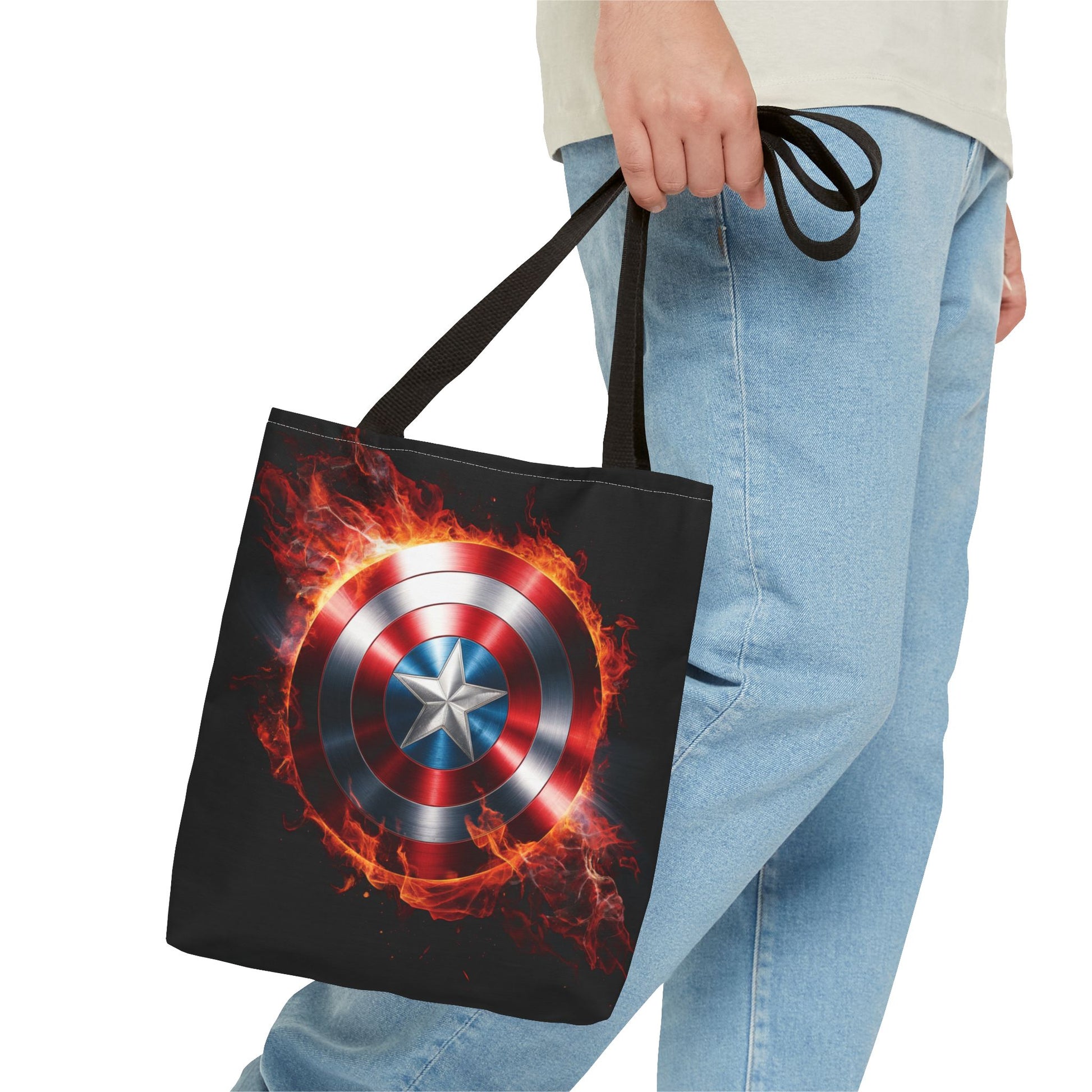 A fun tote bag with the shield of Captain America engulfed in flames. This tote bag is perfect for superhero fans, comic book lovers, and anyone looking to add a pop of color to their outfit. Great for everyday use, this durable tote bag is ideal for carrying groceries, books, and essentials.