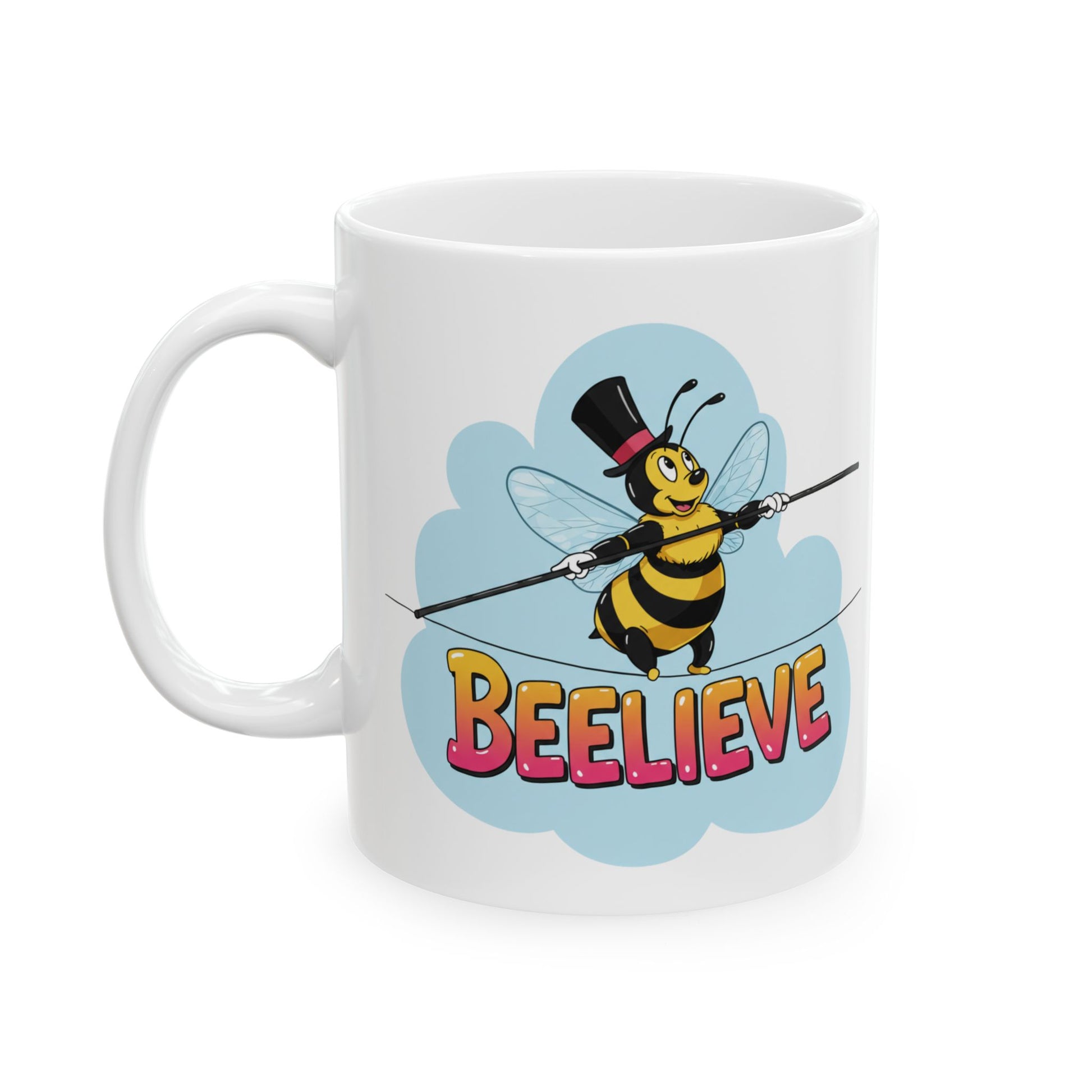 This ceramic mug features a fun pun with a bee crossing a tightrope that states "Beelieve". It gives a playful and whimsical vibe, perfect for bee enthusiasts or anyone who loves a good pun. Ideal for enjoying your favorite beverage at home or in the office, this mug is microwave and dishwasher-safe. It makes a great gift for birthdays, holidays, or just because.