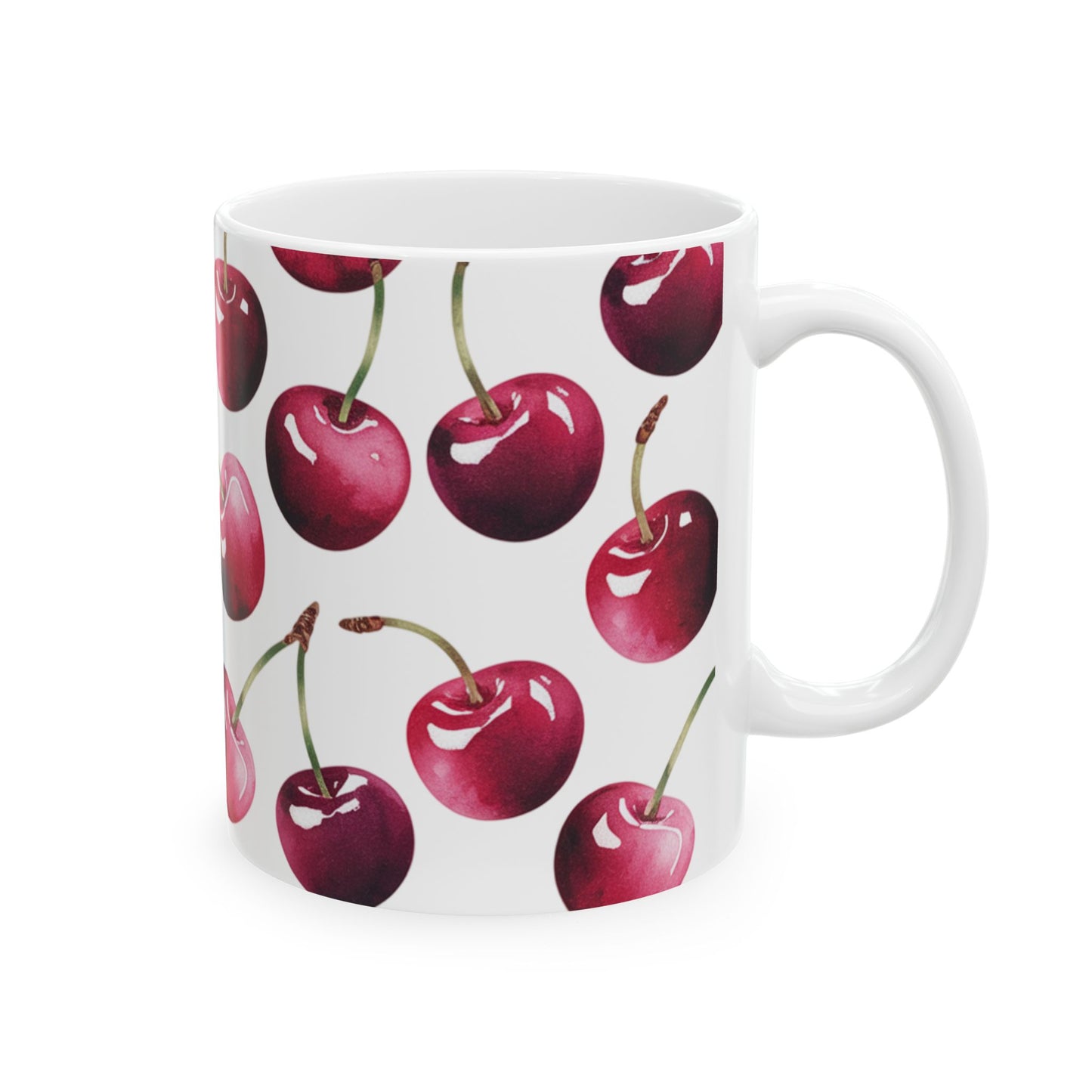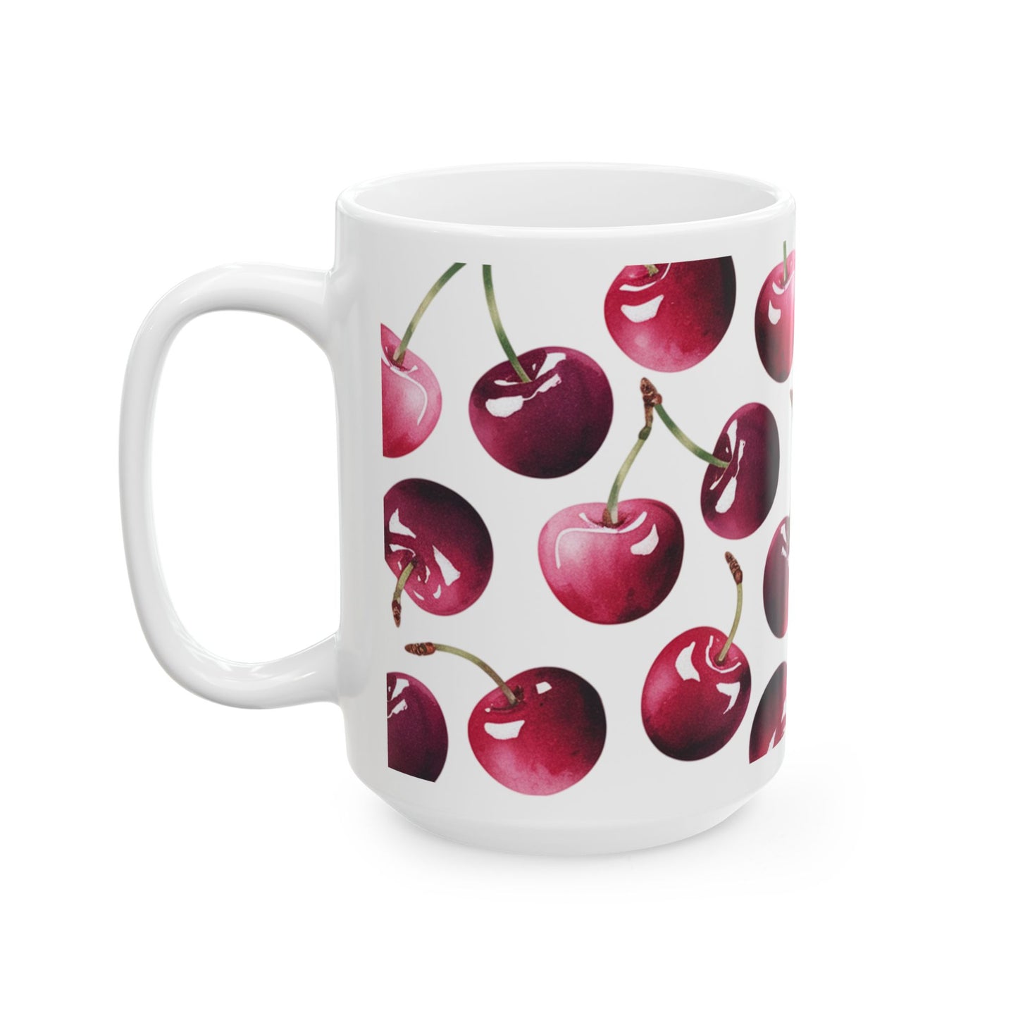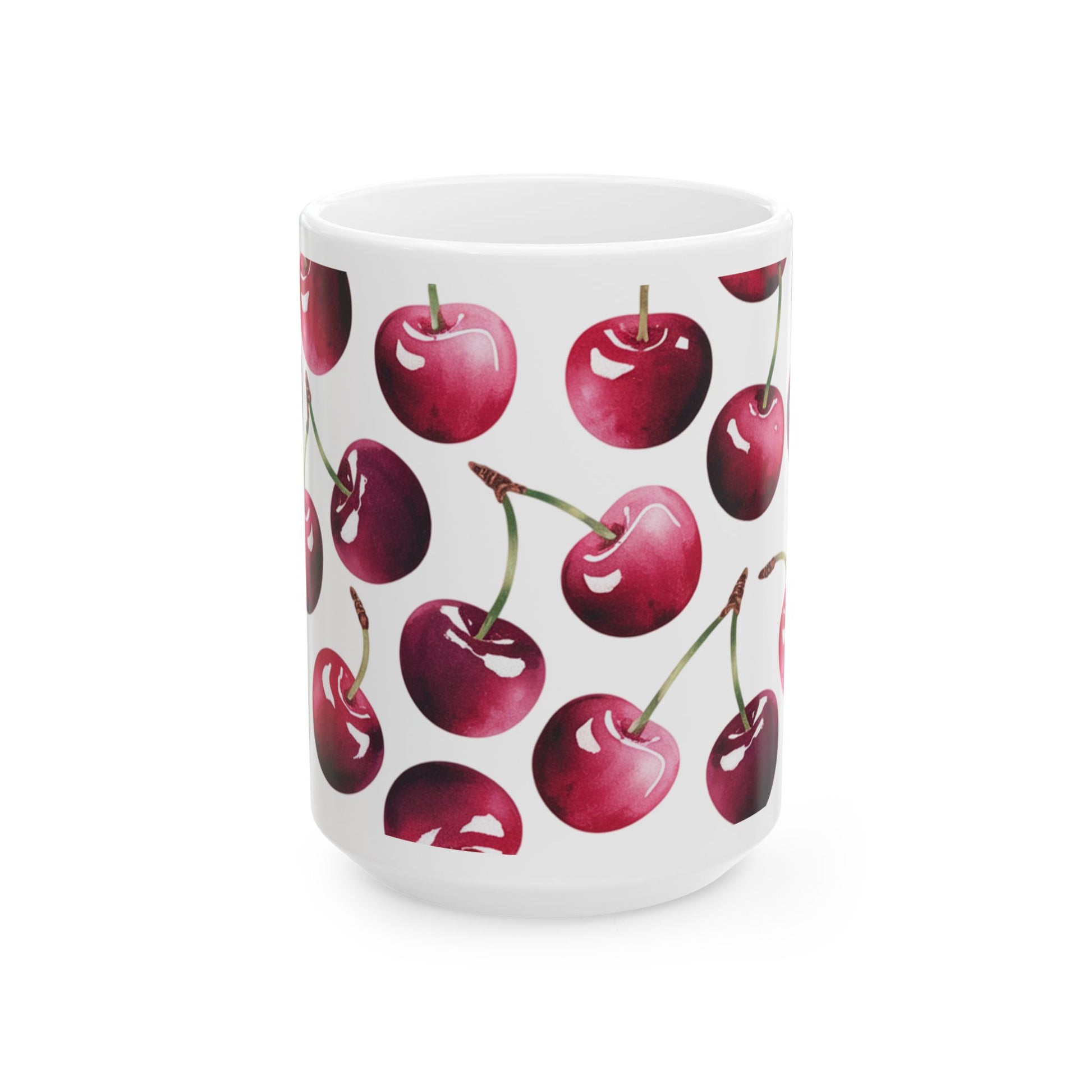 Add a sweet dash of vintage charm to your everyday sips with this Cherry Pattern Ceramic Coffee Mug, featuring bold, glossy red cherries against a crisp white background in both 11oz and 15oz sizes.