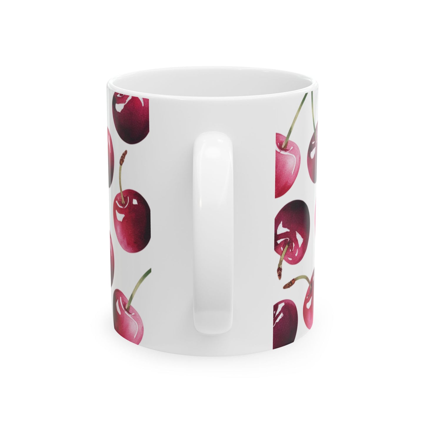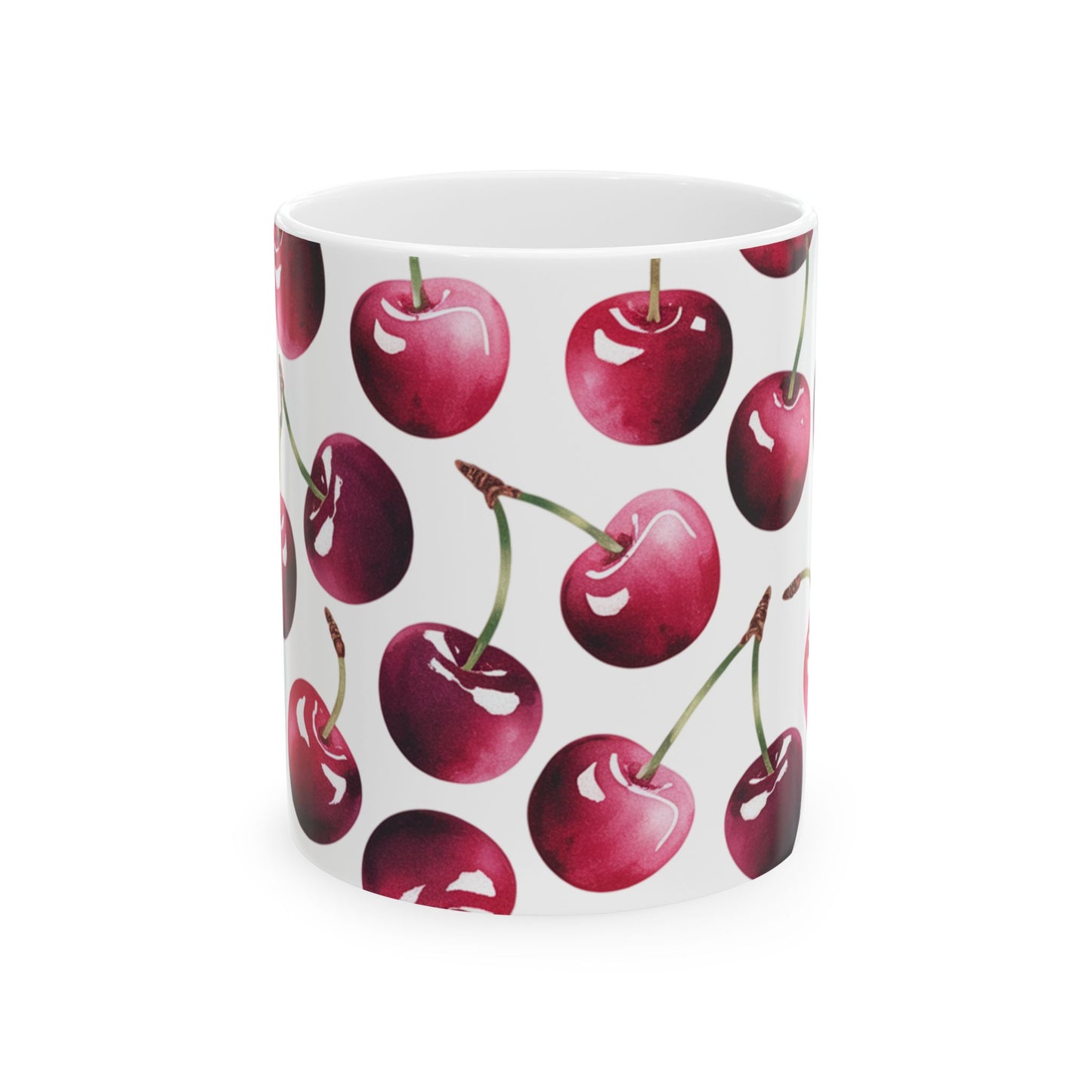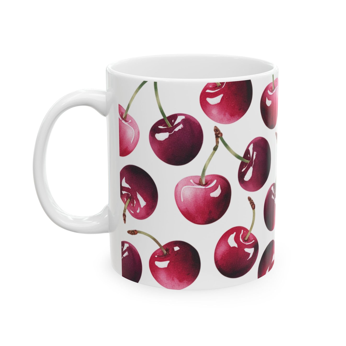 Add a sweet dash of vintage charm to your everyday sips with this Cherry Pattern Ceramic Coffee Mug, featuring bold, glossy red cherries against a crisp white background in both 11oz and 15oz sizes.