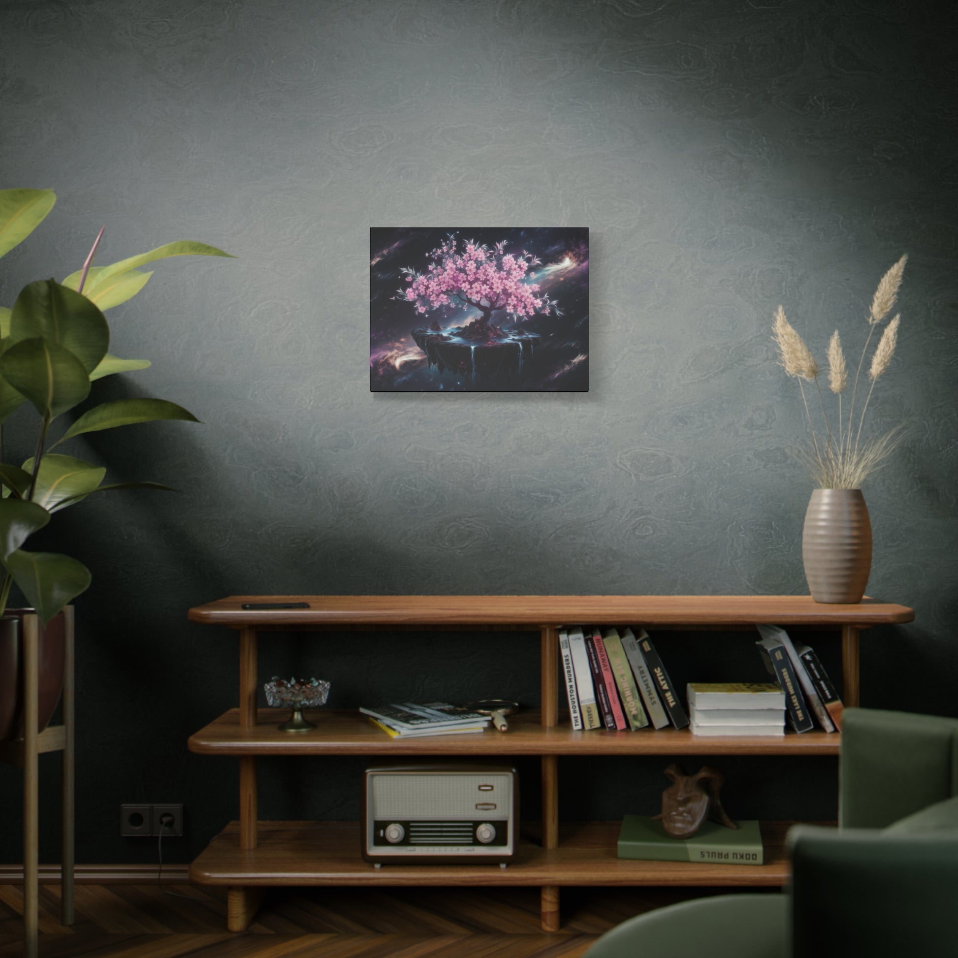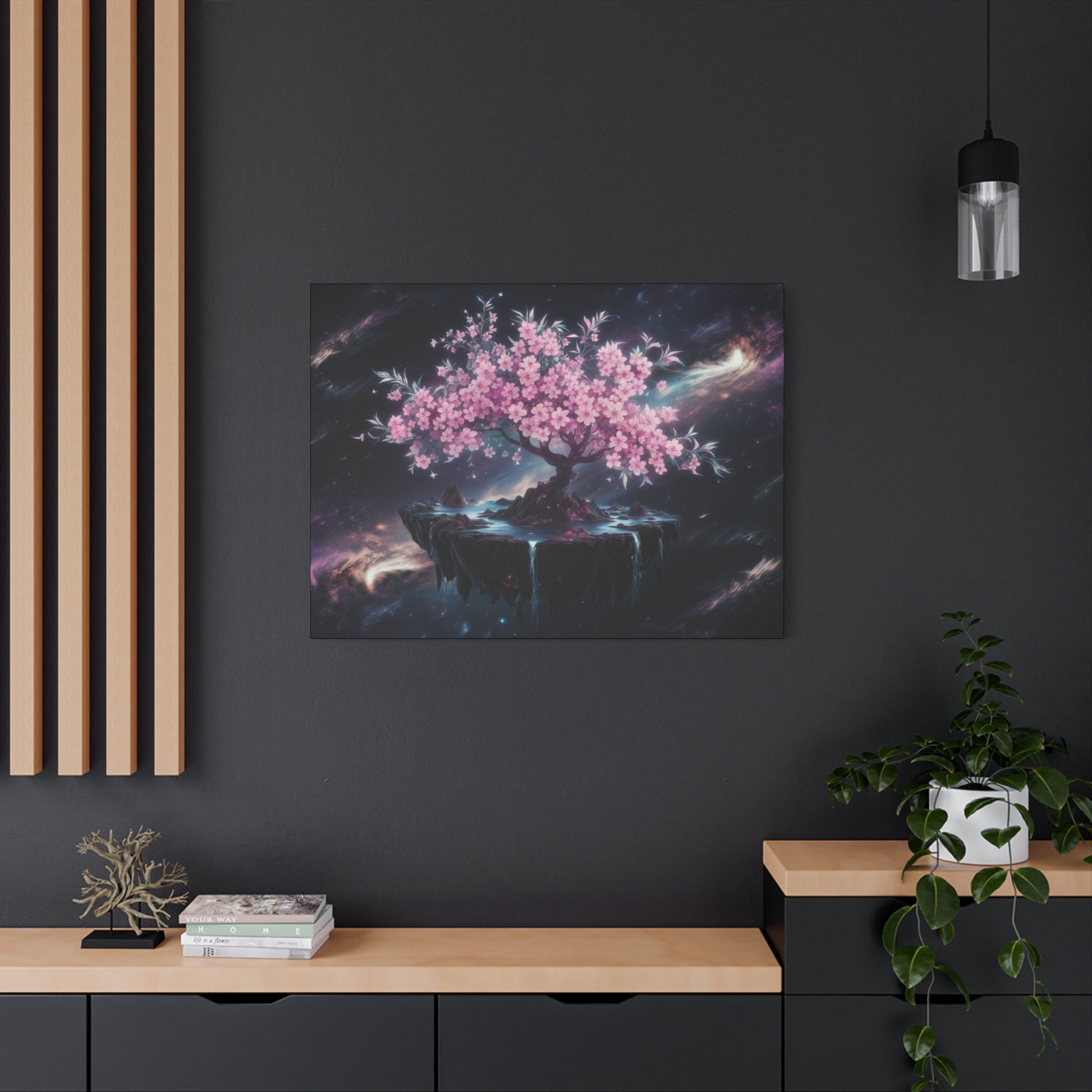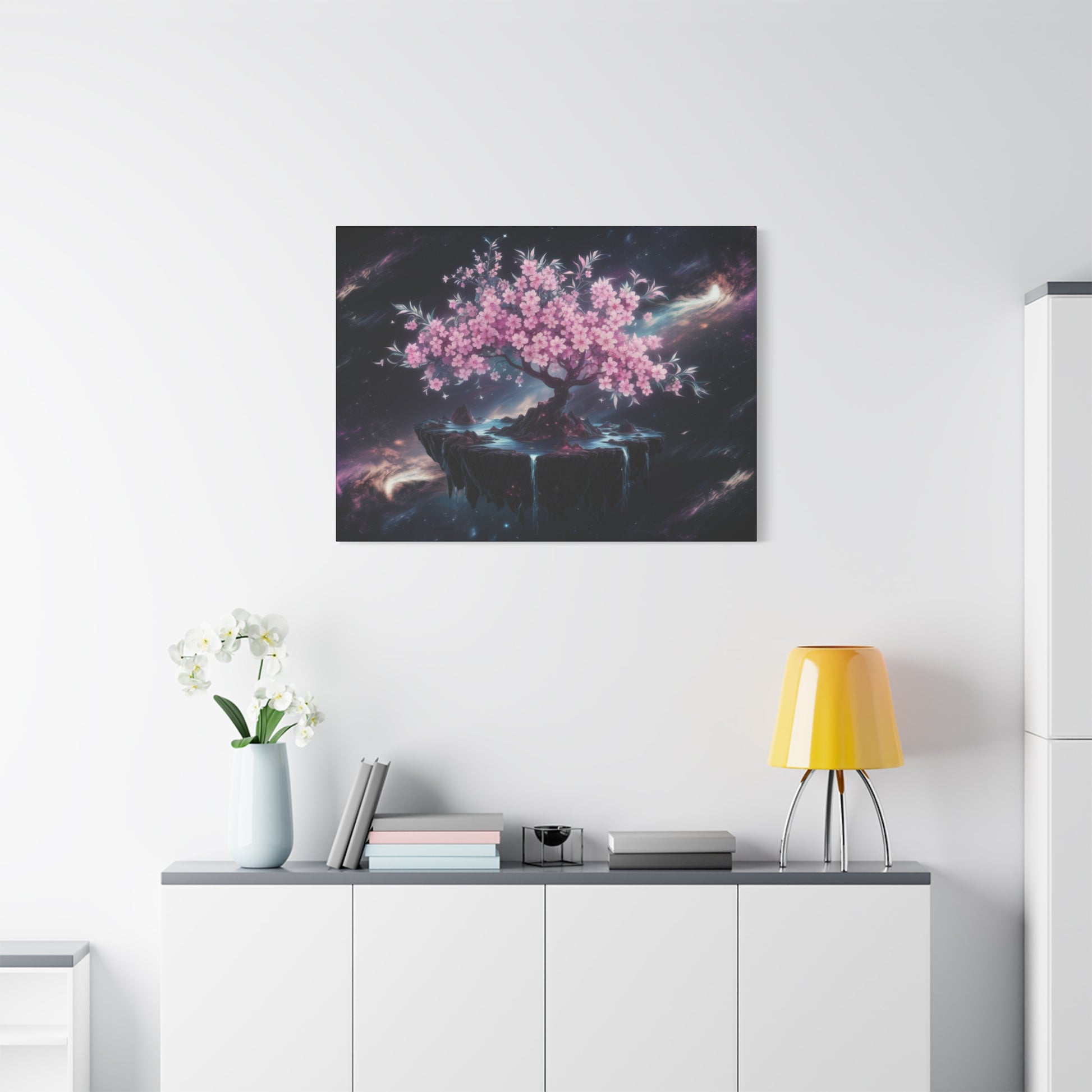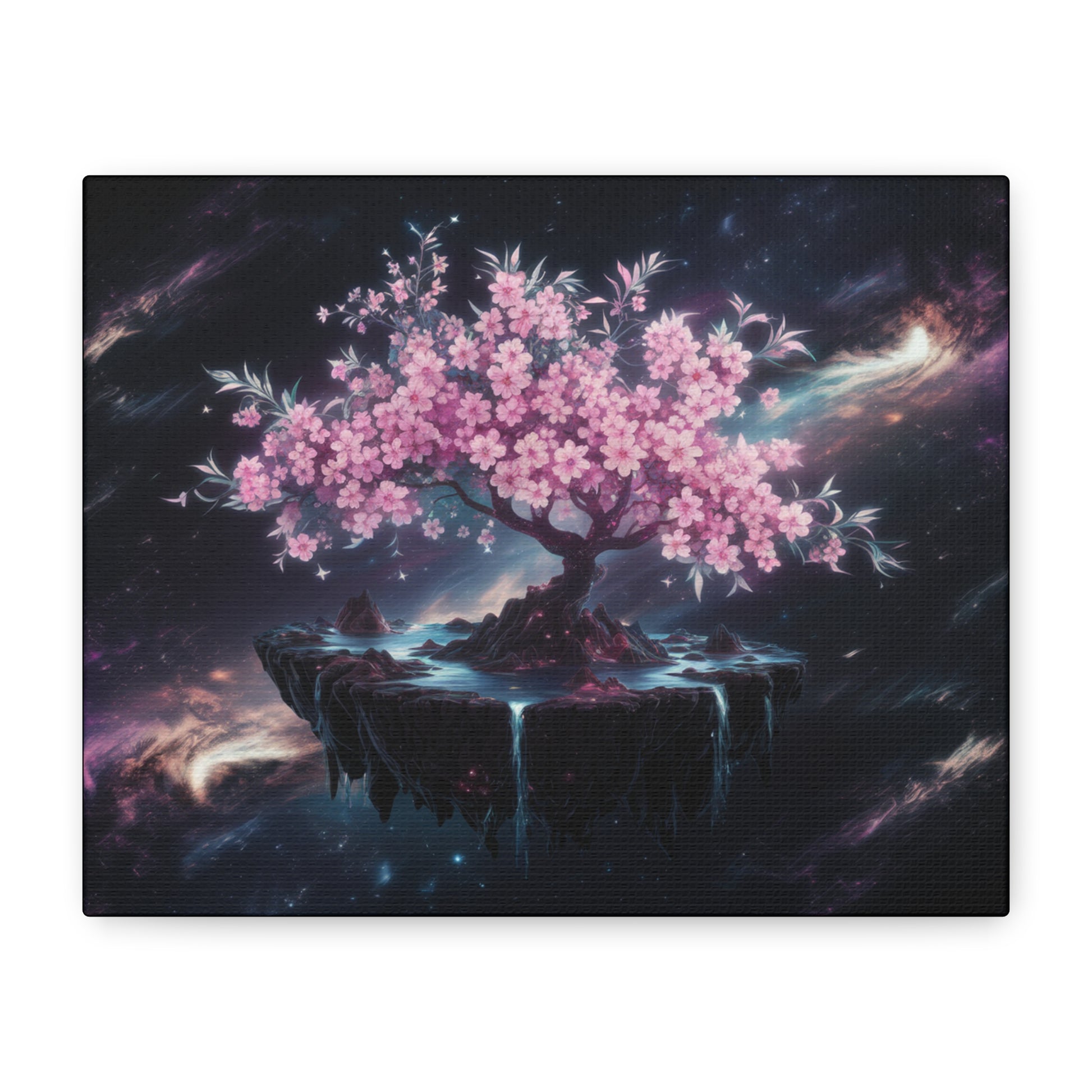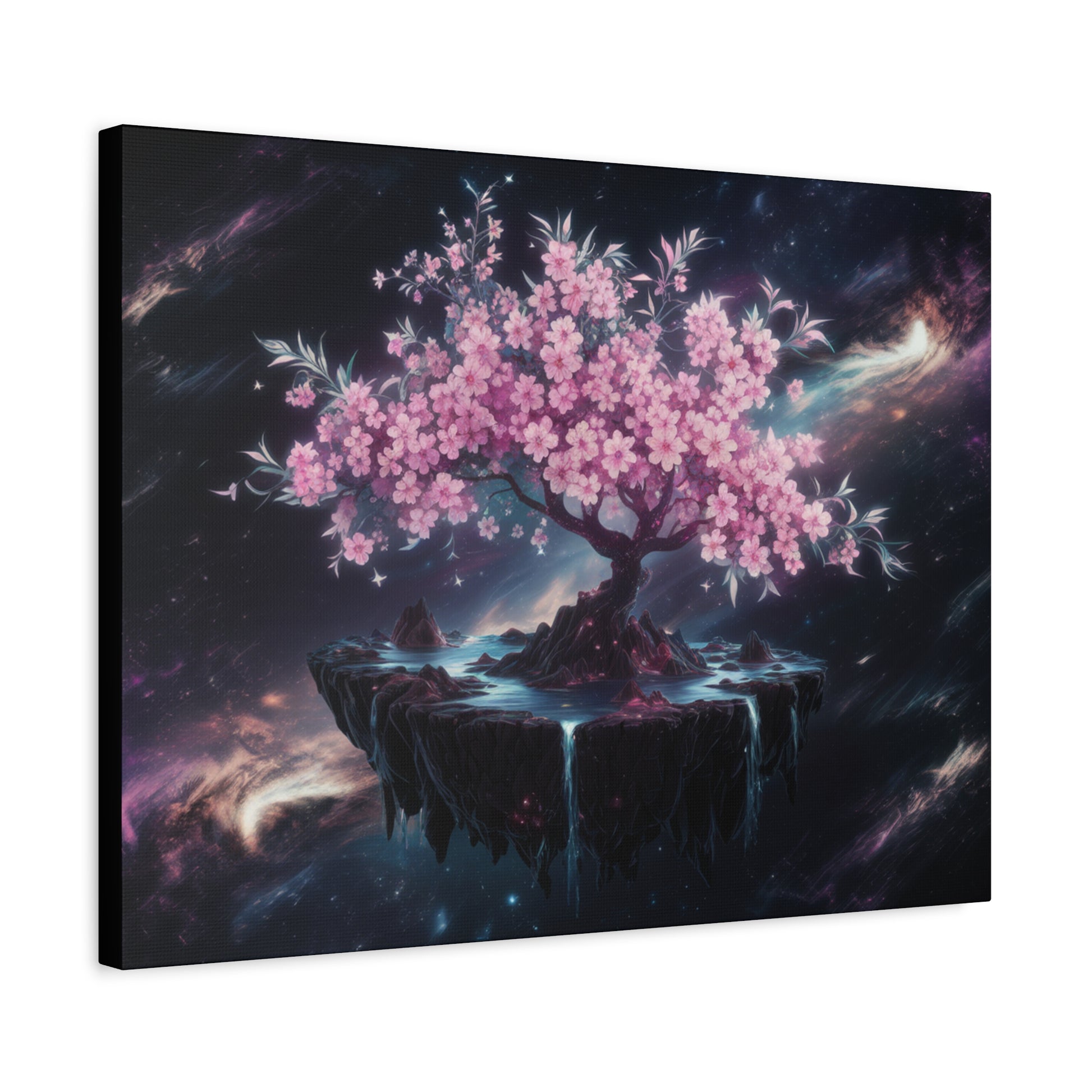 Escape to a world of wonder and magic with our captivating "Celestial Bloom" art piece, featuring a majestic cherry tree floating serenely on a whimsical island in the midst of starry space. This dreamlike design is perfect for adding a touch of fantasy and enchantment to any room.