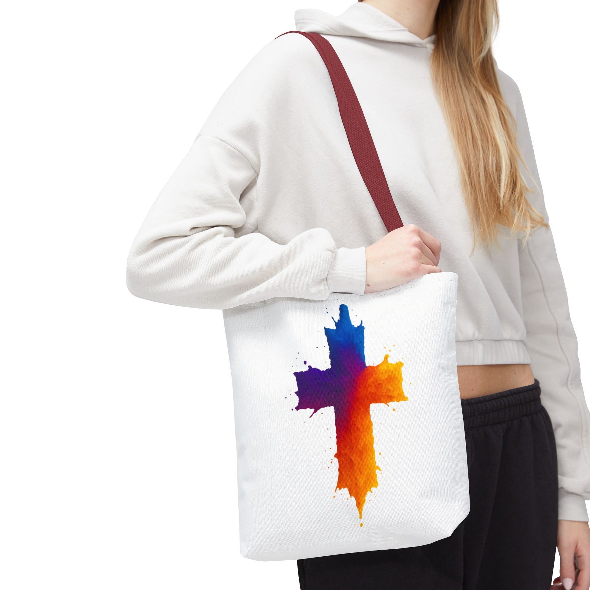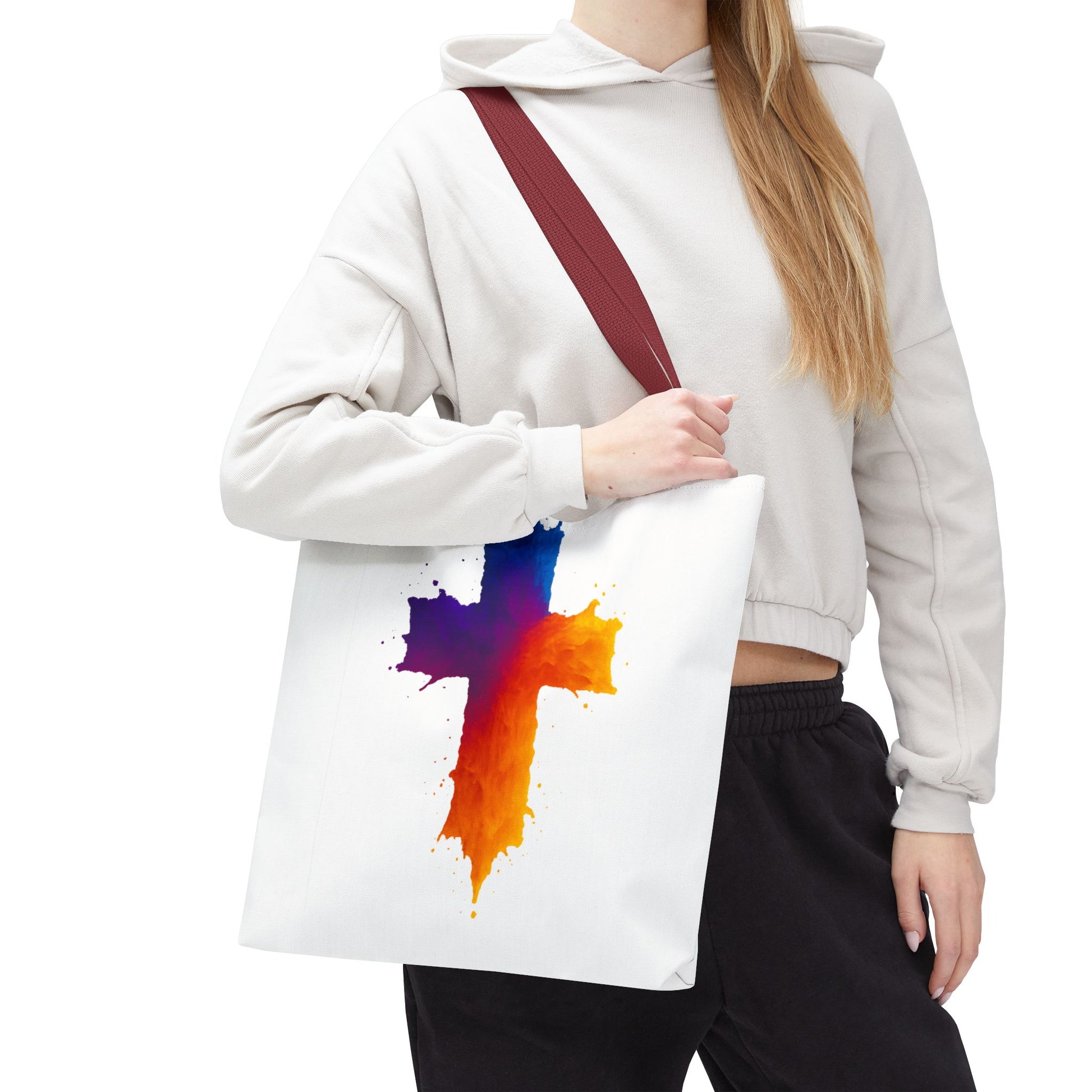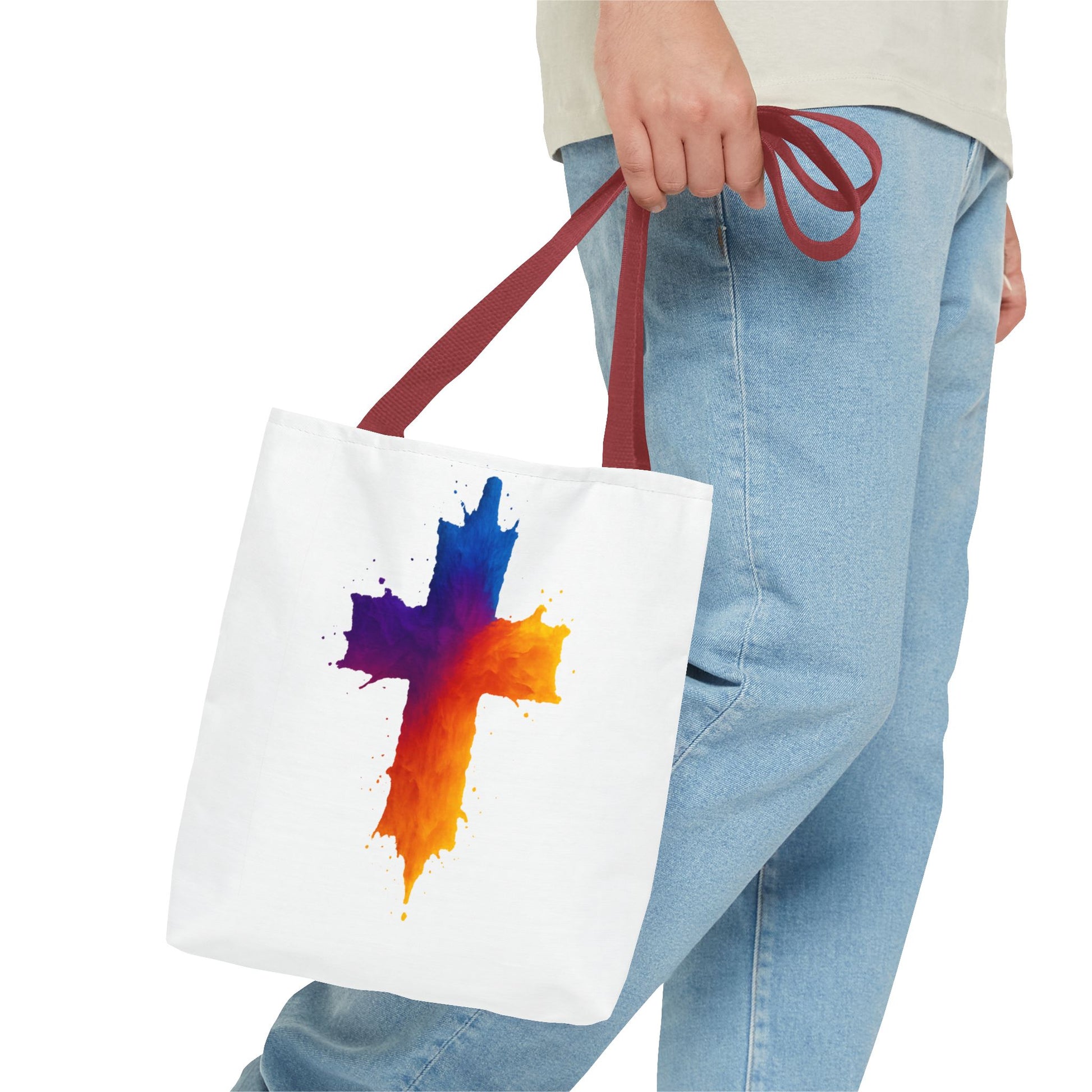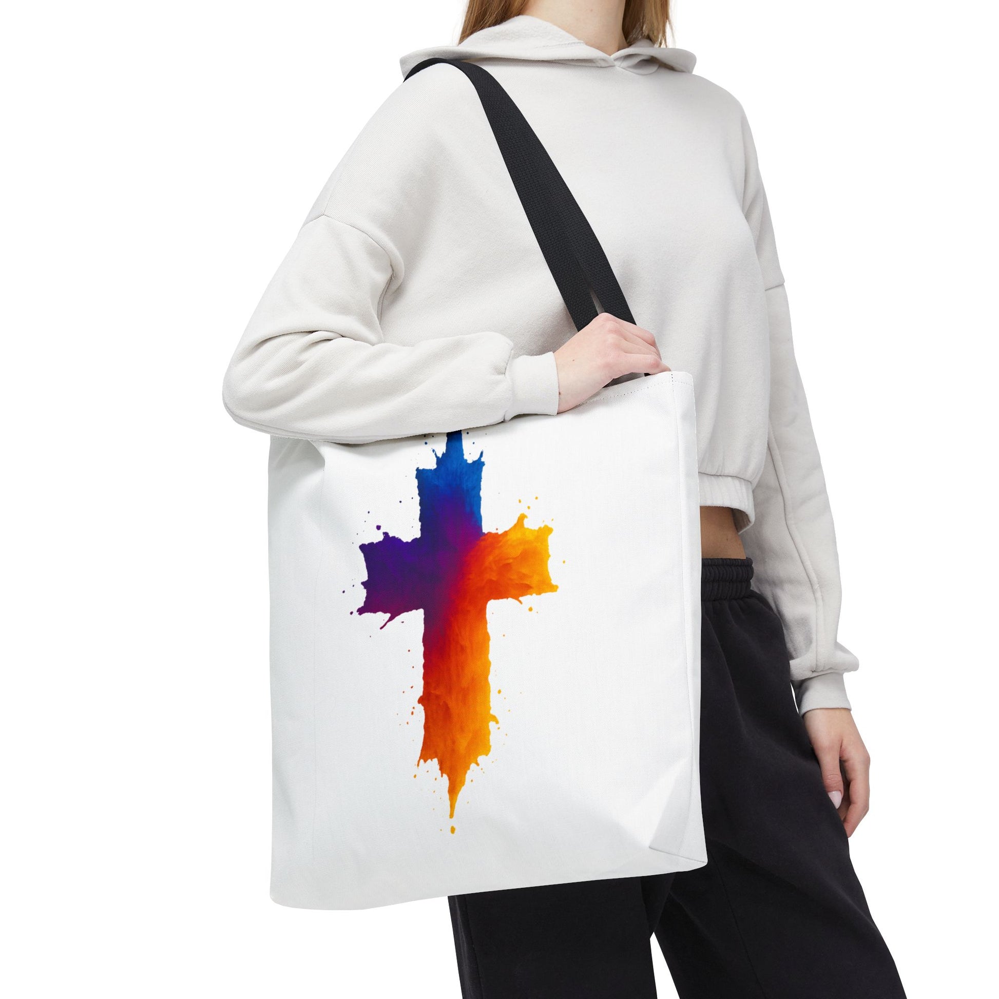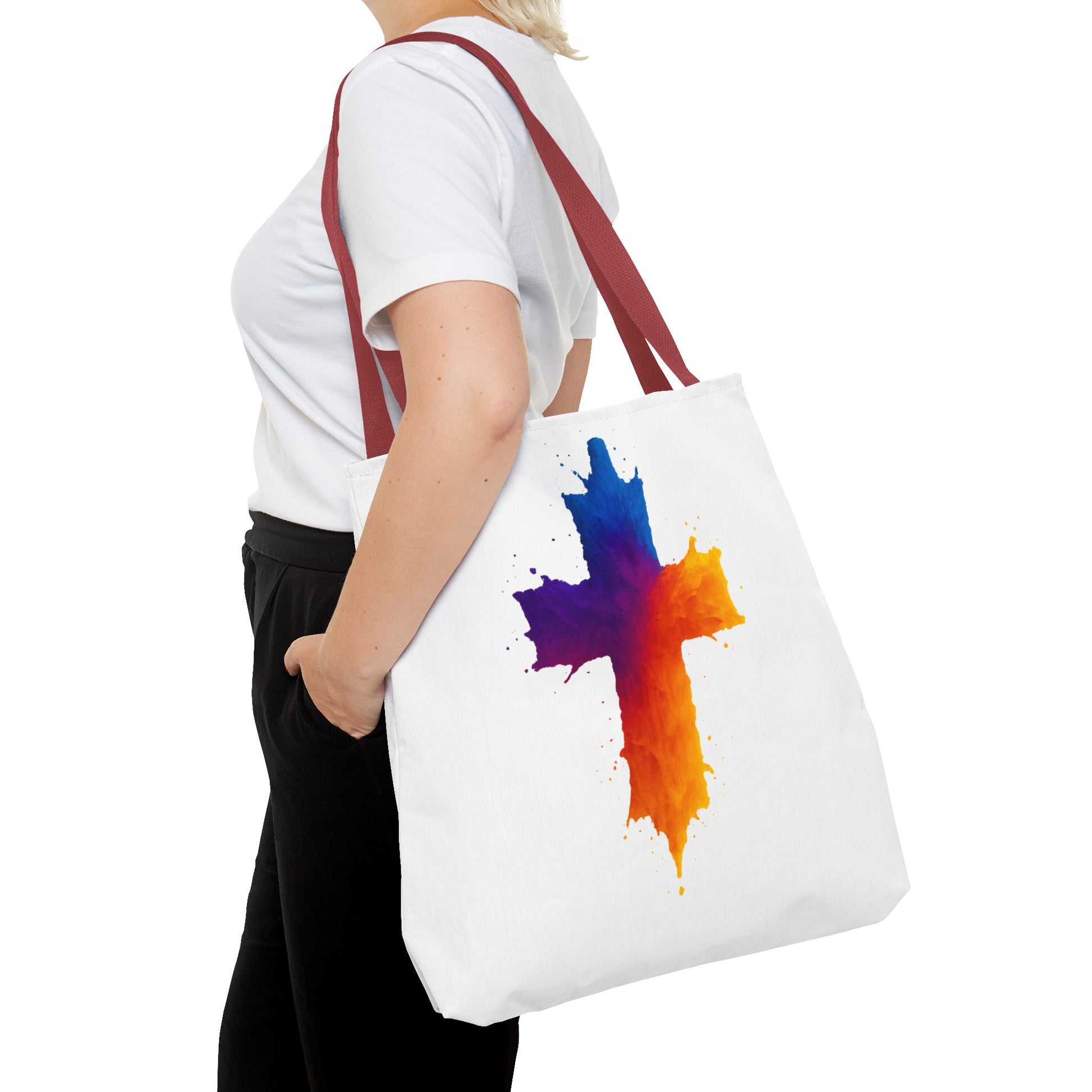 Carry your faith with color and confidence with the Watercolor Cross Tote Bag — a stunning blend of artistry and inspiration. Featuring a vivid watercolor-style cross in radiant orange, red, purple, and blue tones, this tote embodies hope and strength in a bold, modern design.