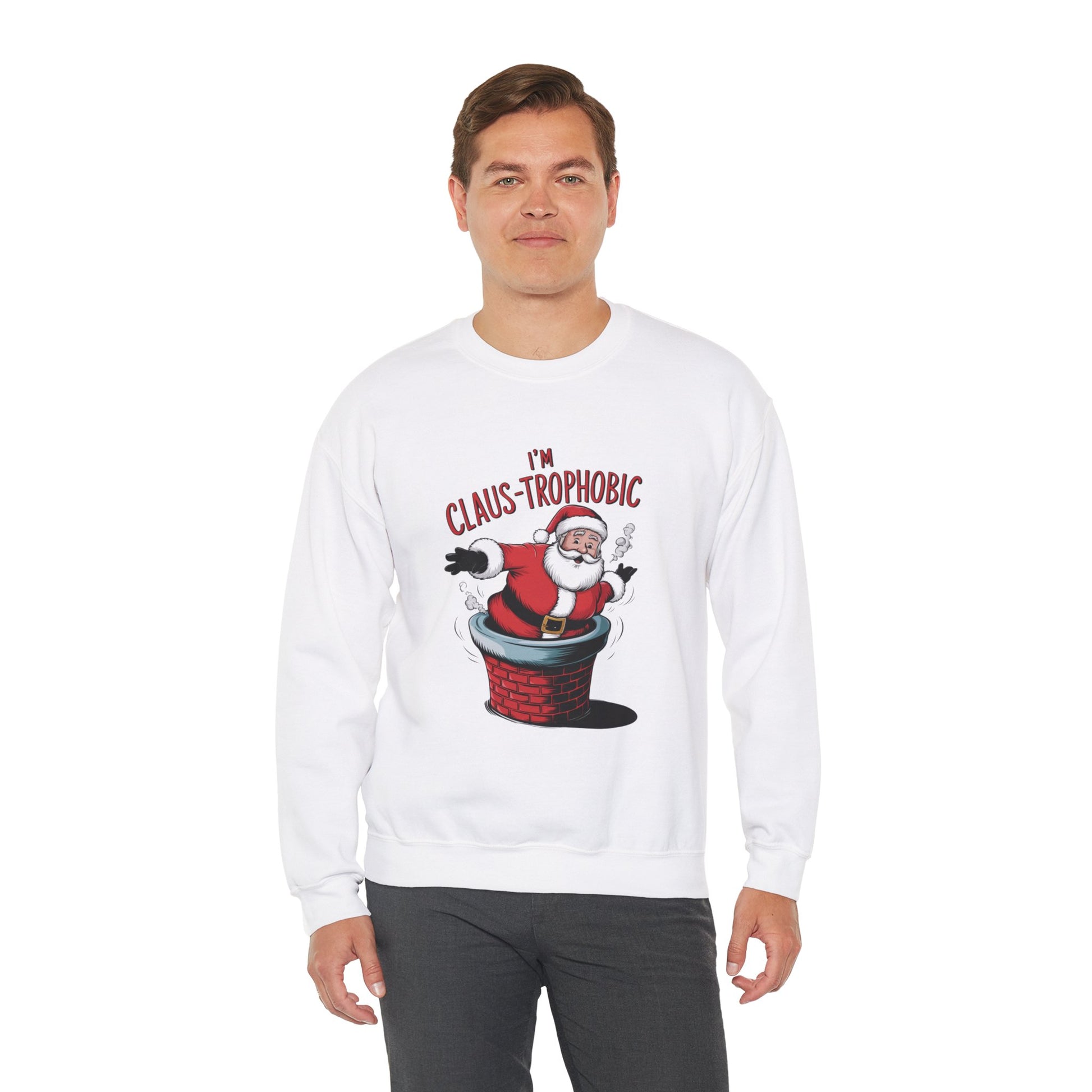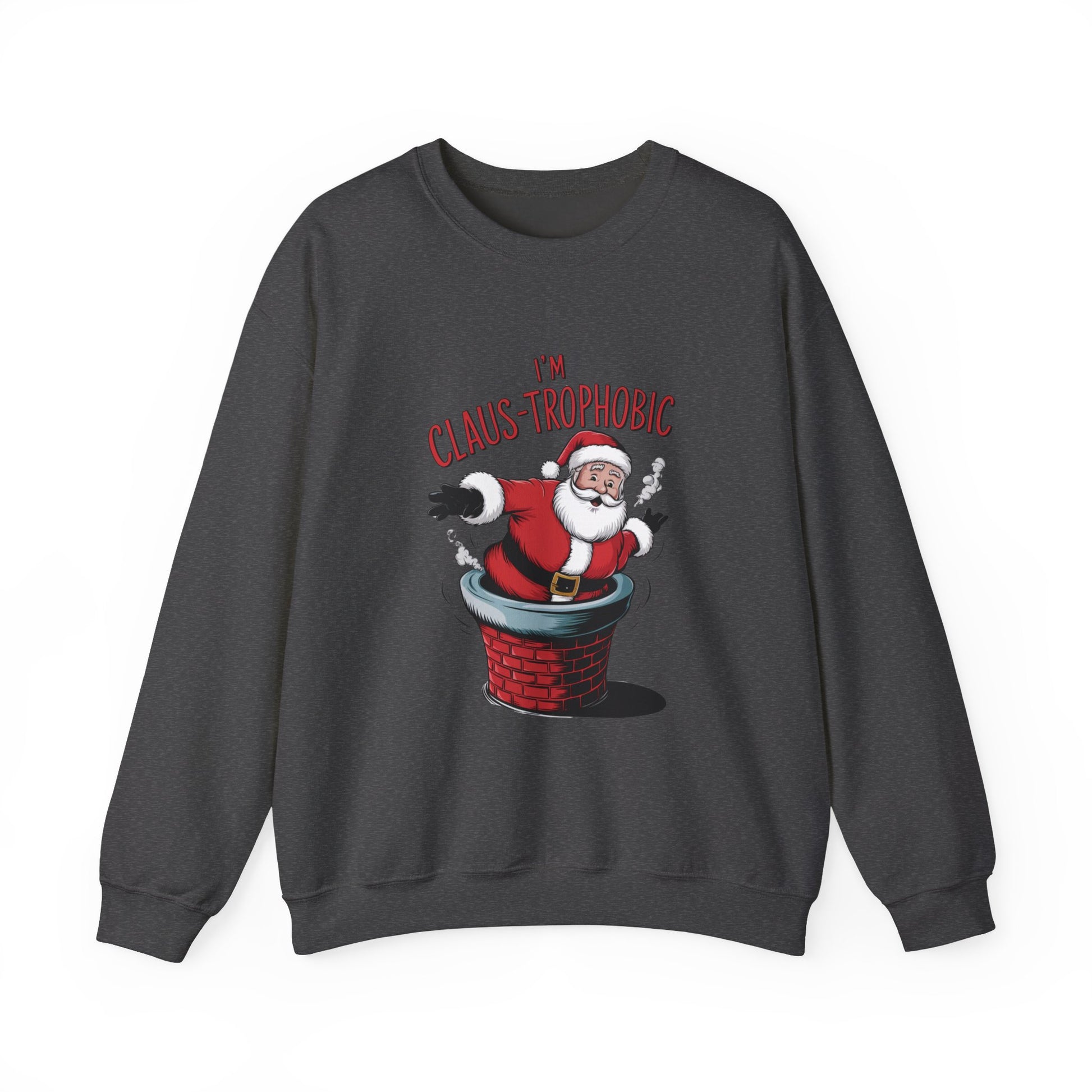 A cozy and fun sweatshirt featuring the design "I'm Claus-trophobic" with Santa getting stuck in a chimney on the front. Perfect for those looking to add some humor to their winter wardrobe or to wear during the holiday season. The unisex design makes it suitable for both men and women.