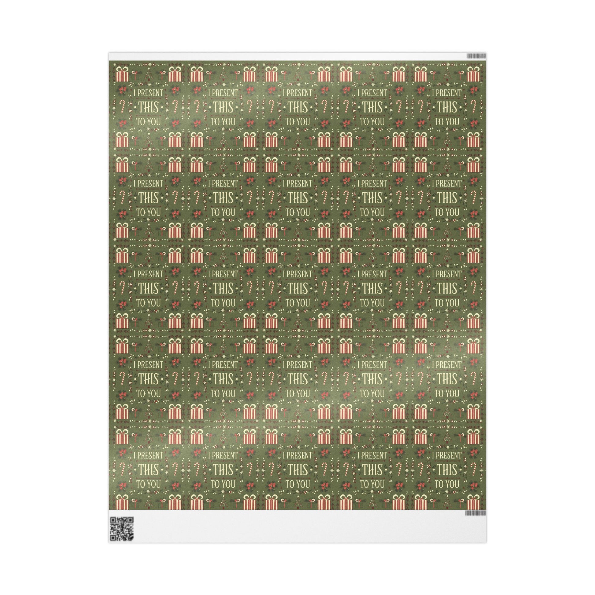 A Fun Green Christmas Wrapping Paper that says "I Present This To You". Perfect for adding a touch of fun and festive spirit to your gift wrapping this holiday season. Ideal for those who enjoy unique and eye-catching wrapping paper designs. Relevant for Christmas, birthdays, and special occasions.