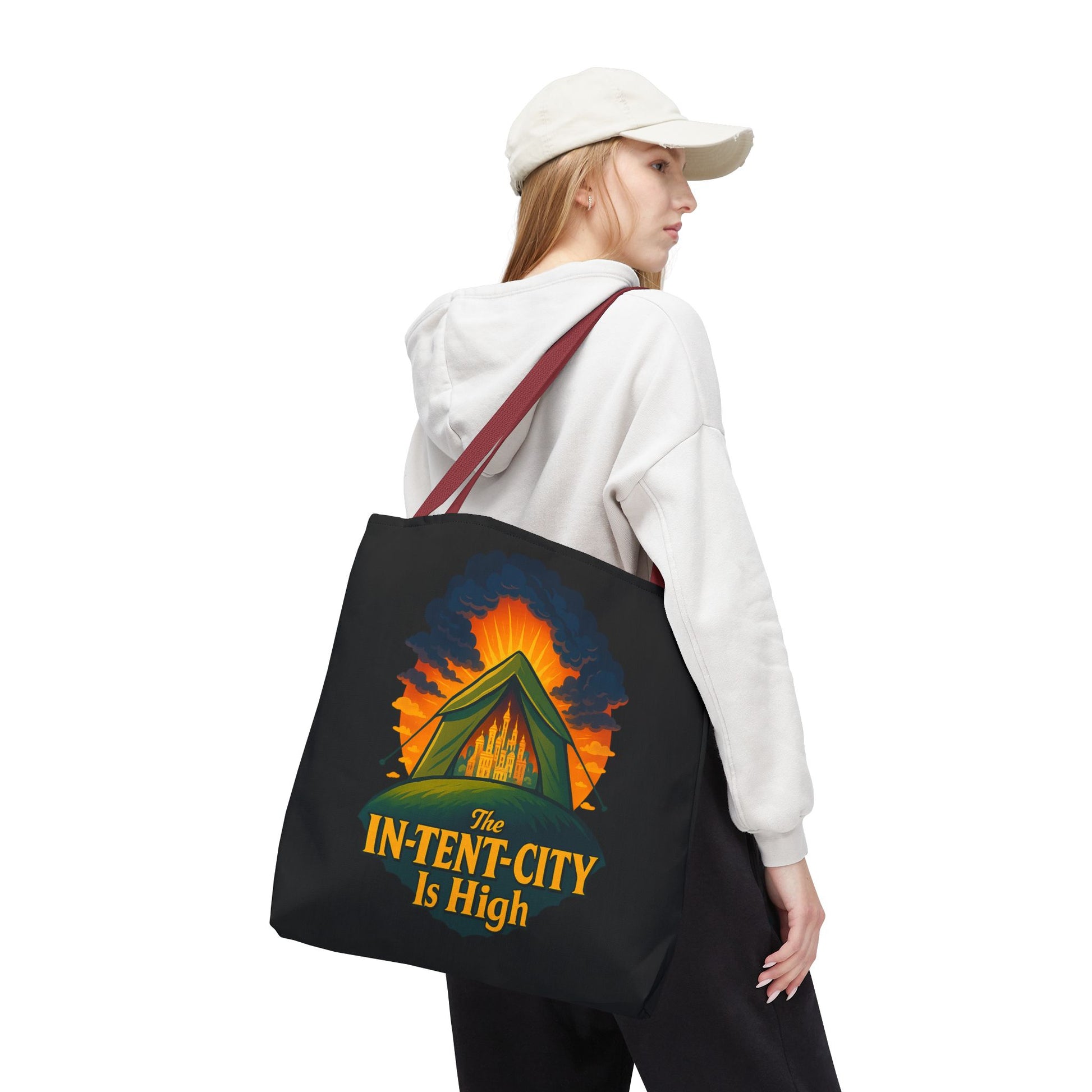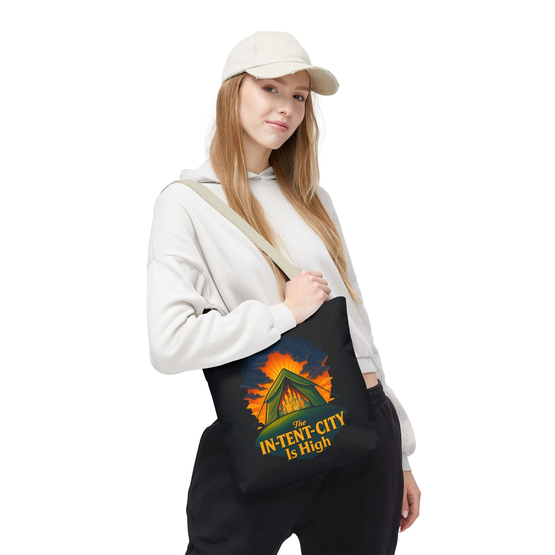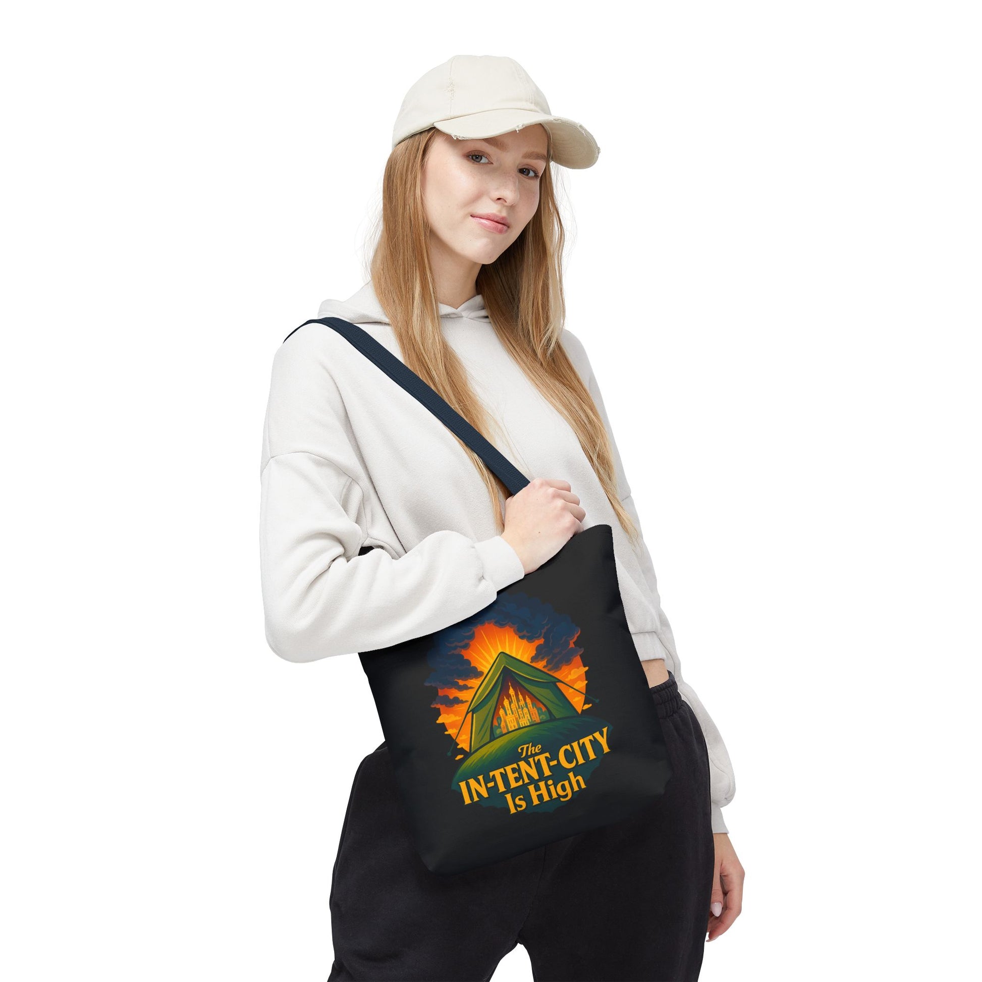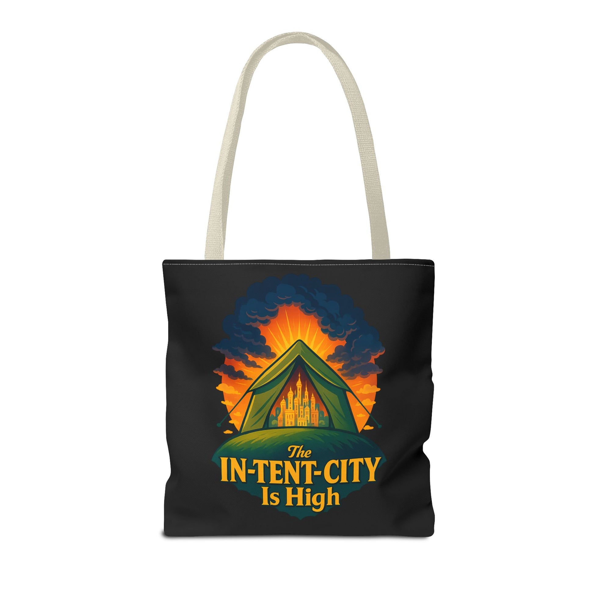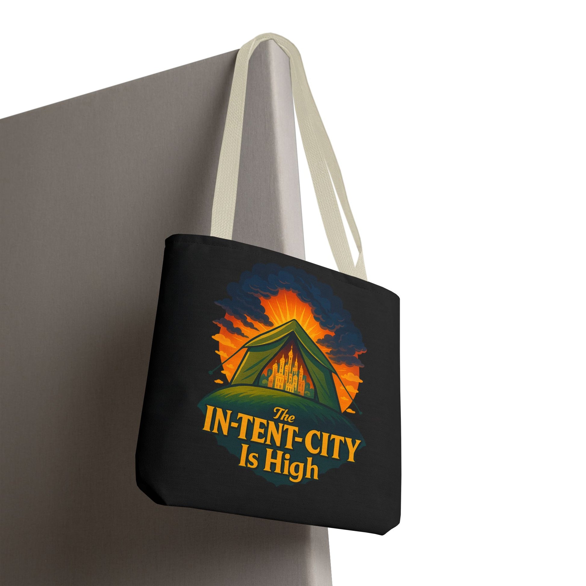 A fun tote bag featuring a city within a tent high on a hill with the phrase 'The In-Tent-City Is High'. Perfect for everyday use, this durable tote bag is ideal for carrying essentials while adding a touch of whimsy to any outfit. The design gives off a playful and adventurous vibe, making it a great gift for those who love cityscapes and camping. Ideal for holidays, camping trips, outdoor adventures, and urban explorations.