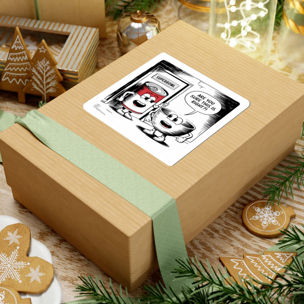 Vibrant kiss-cut stickers featuring a fun comic about a can of soup and a bowl entering a door labeled 'Superbowl'. Perfect for adding a touch of humor and personality to laptops, journals, and windows. Ideal for those who enjoy quirky designs and want to celebrate football season or game day parties.