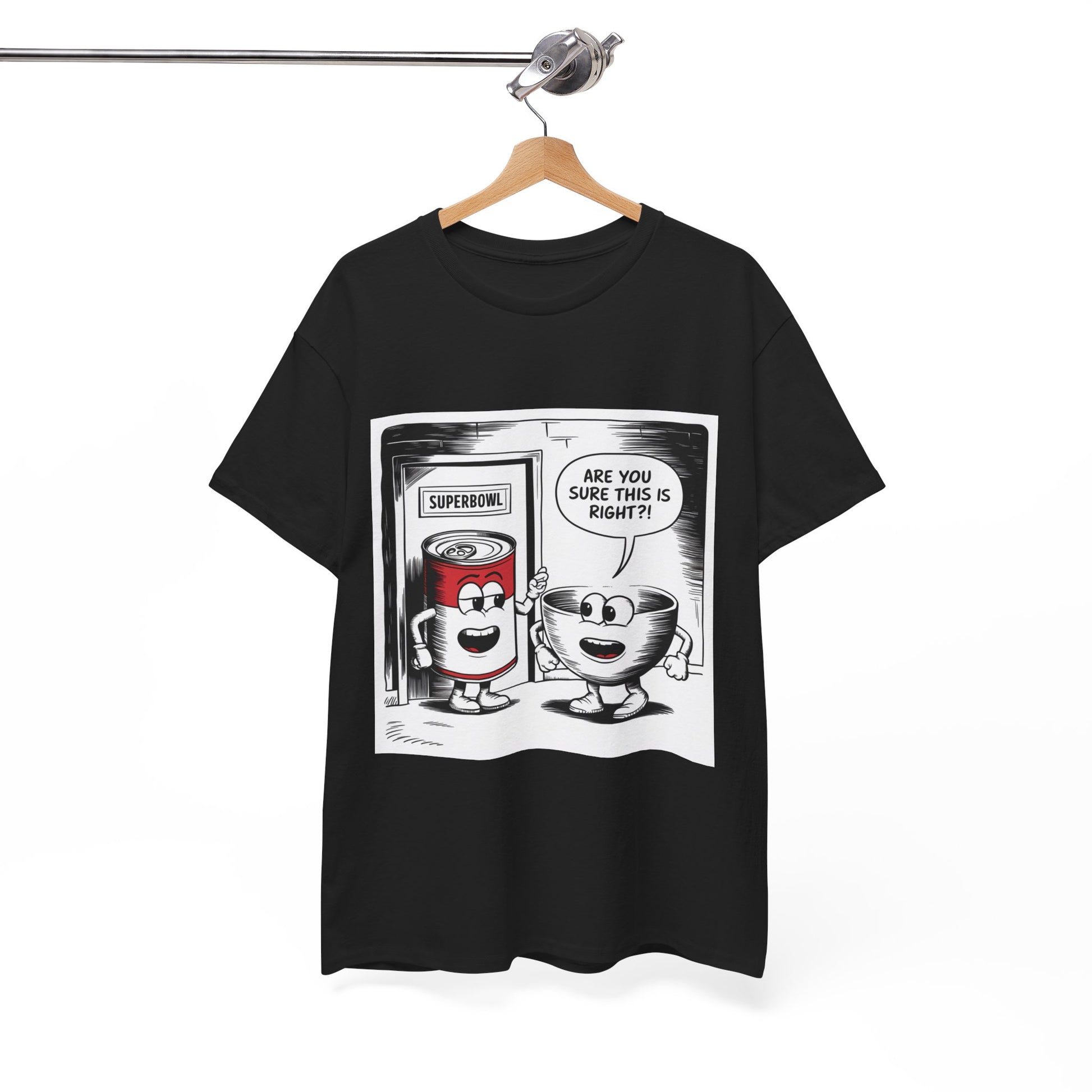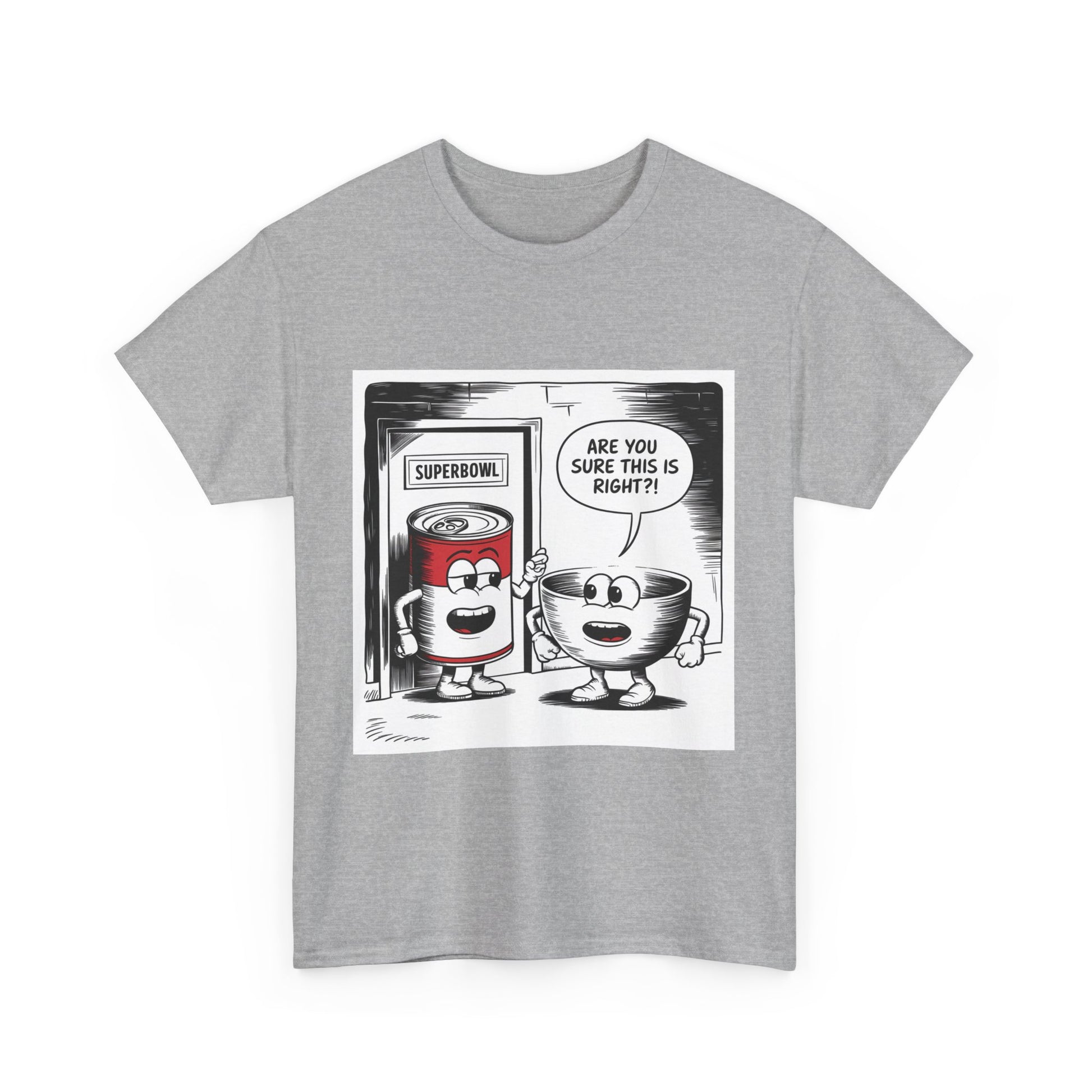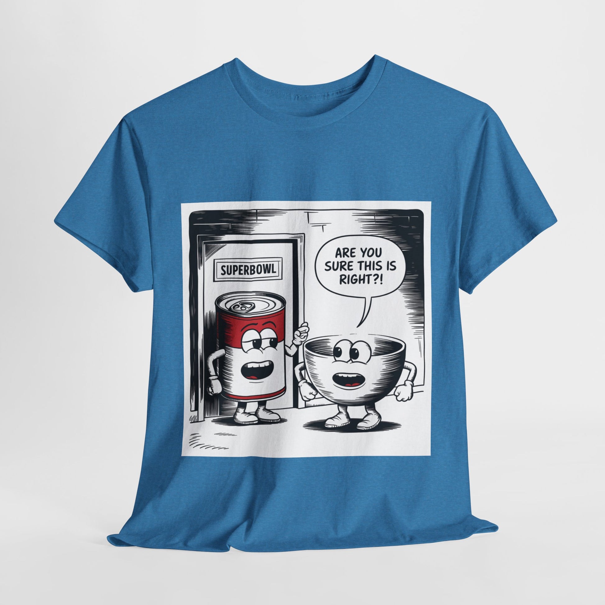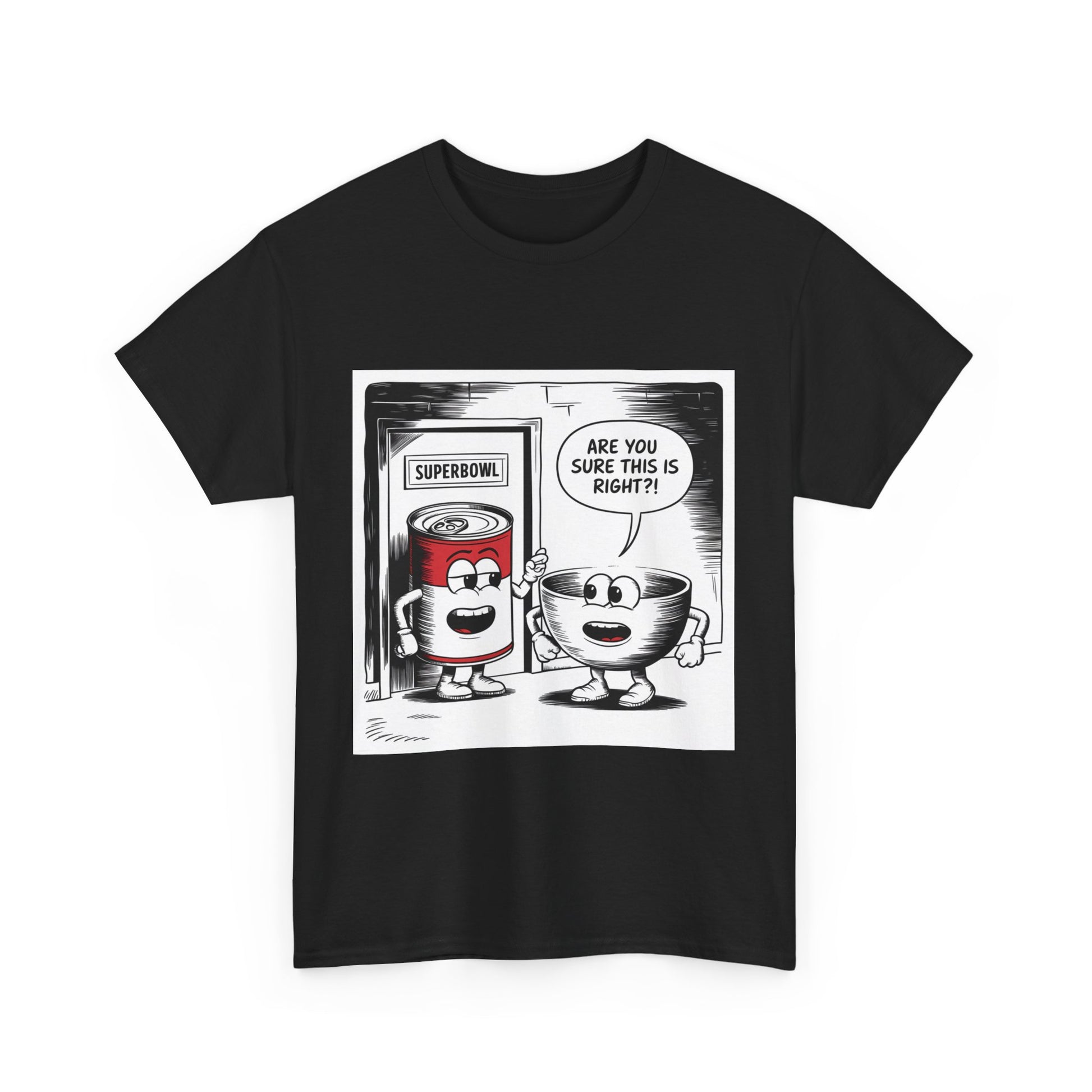 A fun comic panel T-Shirt featuring a can of soup and a bowl getting ready to go into a door labeled 'Superbowl'. This quirky design brings a light-hearted and humorous vibe, perfect for casual wear or lounging around the house. Ideal for those who enjoy puns and witty humor. Relevant for Superbowl parties, comic enthusiasts, or anyone looking to add a playful touch to their wardrobe.