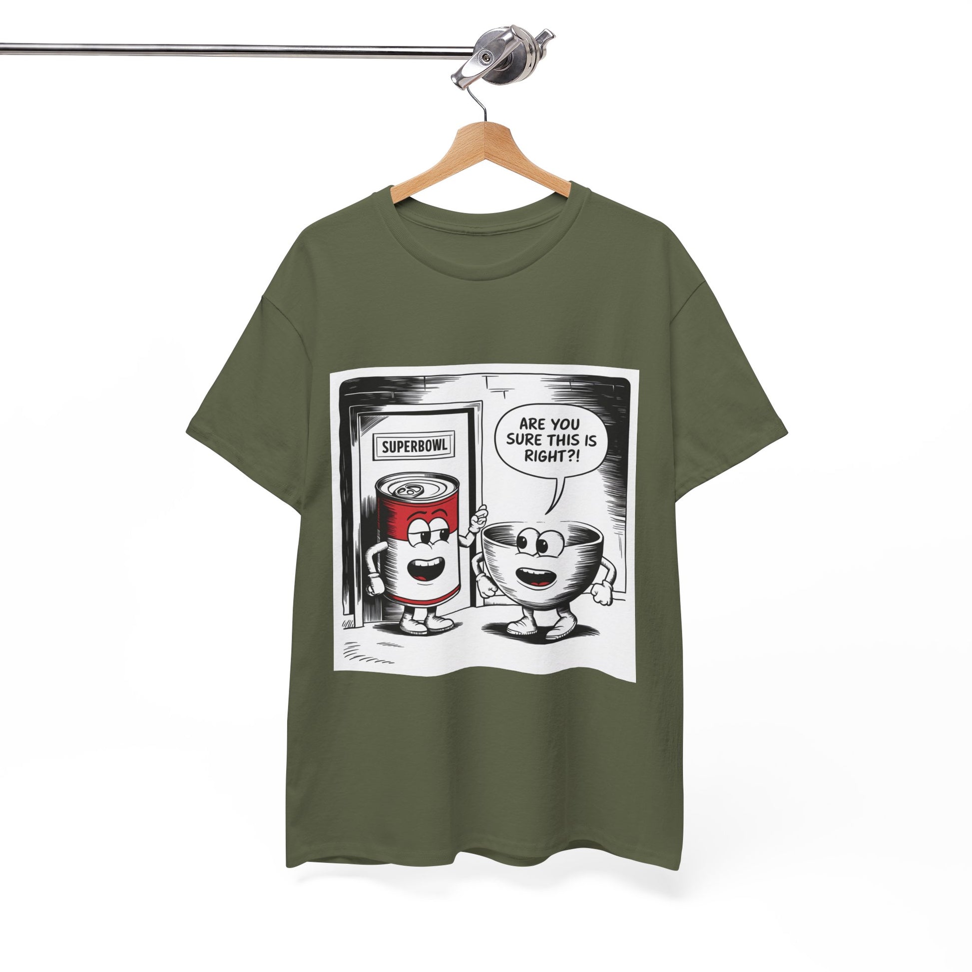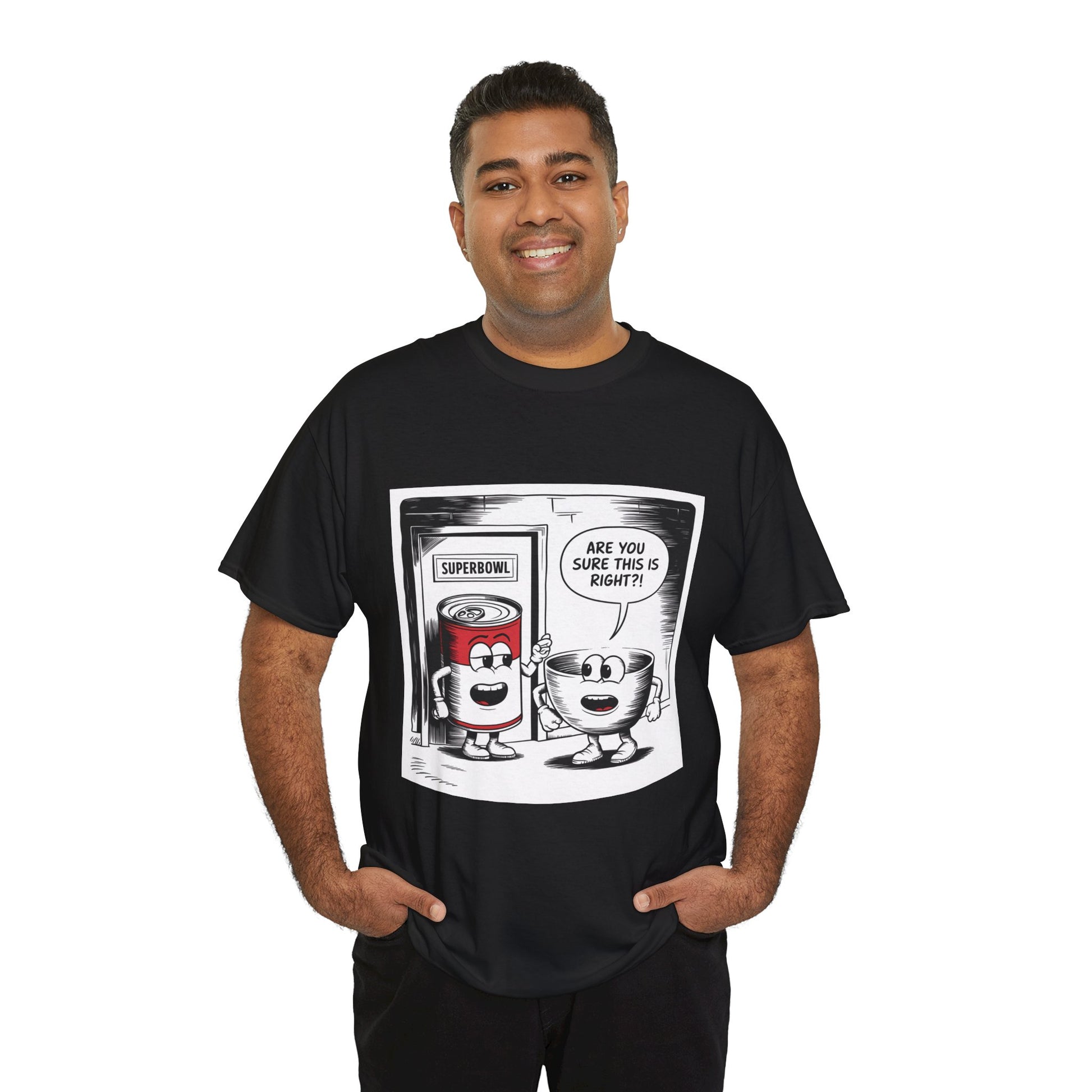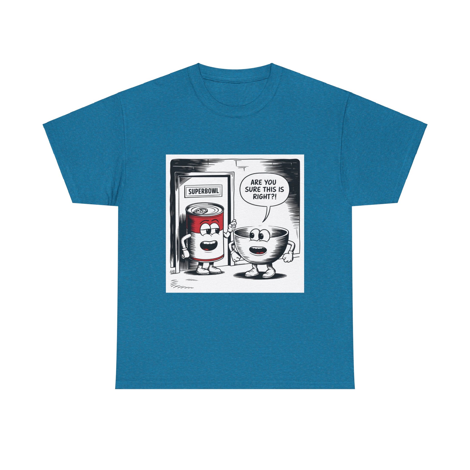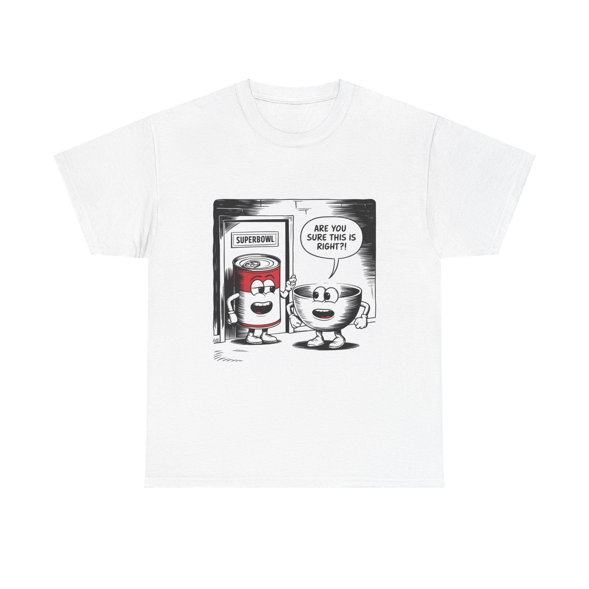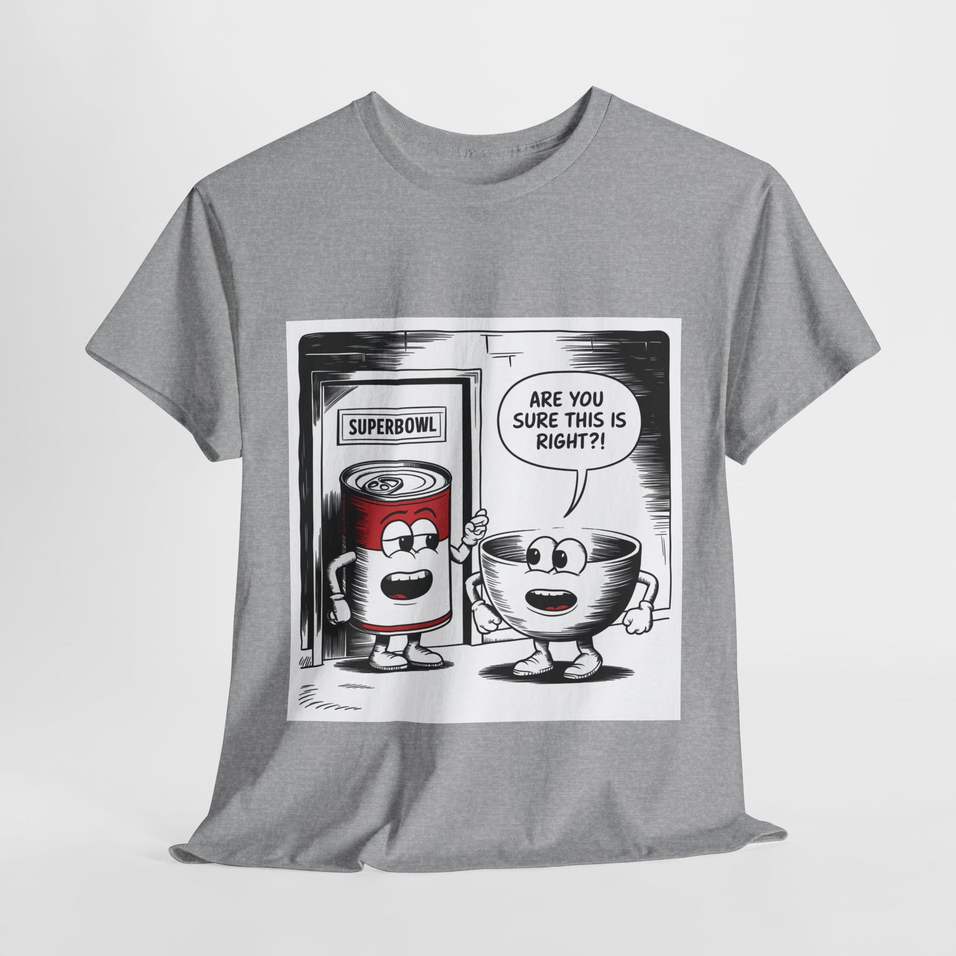 A fun comic panel T-Shirt featuring a can of soup and a bowl getting ready to go into a door labeled 'Superbowl'. This quirky design brings a light-hearted and humorous vibe, perfect for casual wear or lounging around the house. Ideal for those who enjoy puns and witty humor. Relevant for Superbowl parties, comic enthusiasts, or anyone looking to add a playful touch to their wardrobe.
