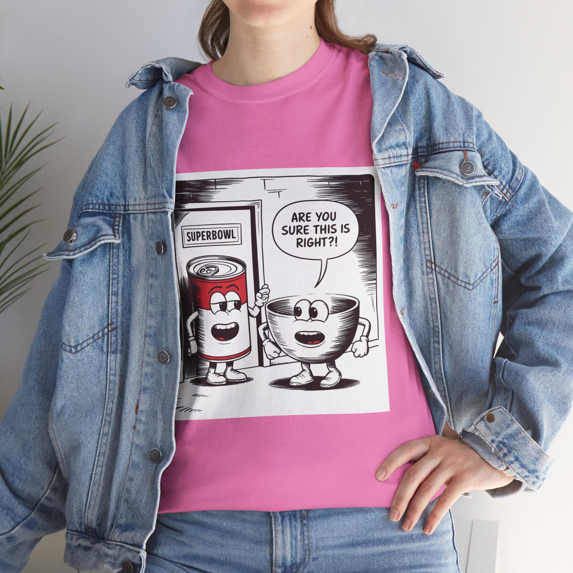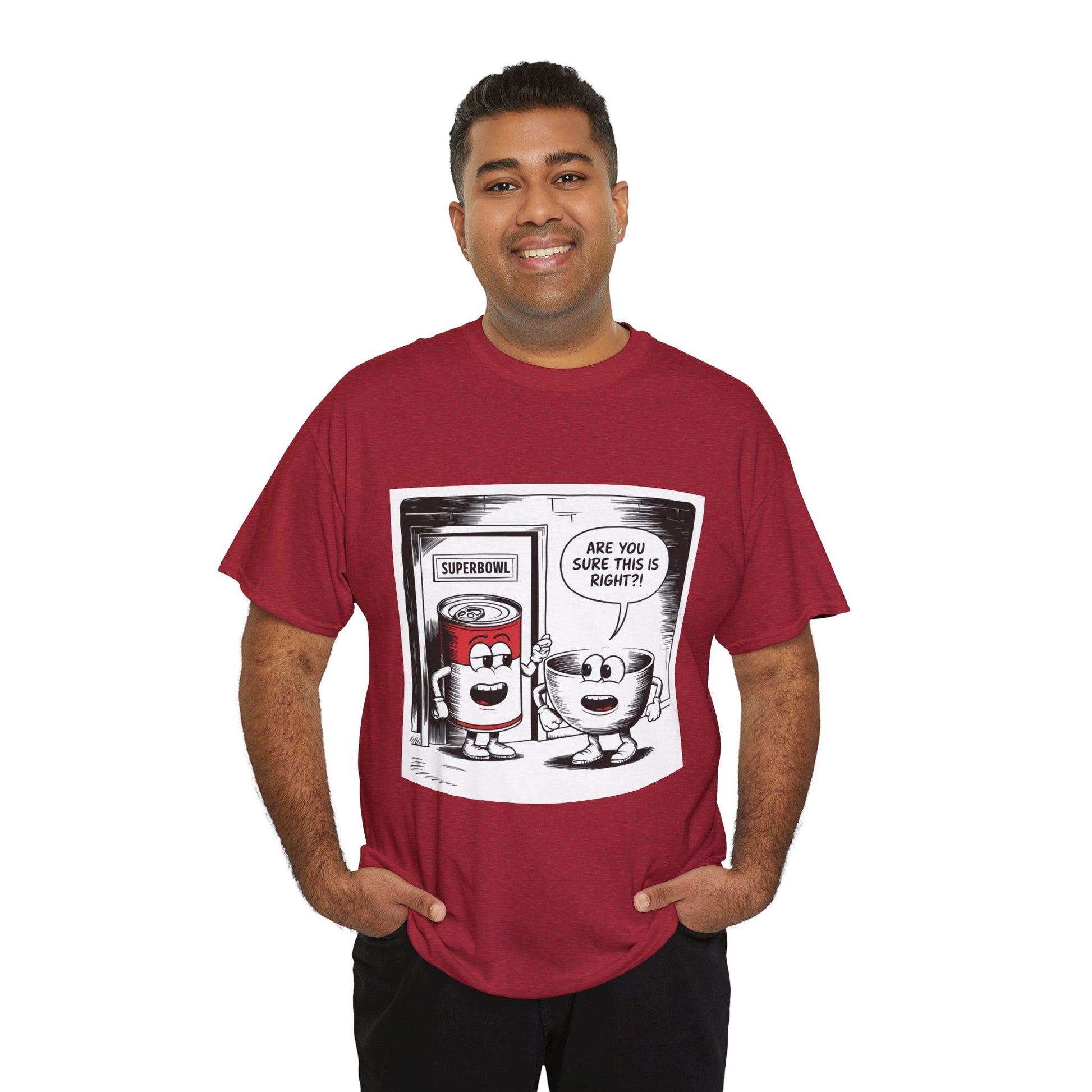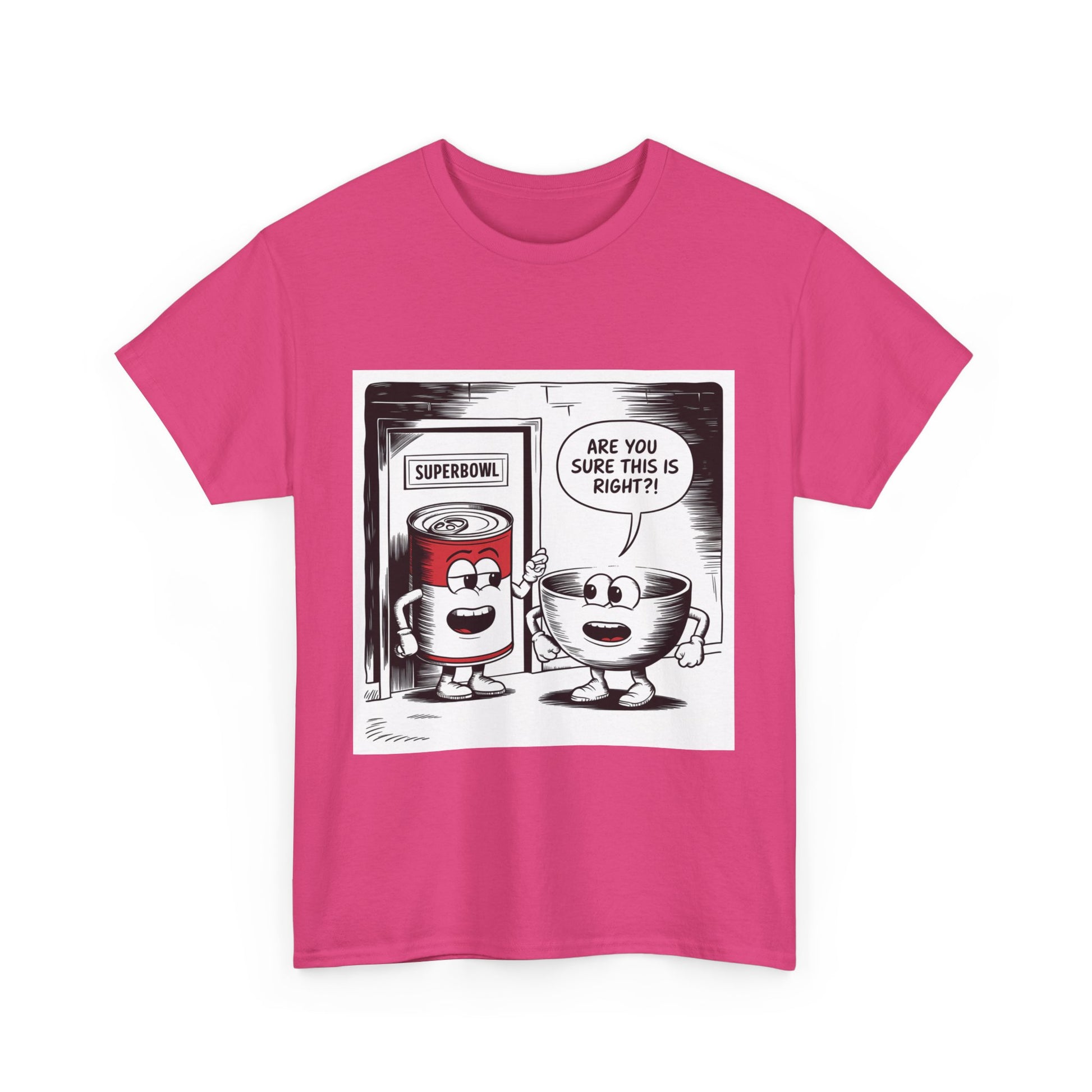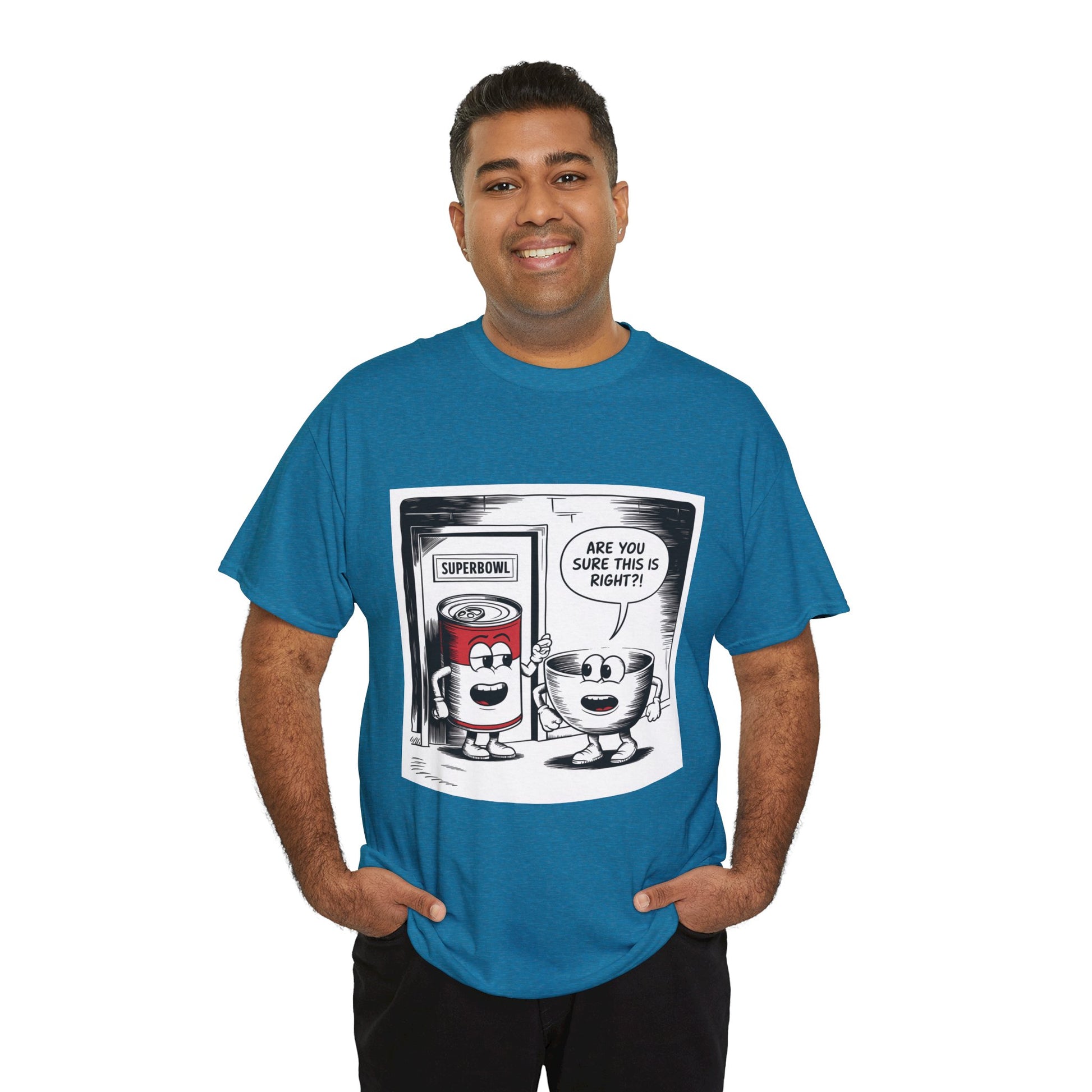 A fun comic panel T-Shirt featuring a can of soup and a bowl getting ready to go into a door labeled 'Superbowl'. This quirky design brings a light-hearted and humorous vibe, perfect for casual wear or lounging around the house. Ideal for those who enjoy puns and witty humor. Relevant for Superbowl parties, comic enthusiasts, or anyone looking to add a playful touch to their wardrobe.