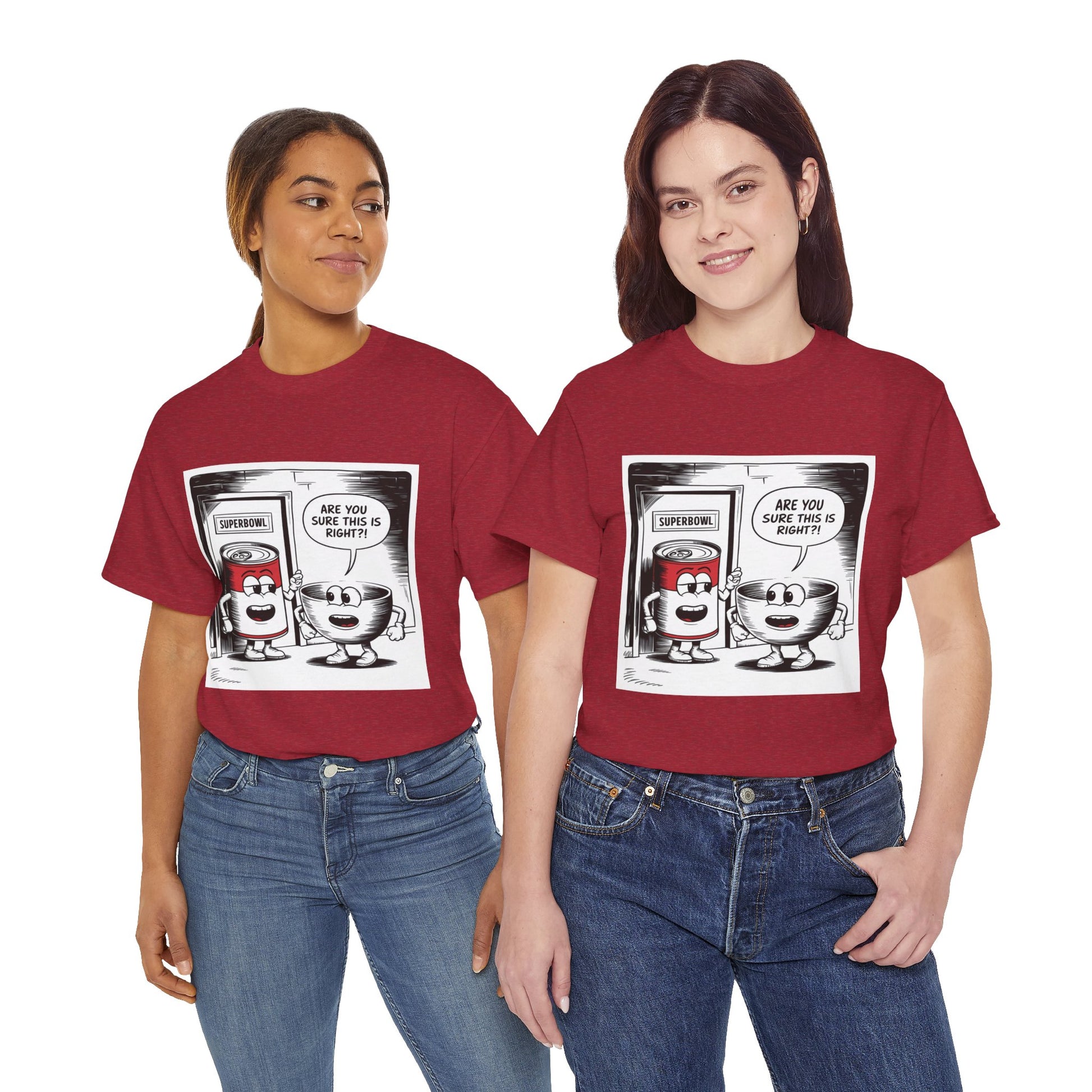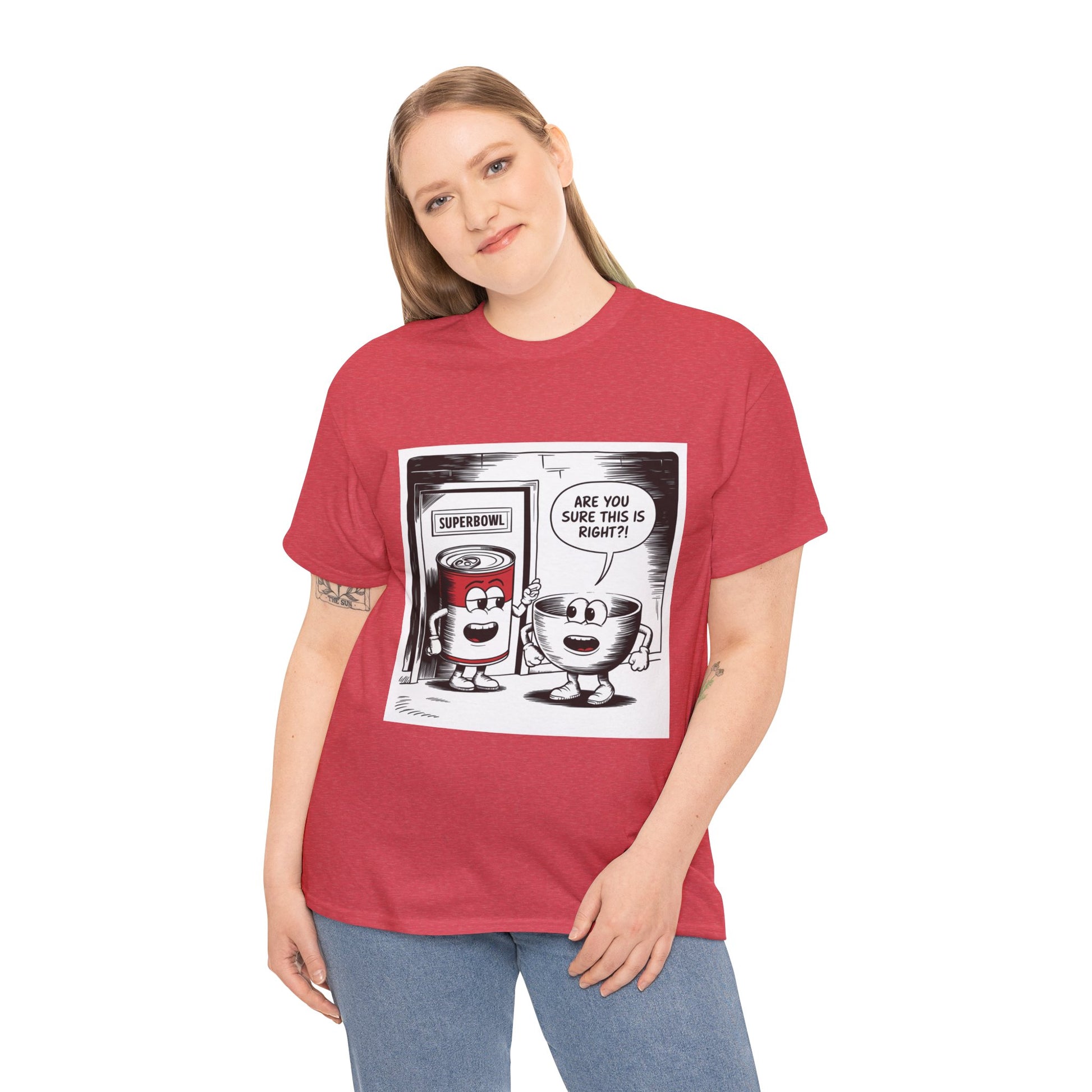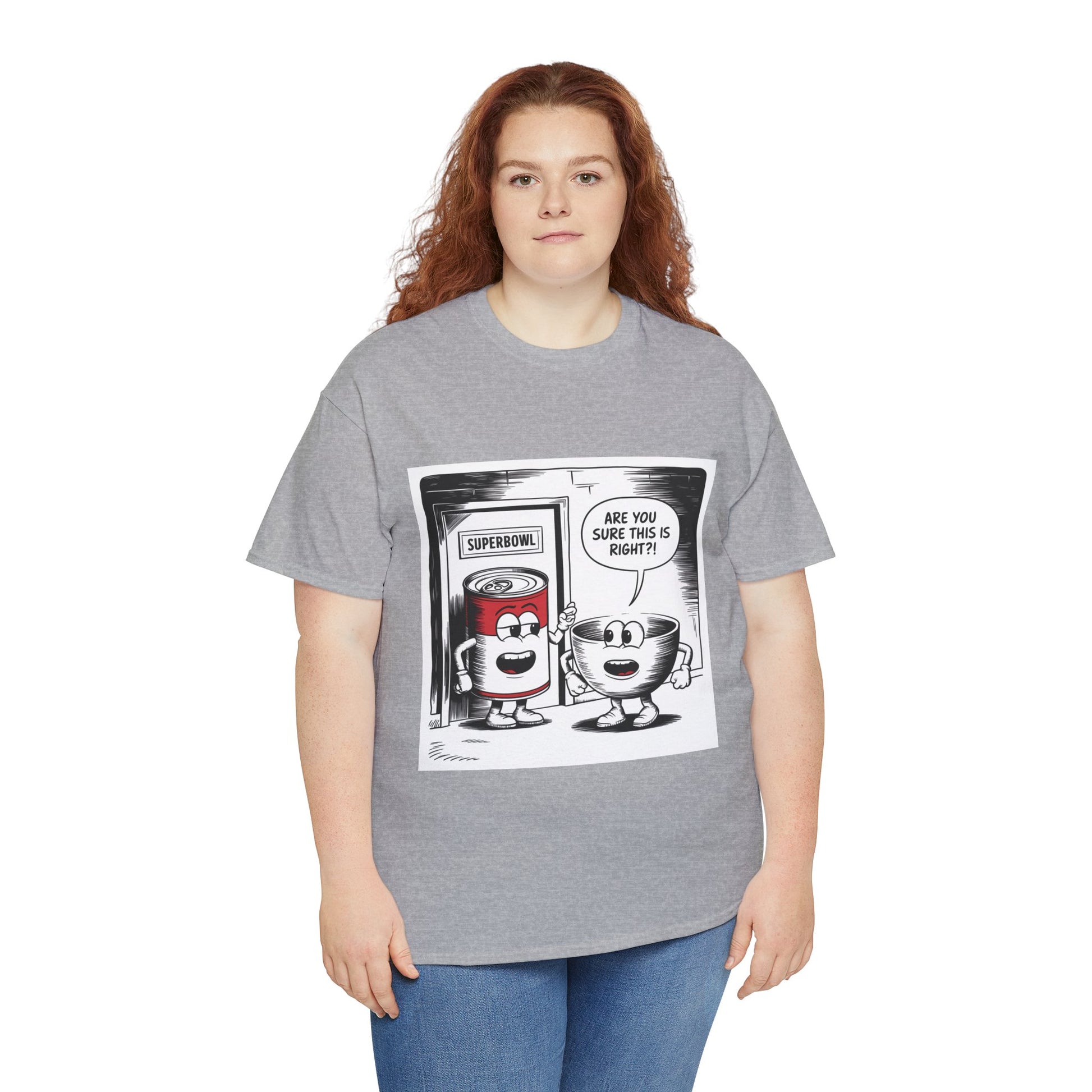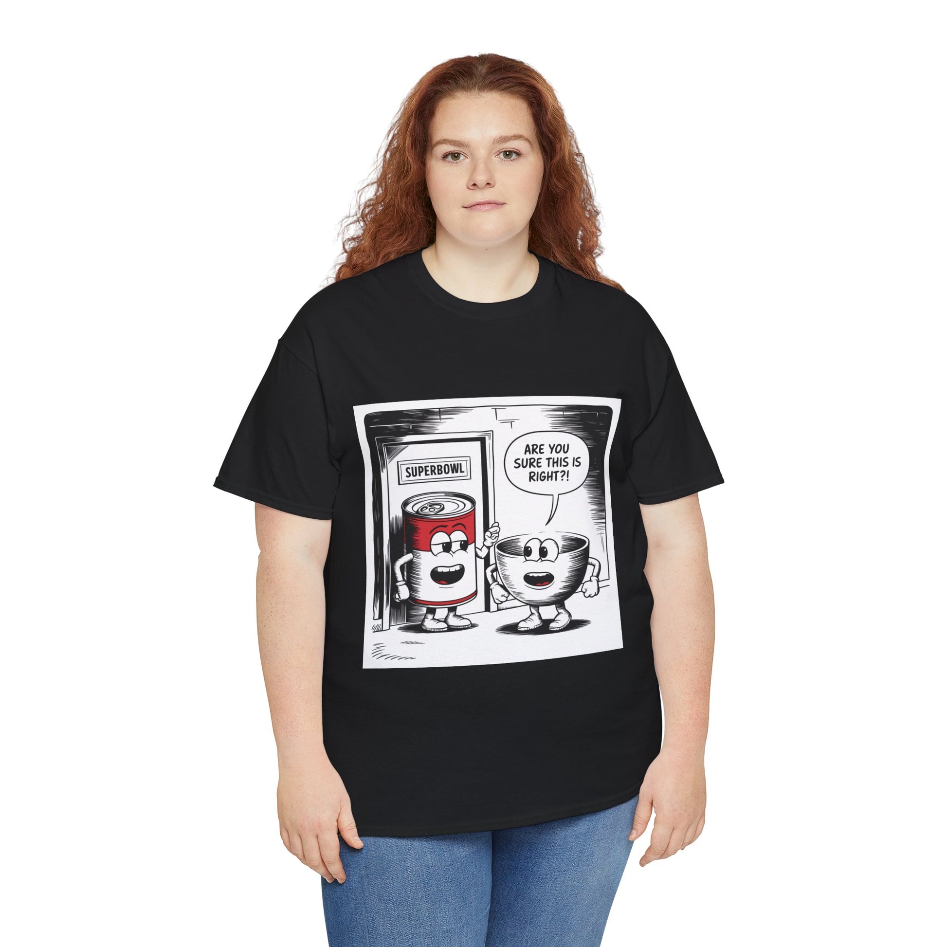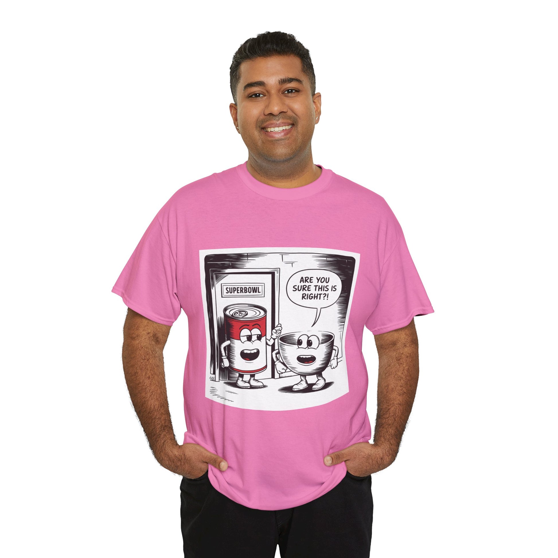 A fun comic panel T-Shirt featuring a can of soup and a bowl getting ready to go into a door labeled 'Superbowl'. This quirky design brings a light-hearted and humorous vibe, perfect for casual wear or lounging around the house. Ideal for those who enjoy puns and witty humor. Relevant for Superbowl parties, comic enthusiasts, or anyone looking to add a playful touch to their wardrobe.