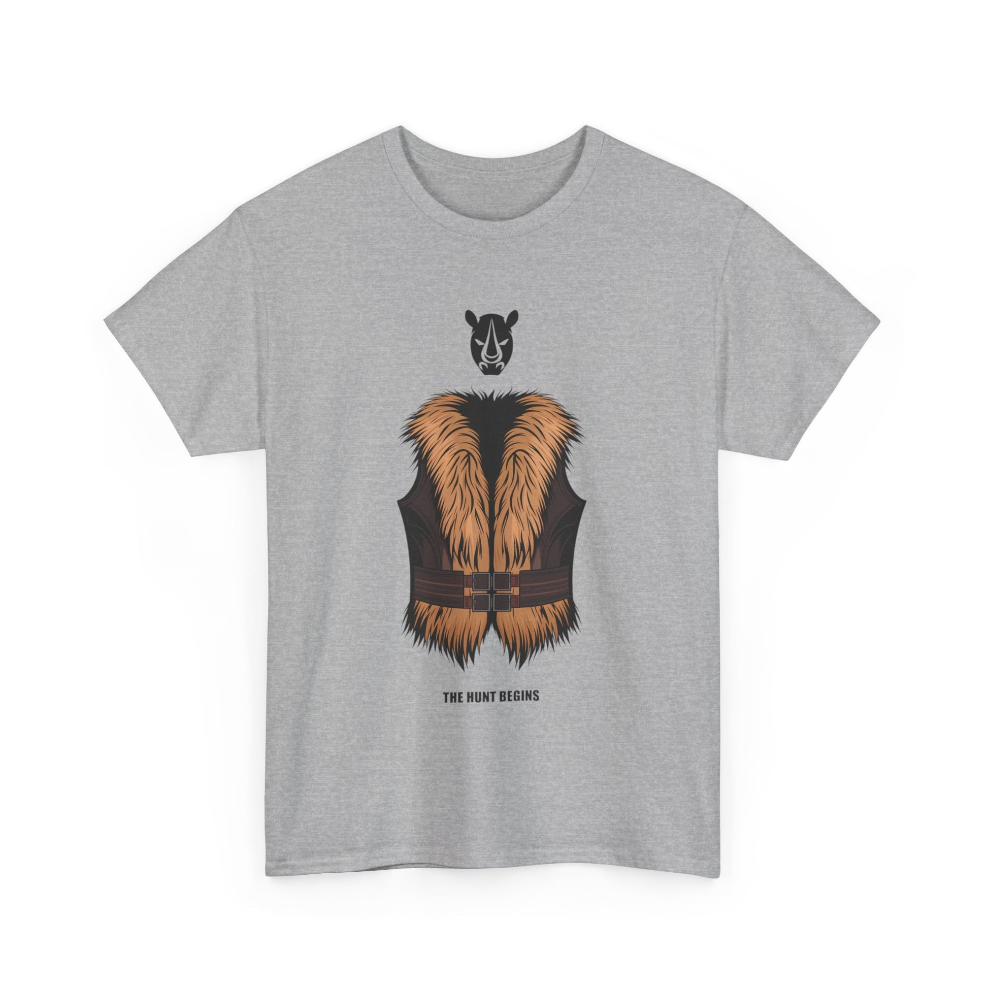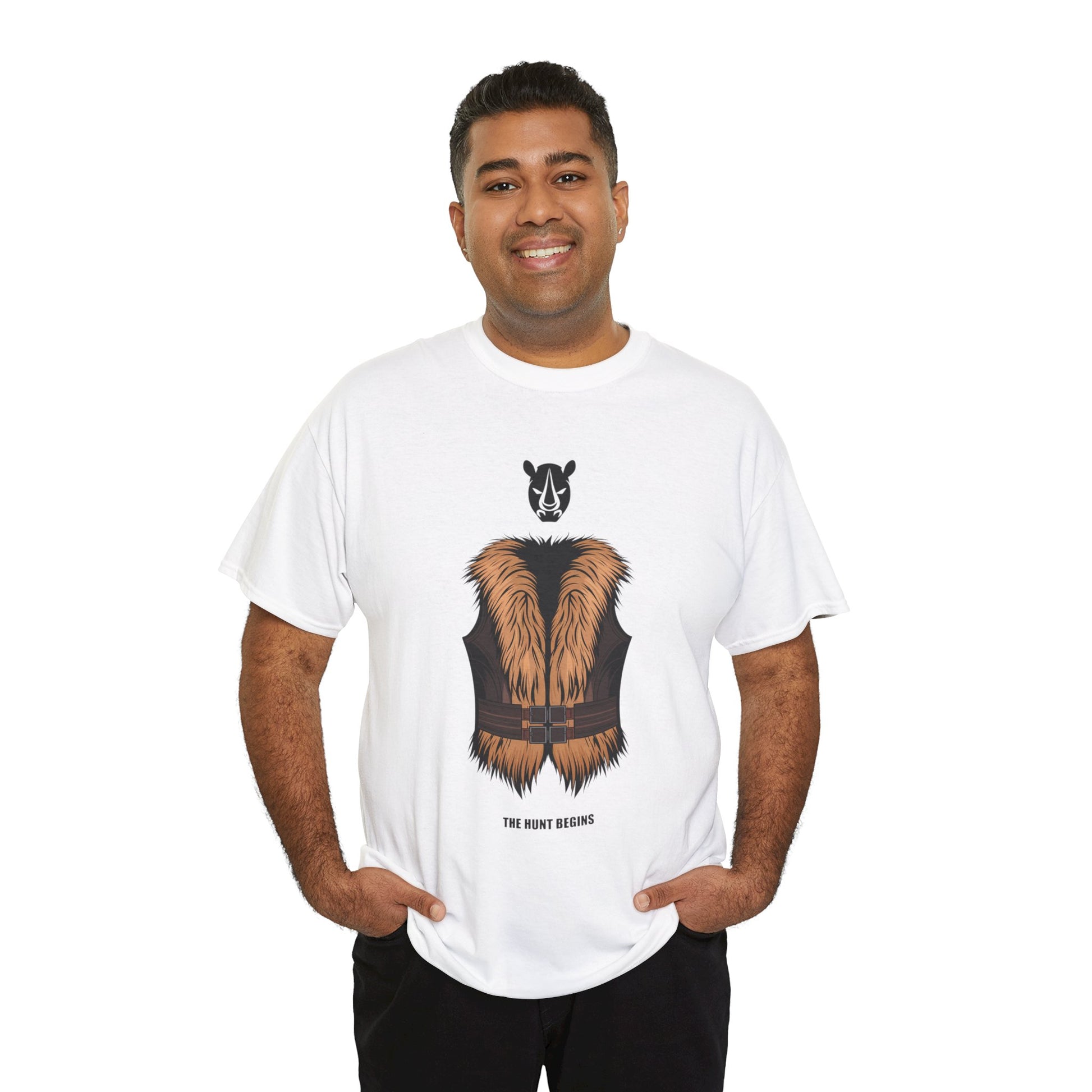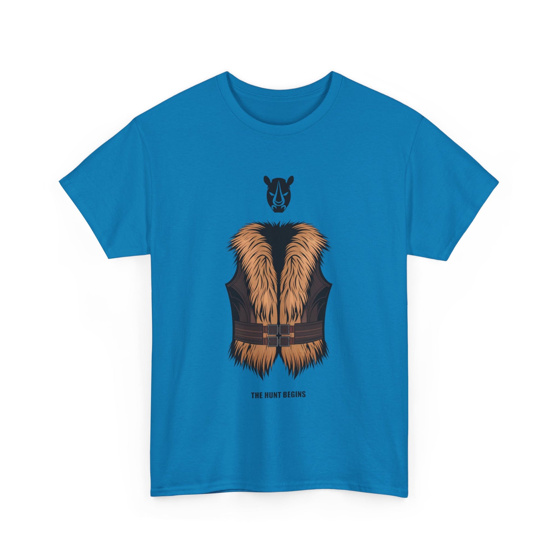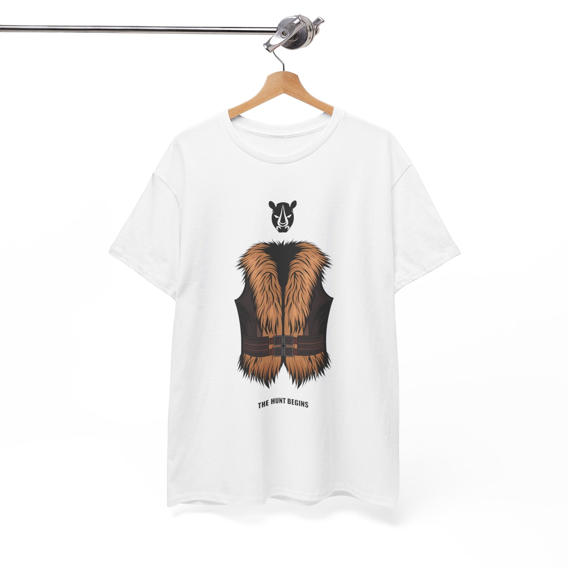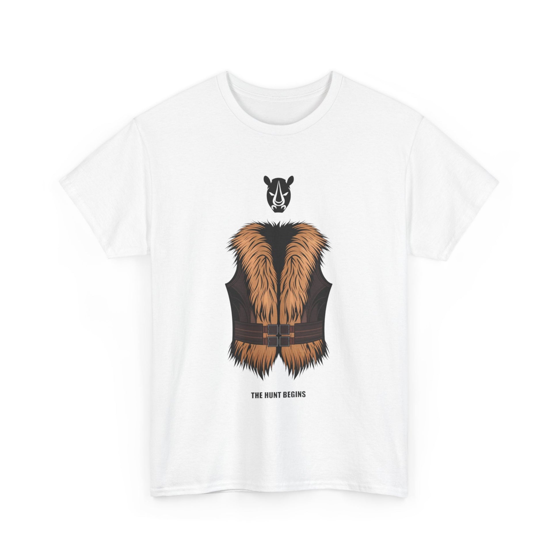 A fun Tee with the classic comic vest that states "The Hunt Begins". It offers a comfy, relaxed wear with a neat, timeless look that can blend into any occasion, casual or semi-formal. Perfect for those who enjoy playful and trendy designs. Relevant for casual wear, gifting on birthdays, comic-con events, and casual hangouts with friends.
