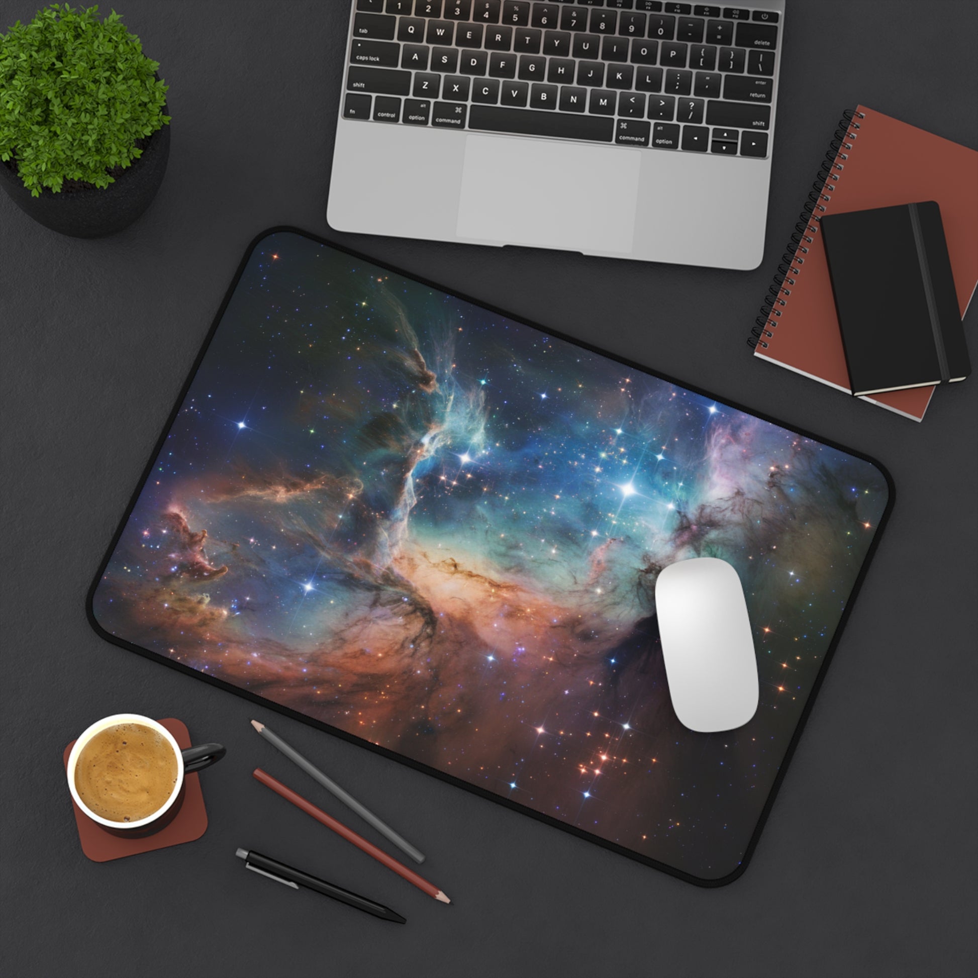 A fun desk mat/mouse pad with a cosmic space art on it. It gives a creative and inspiring vibe to your workspace, perfect for students, artists, and space enthusiasts. Ideal for back-to-school, birthdays, or any occasion to add a touch of personality to your desk setup.