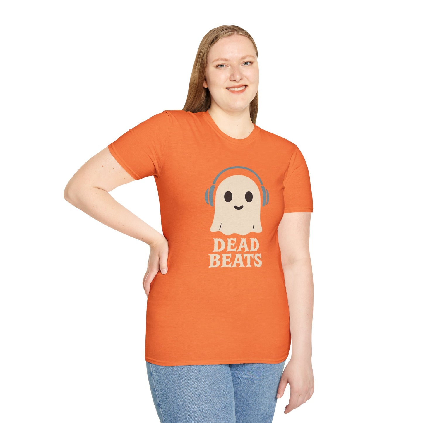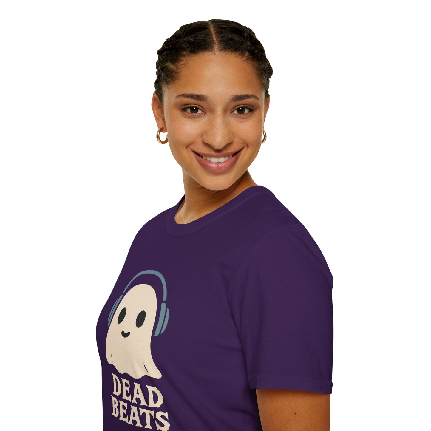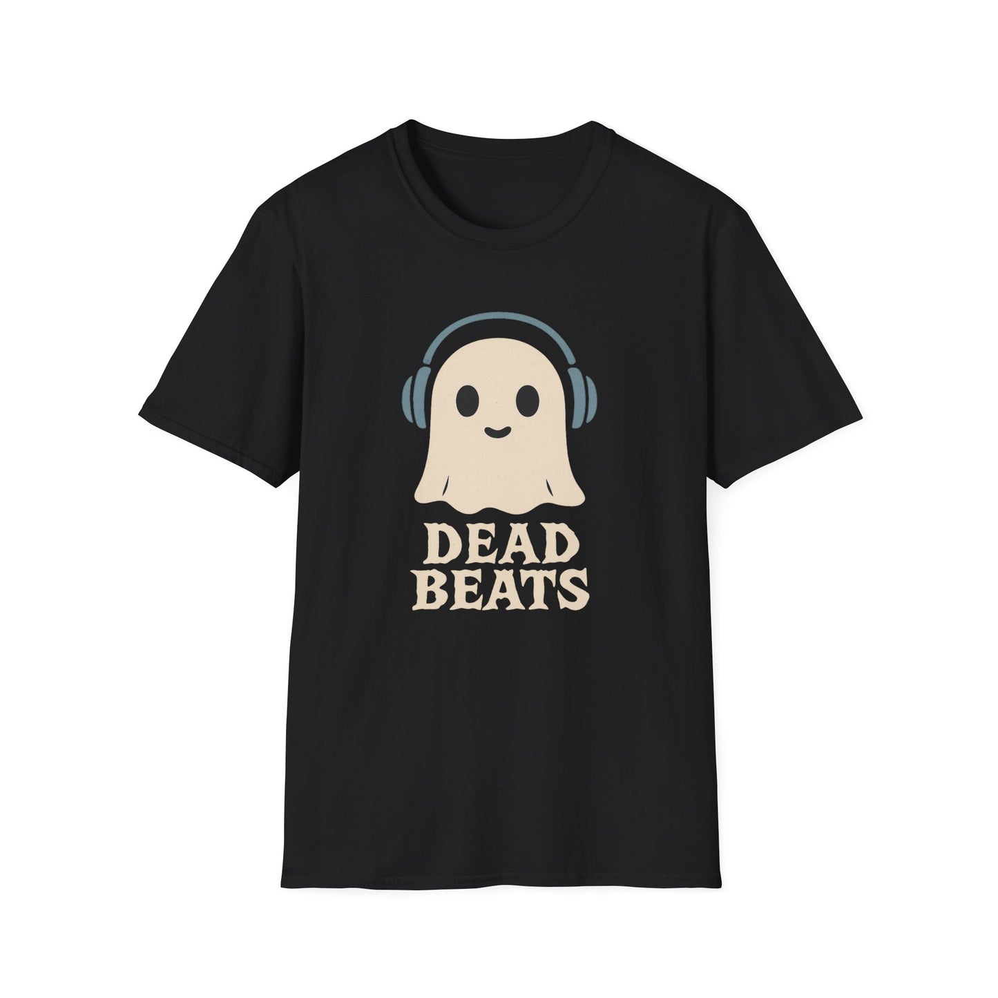 Dead Beats Ghost T-Shirt - Funny Music Halloween Shirt - Cute Ghost with Headphones Tee - Gift for DJs, Musicians and Spooky Season