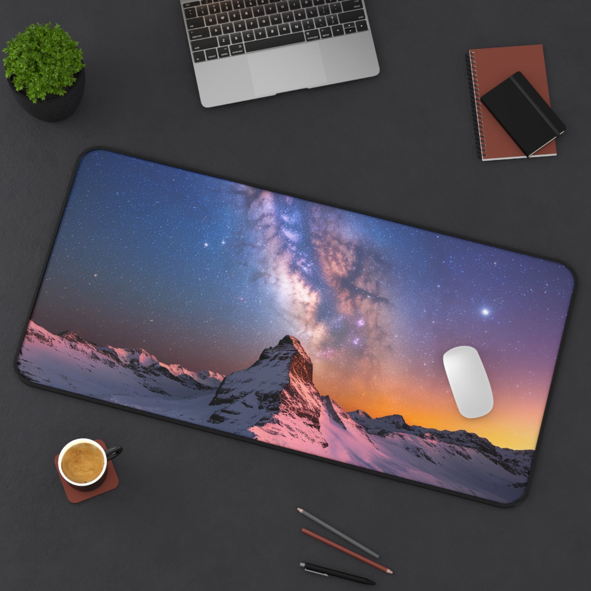 A fun desk mat with a mountain top and a view of the Milky Way Galaxy, giving a peaceful and serene vibe to your workspace. Perfect for stargazers, nature lovers, and anyone looking to add a touch of whimsy to their desk. Ideal for astronomy enthusiasts, Earth Day celebrations, and back to school season.