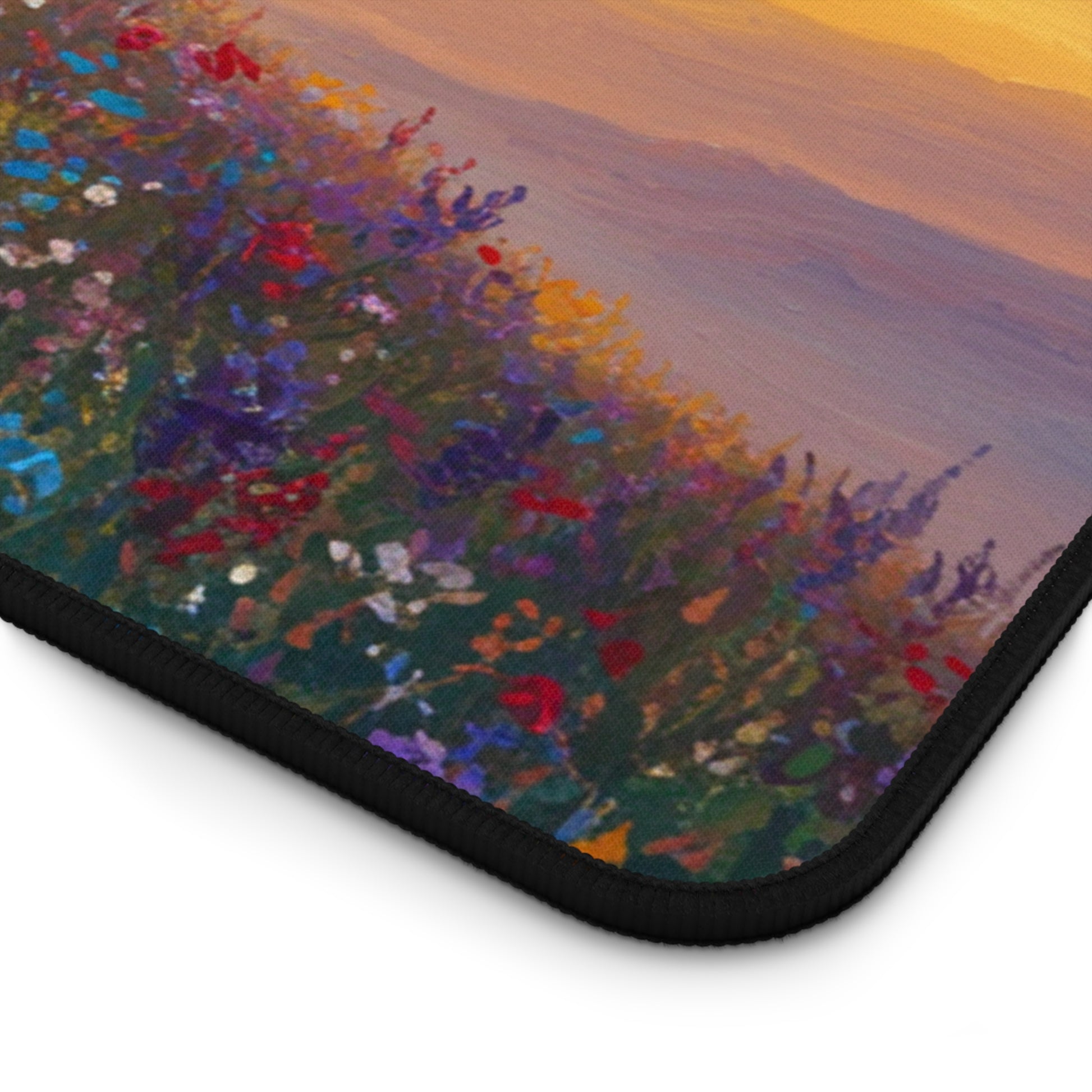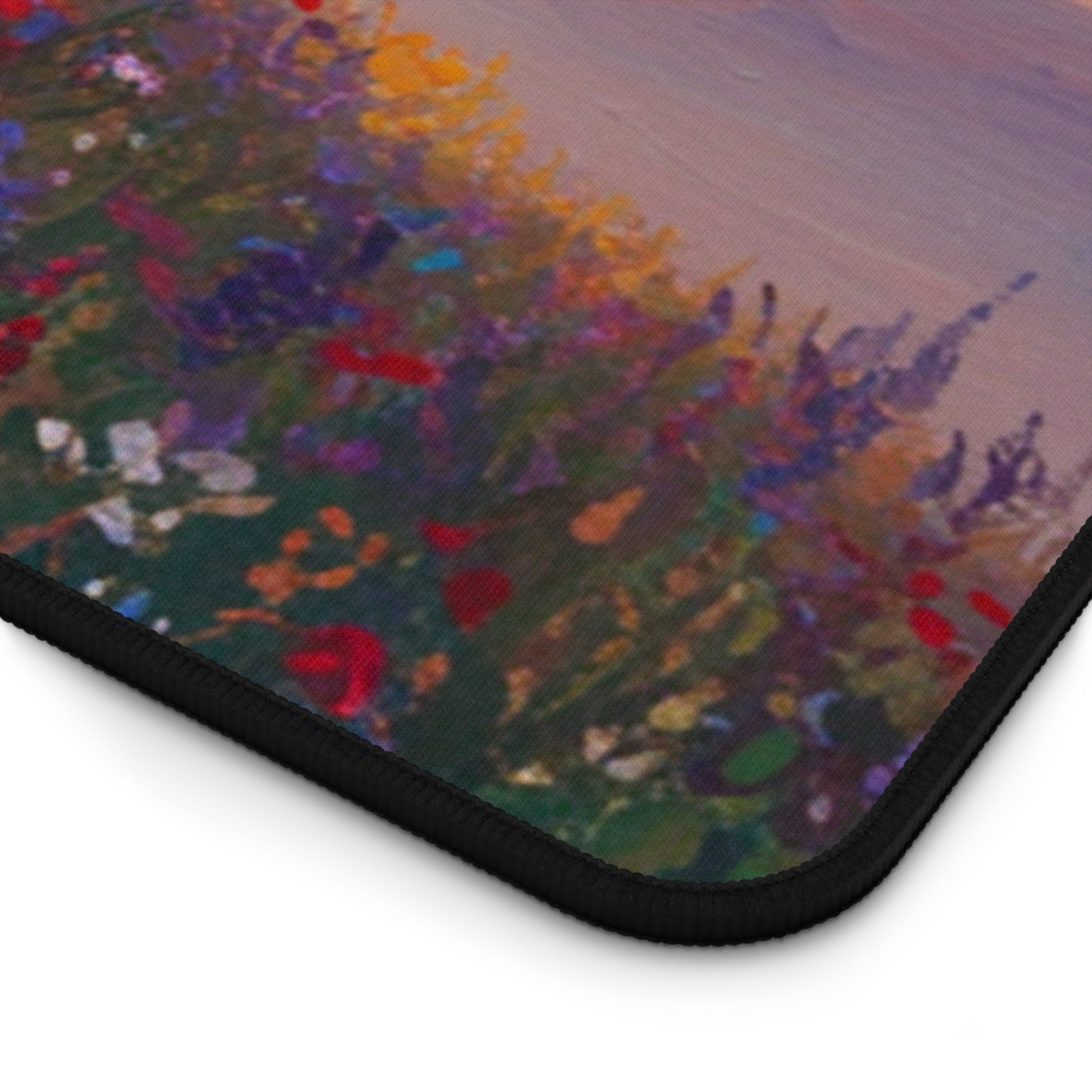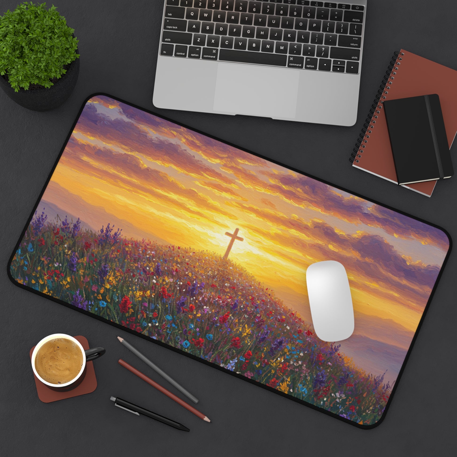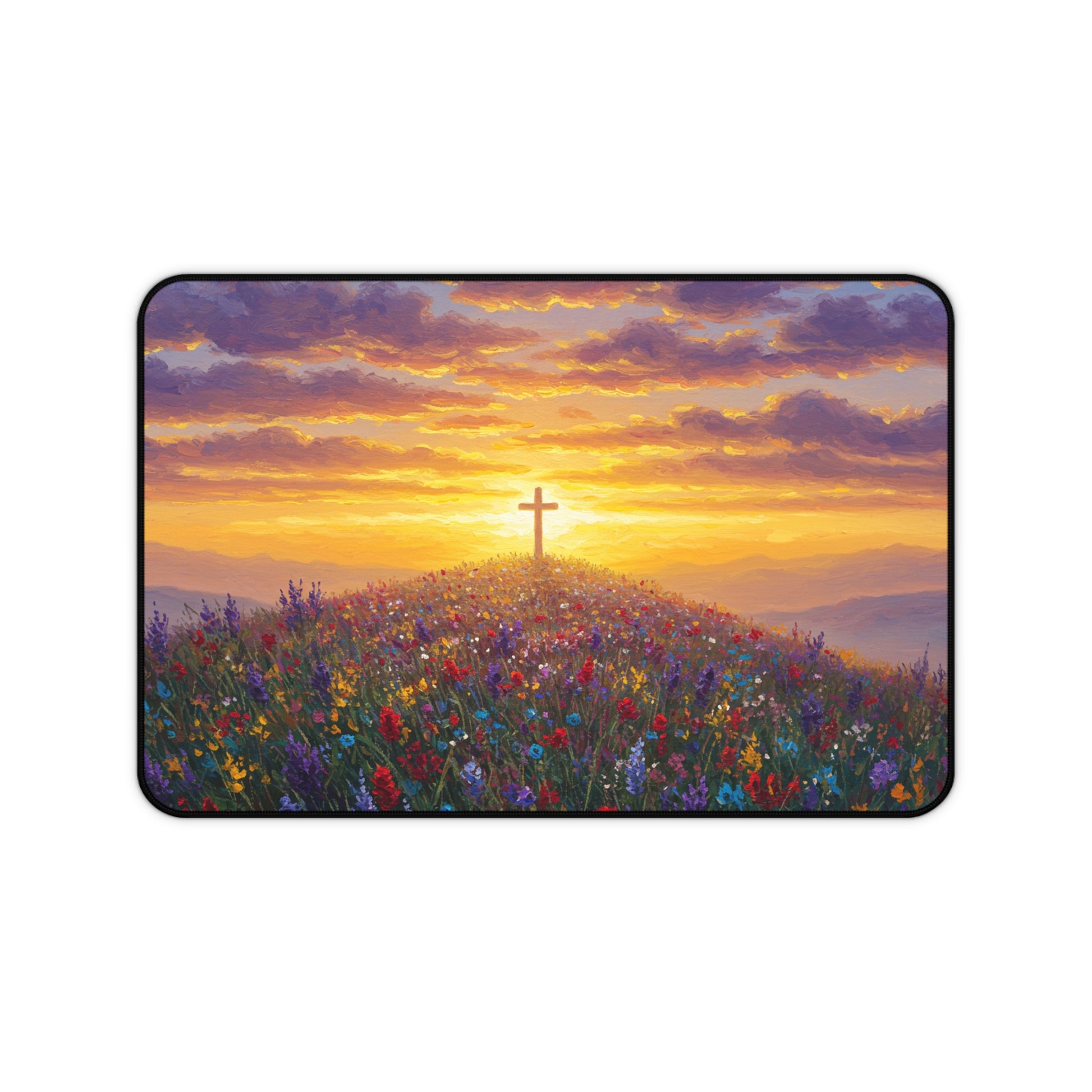 A fun Desk Mat/Mouse Pad featuring a painting of a cross on a hill done in the style of Monet. Perfect for adding a touch of art to your workspace and providing a supportive surface for writing, typing, or crafting. Ideal for art enthusiasts and those looking to add a creative touch to their desk. Relevant for Easter, religious holidays, and art-related occasions.