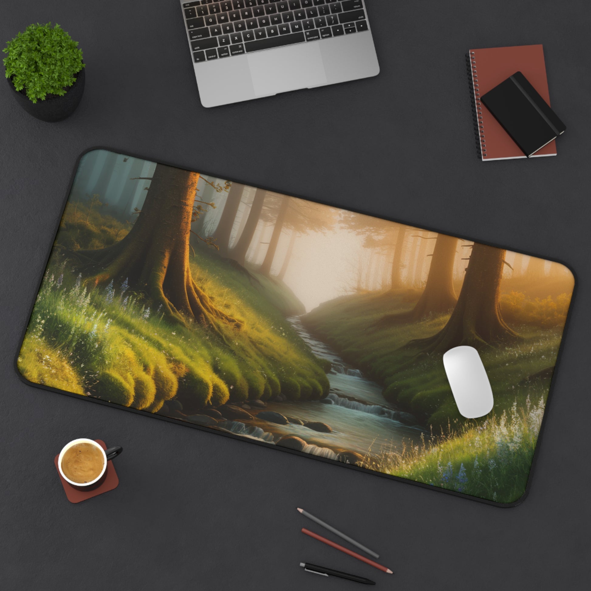 A fun Desk Mat/Mouse Pad featuring a stream running through a forest, perfect for adding a touch of nature to your workspace. This Desk Mat is ideal for anyone looking to spruce up their desk and stay organized while working or gaming. Great for nature lovers and those who enjoy a serene atmosphere. Perfect for back to school, Earth Day, or as a thoughtful gift for coworkers.