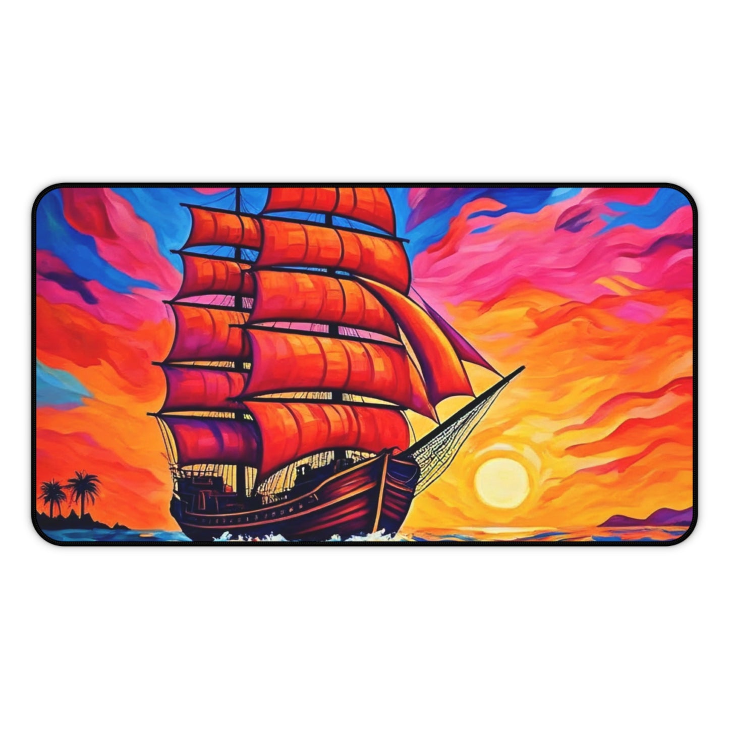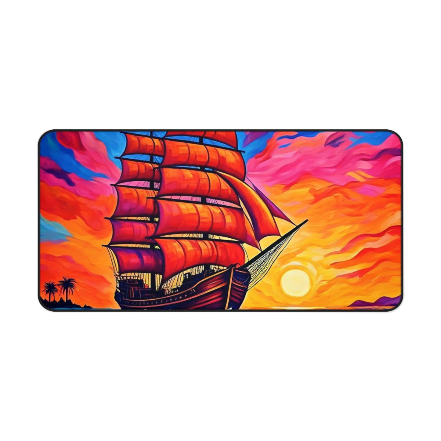 A fun desk mat with a beautiful ship sailing at sunset painting, adding a touch of tranquility and inspiration to your workspace. Perfect for those who love nautical themes and enjoy a serene atmosphere while working. Ideal for adding a creative touch to your desk during summer or for anyone who enjoys the ocean.