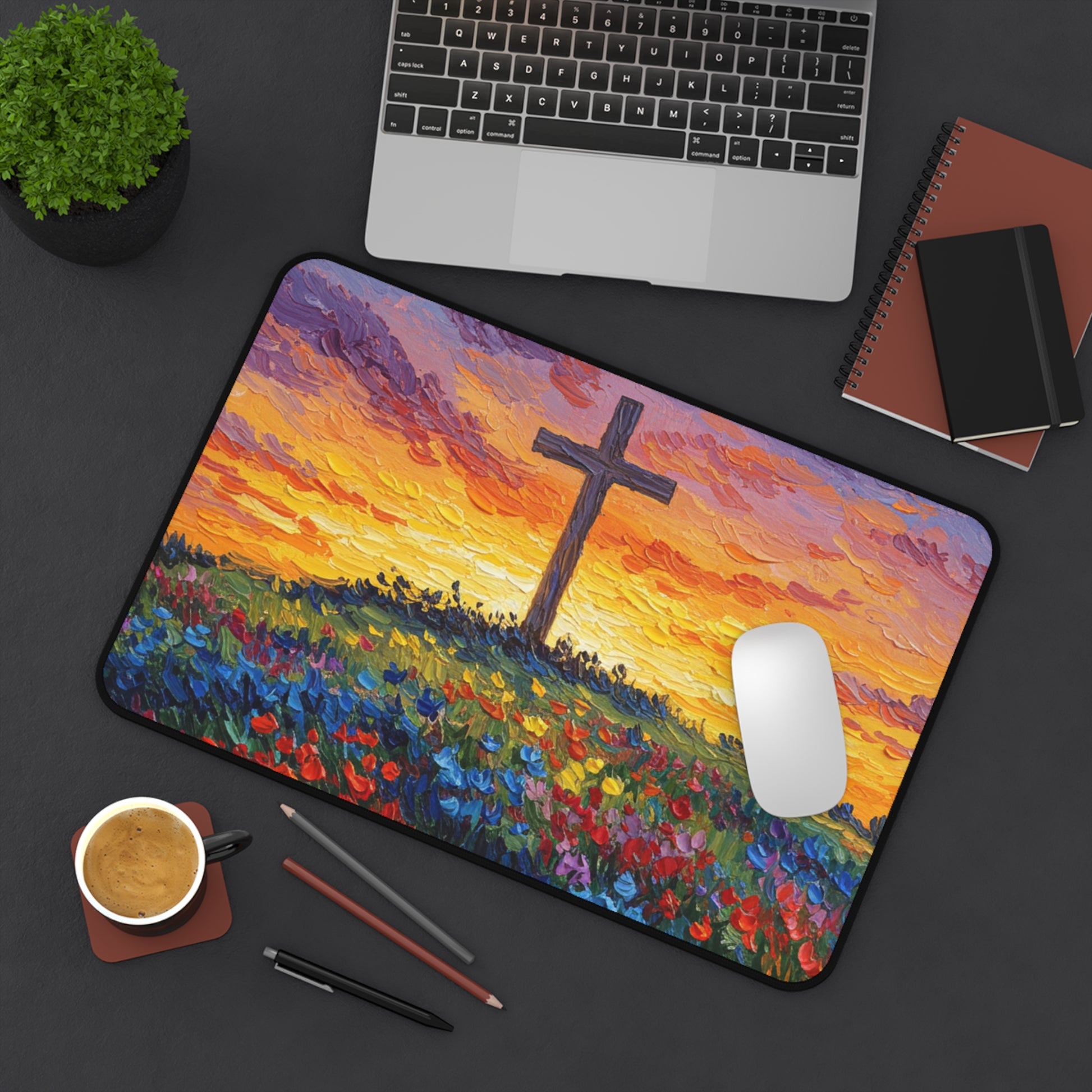A fun desk mat/mouse pad with a cross painted on it in the style of Van Gogh. This desk mat adds a touch of artistic flair to your workspace, providing a supportive surface for writing, typing, or crafting. Perfect for art lovers and those who appreciate unique decor. Ideal for creating a creative atmosphere in your home office or studio. Relevant for art-themed gifts, back-to-school shopping, and home office decor.