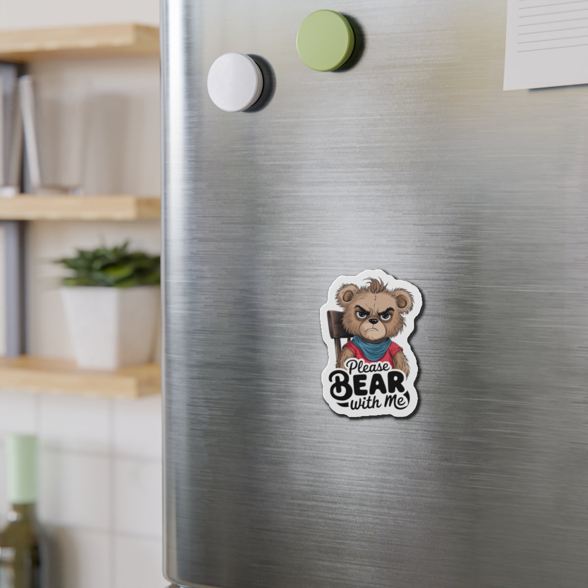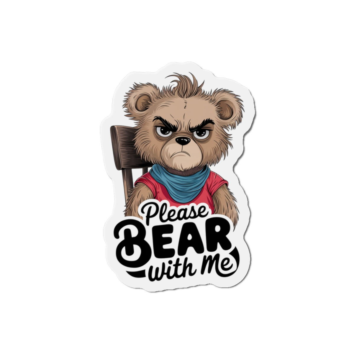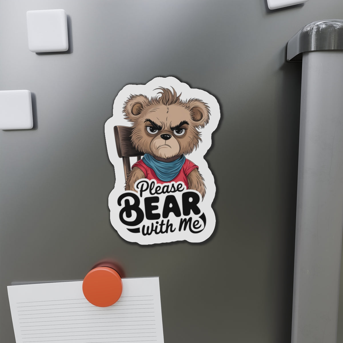 A fun magnet featuring a grumpy bear with the text 'Please Bear With Me'. This magnet adds a touch of humor to any magnetic surface, perfect for those who appreciate cute and witty designs. Ideal for anyone looking to personalize their fridge, locker, or whiteboard.