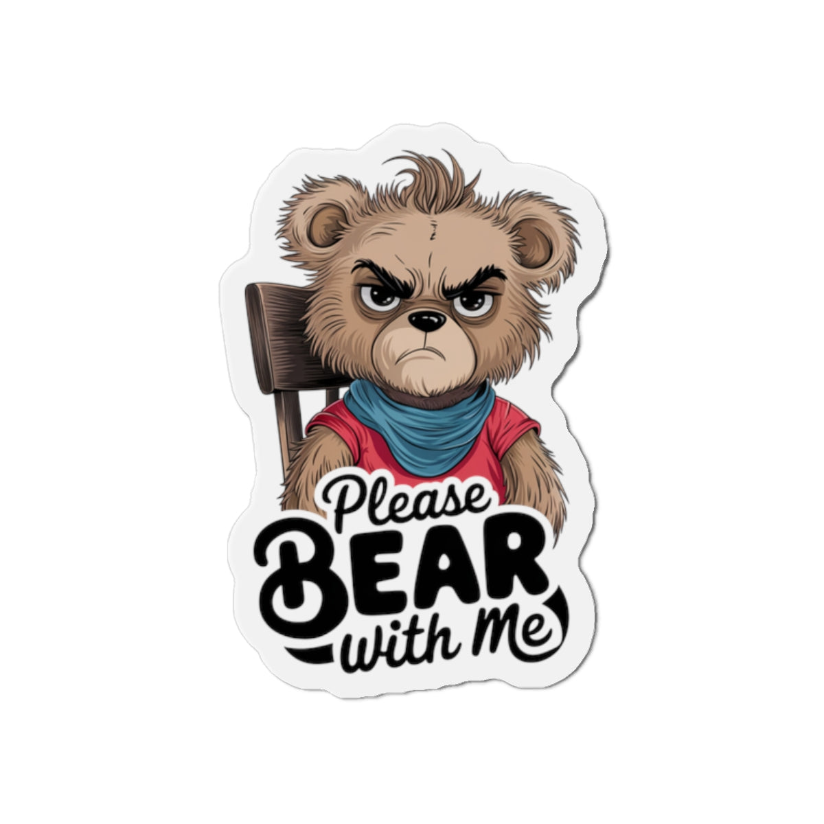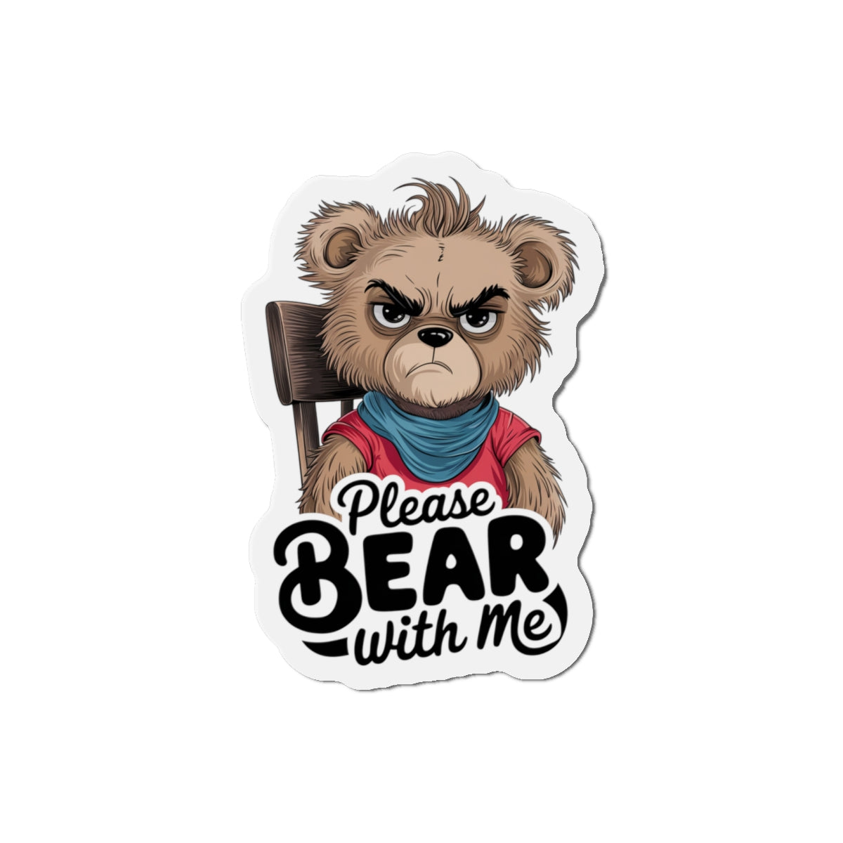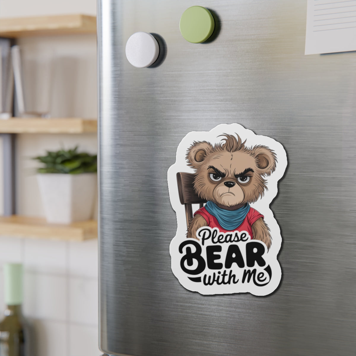 A fun magnet featuring a grumpy bear with the text 'Please Bear With Me'. This magnet adds a touch of humor to any magnetic surface, perfect for those who appreciate cute and witty designs. Ideal for anyone looking to personalize their fridge, locker, or whiteboard.