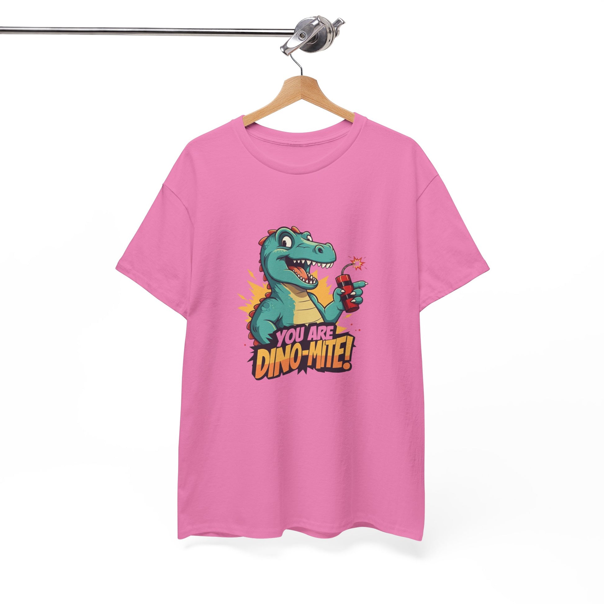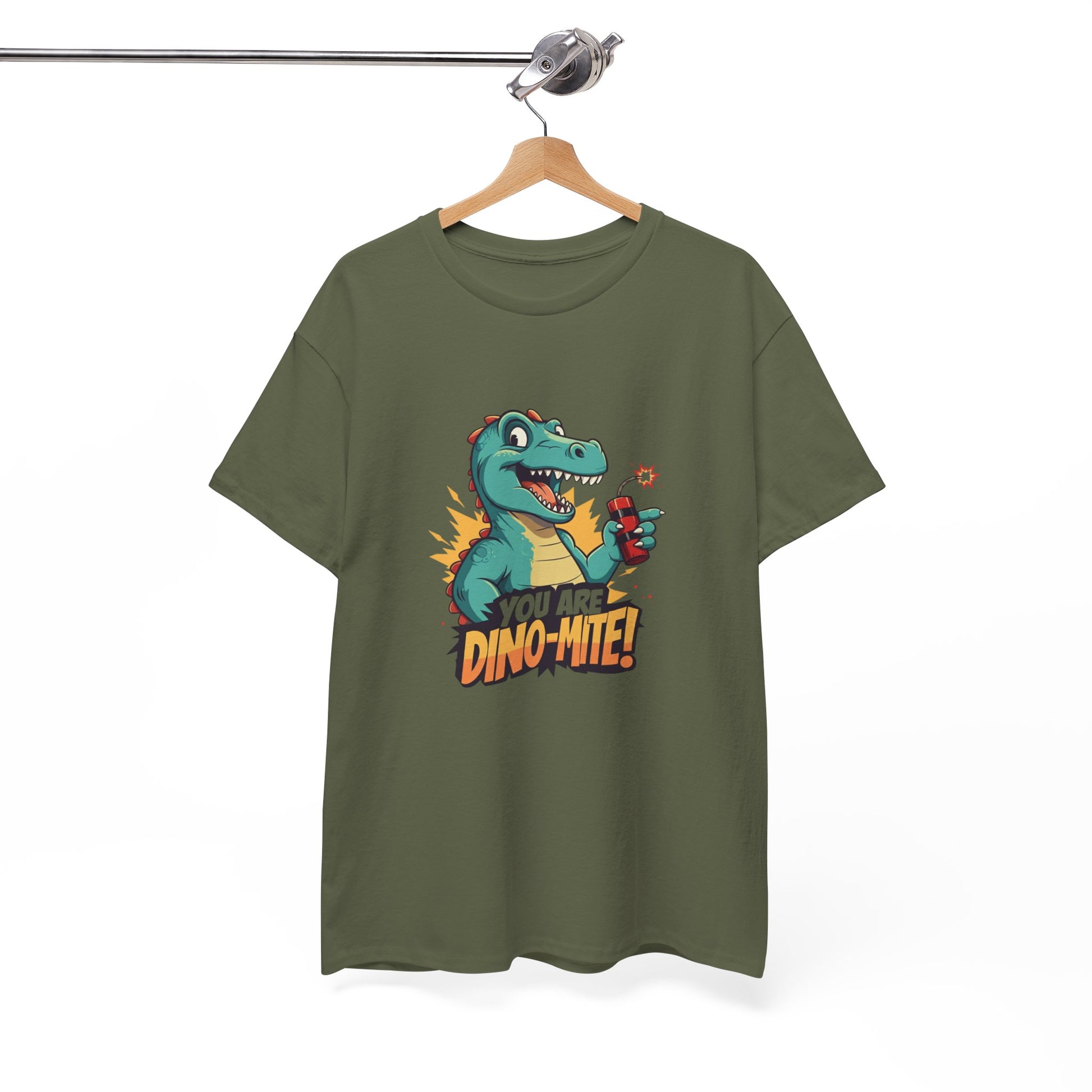Looking for a tee that’s explosively fun? This hilarious dinosaur shirt features a cartoon-style T-Rex holding a stick of dynamite with the pun-tastic phrase “You Are Dino-Mite!” Whether it’s for a birthday, a back-to-school look, or just to make someone smile, this tee brings the BOOM 💥 to any outfit.
