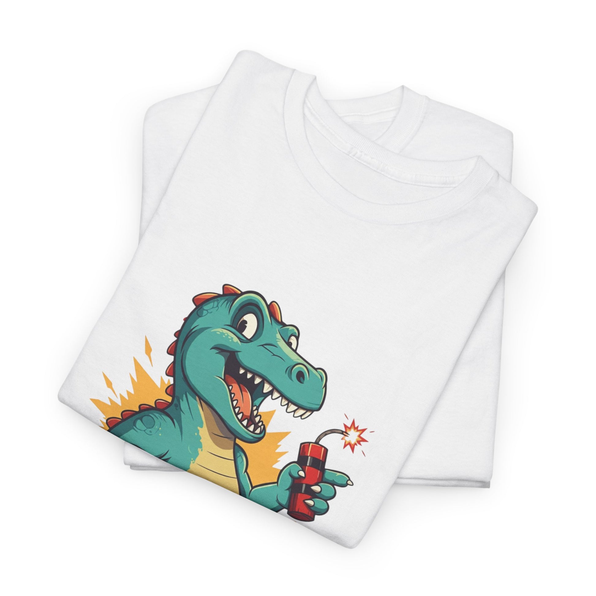 Adorable cartoon T-Rex design with bright, explosive graphics