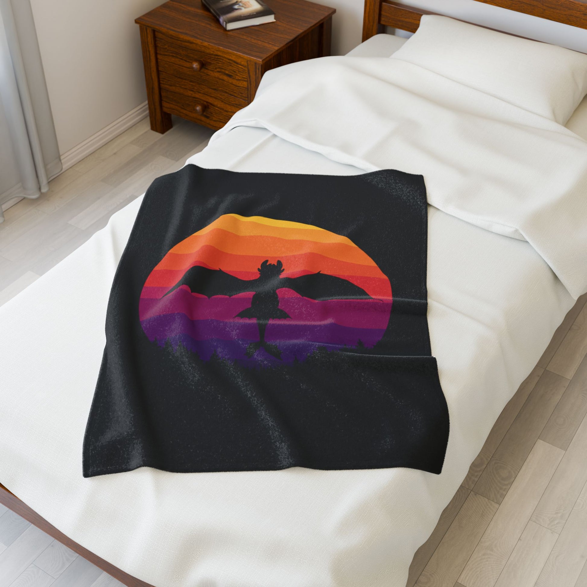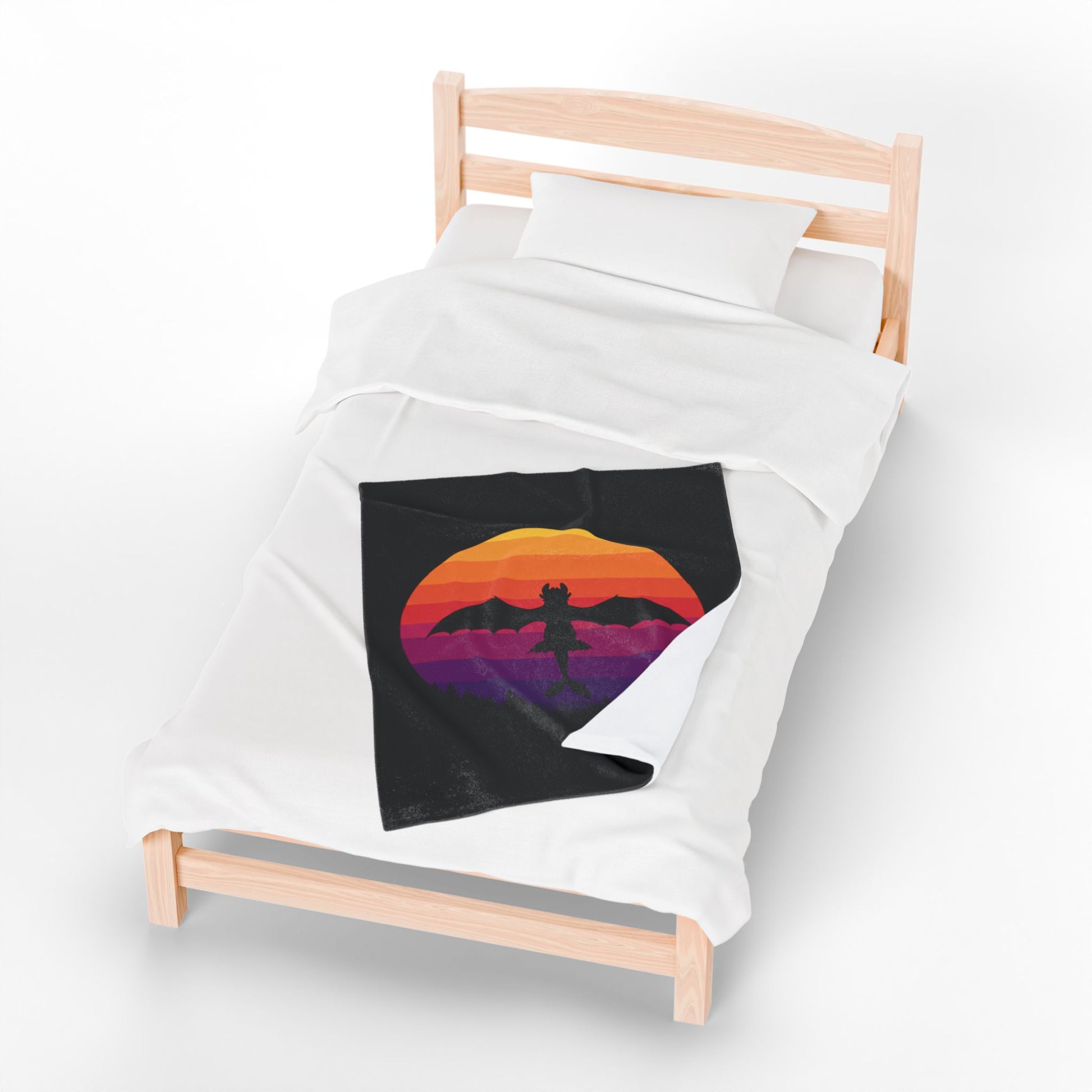 Dragon Sunset Blanket - Retro Dragon Fleece Throw - Fantasy Bedding Gift - Cool Gamer Blanket - Dragon Decor - Cozy Bed Cover for Fans