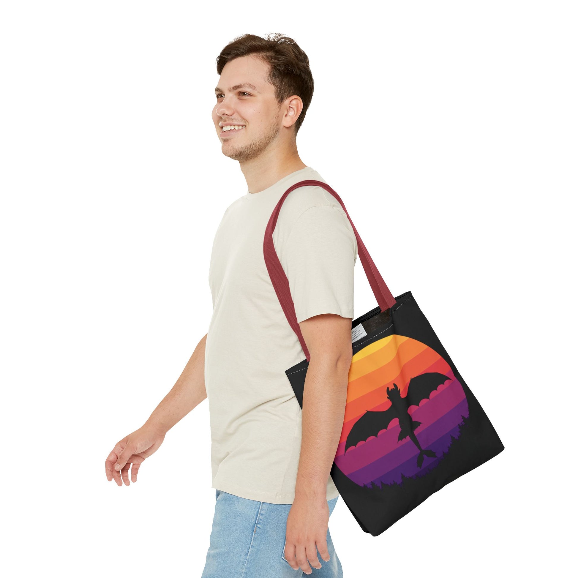 Embrace adventure and style with this Sunset Dragon Flight Tote Bag, featuring a stunning silhouette of a flying dragon against a bold retro sunset. The vivid orange, red, and purple tones create a striking contrast on a black background, making it a standout accessory for everyday wear. Spacious and durable, it’s perfect for carrying books, groceries, gym gear, or travel essentials. A great gift for fantasy lovers and anyone who enjoys artistic, unique accessories.