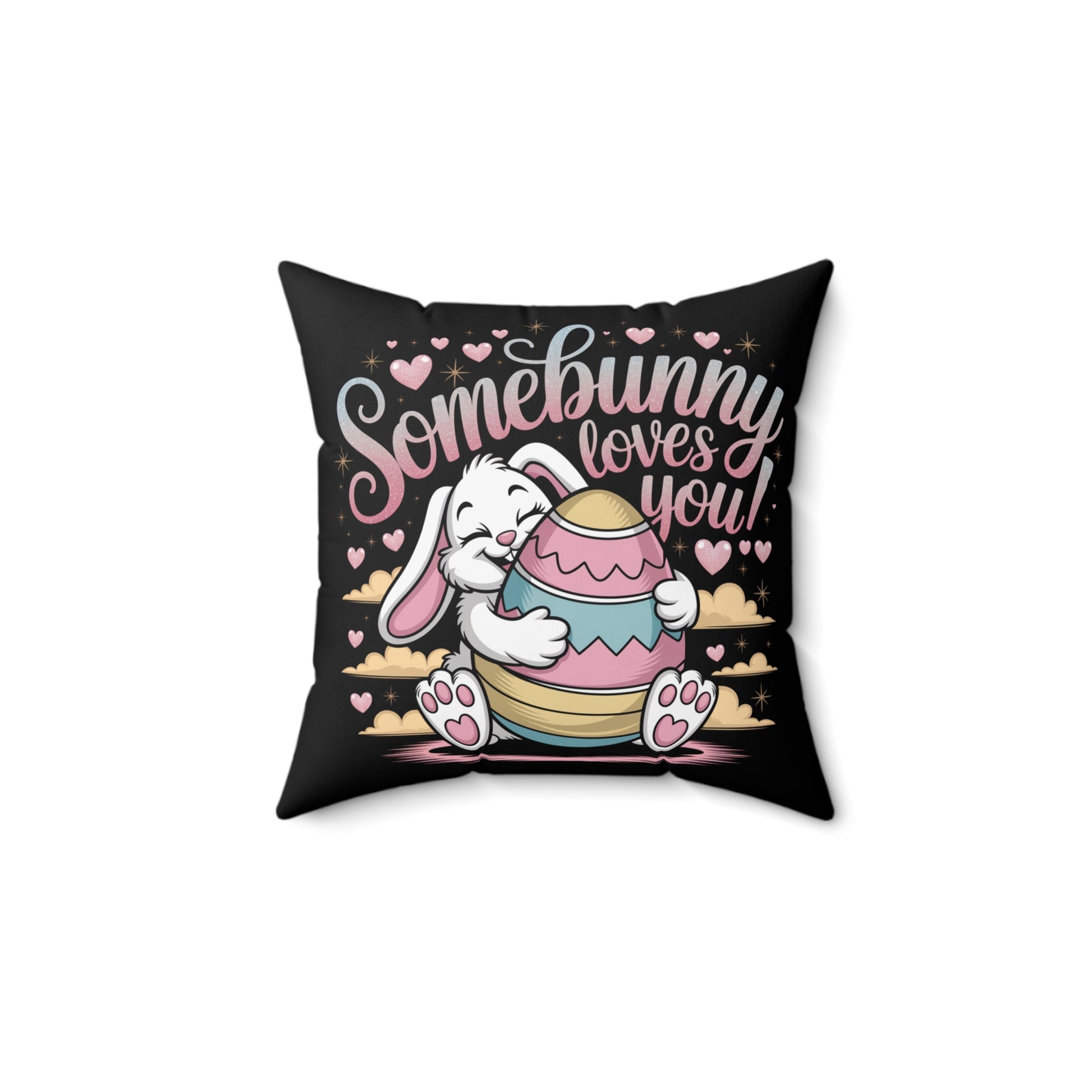 A fun pillow featuring the Easter Bunny and the message 'Somebunny Loves You'. Perfect for adding a touch of Easter cheer to your home decor or as a gift for someone special during the Easter season.