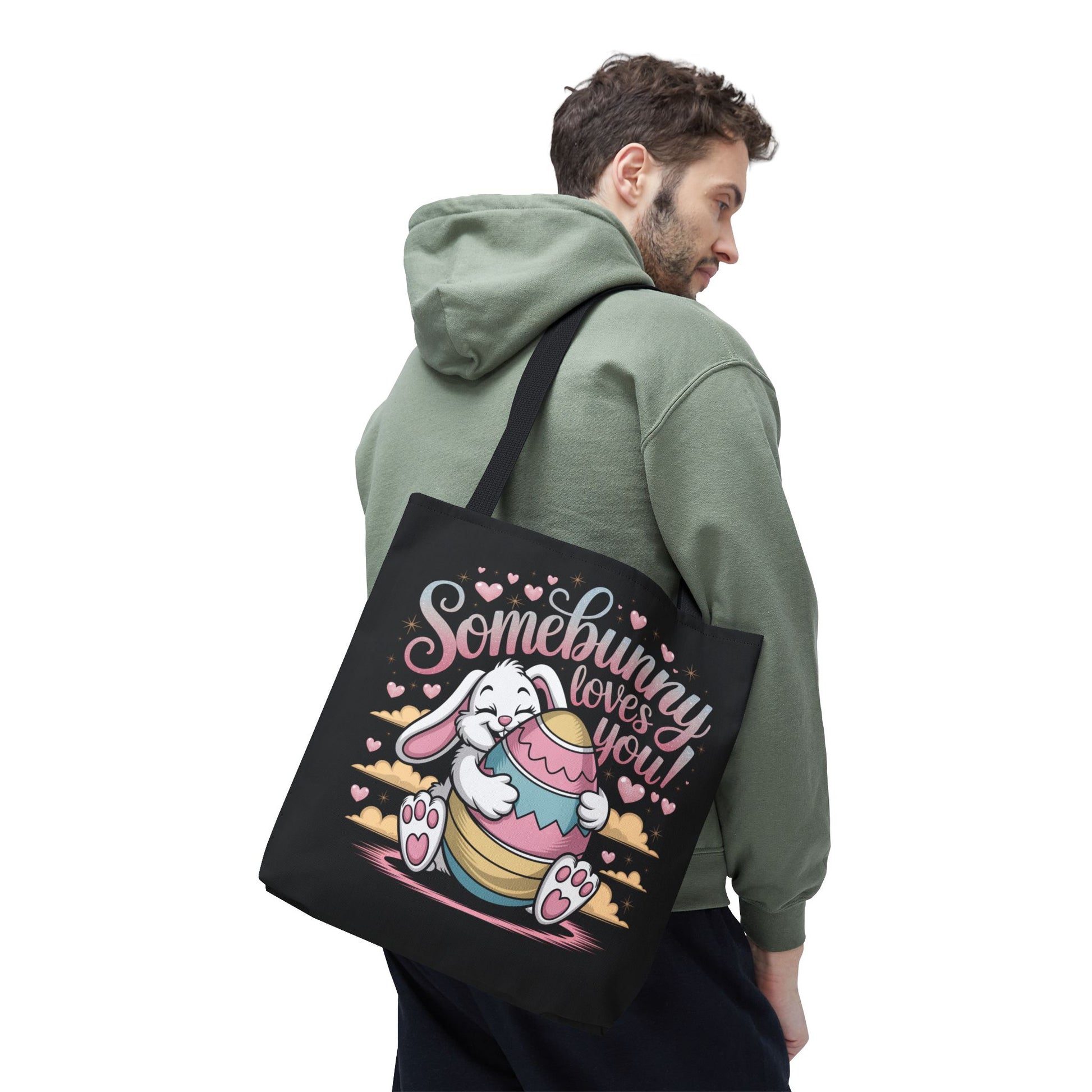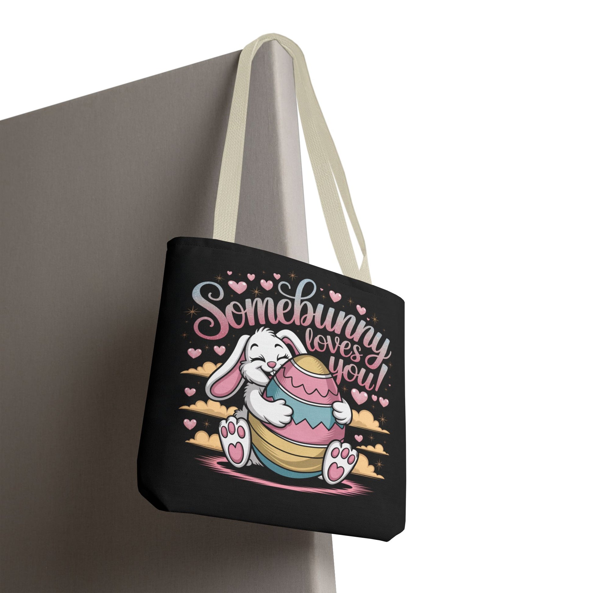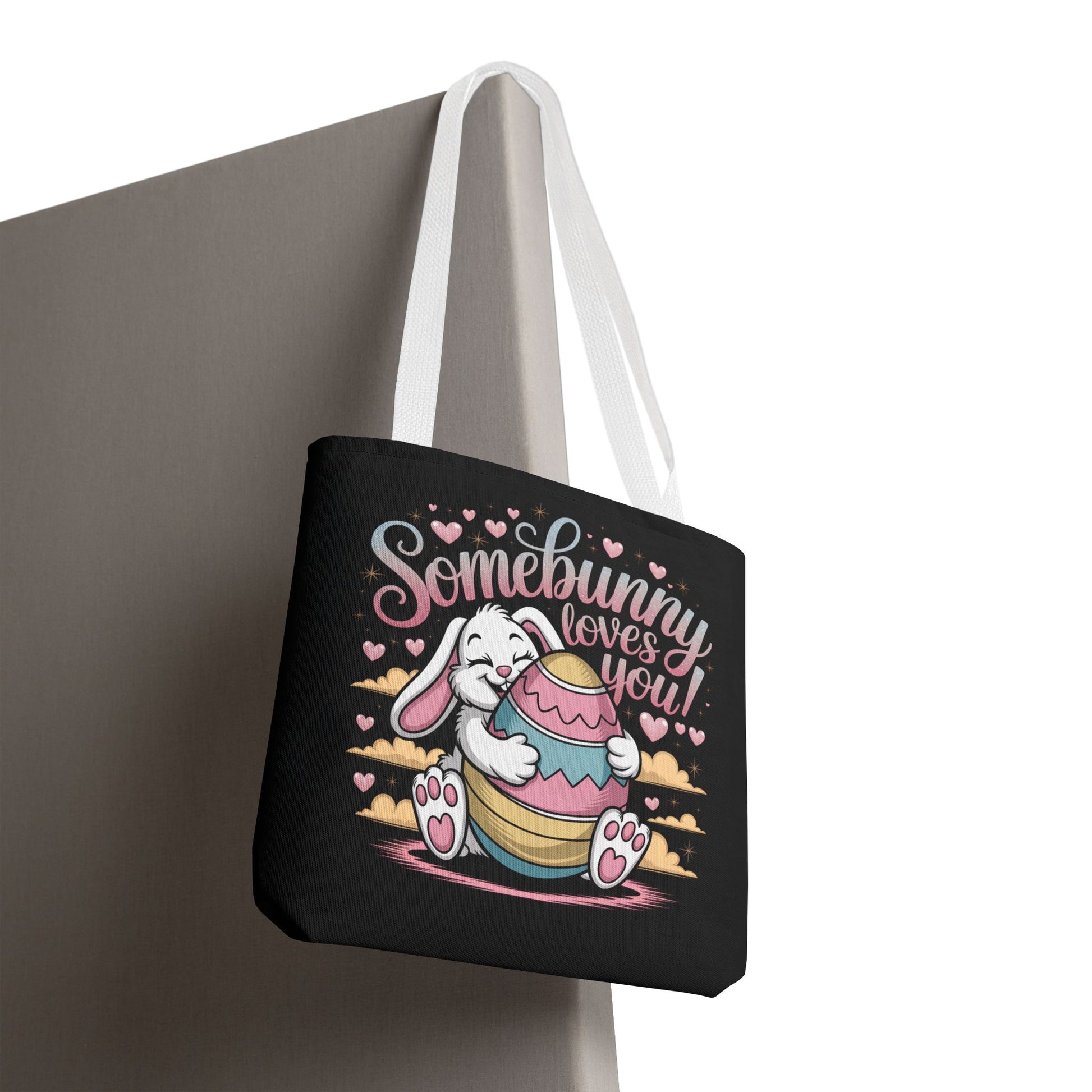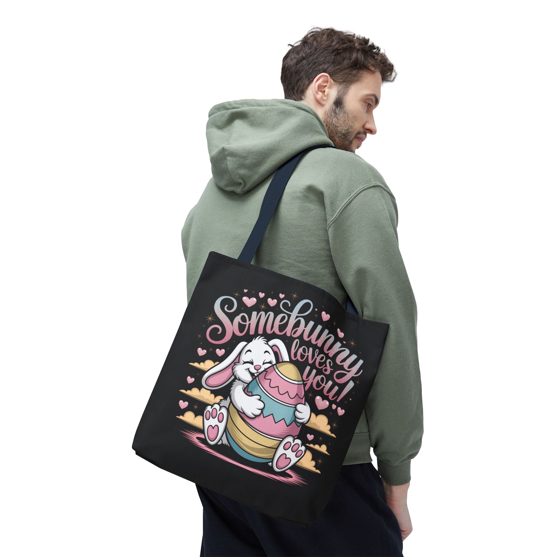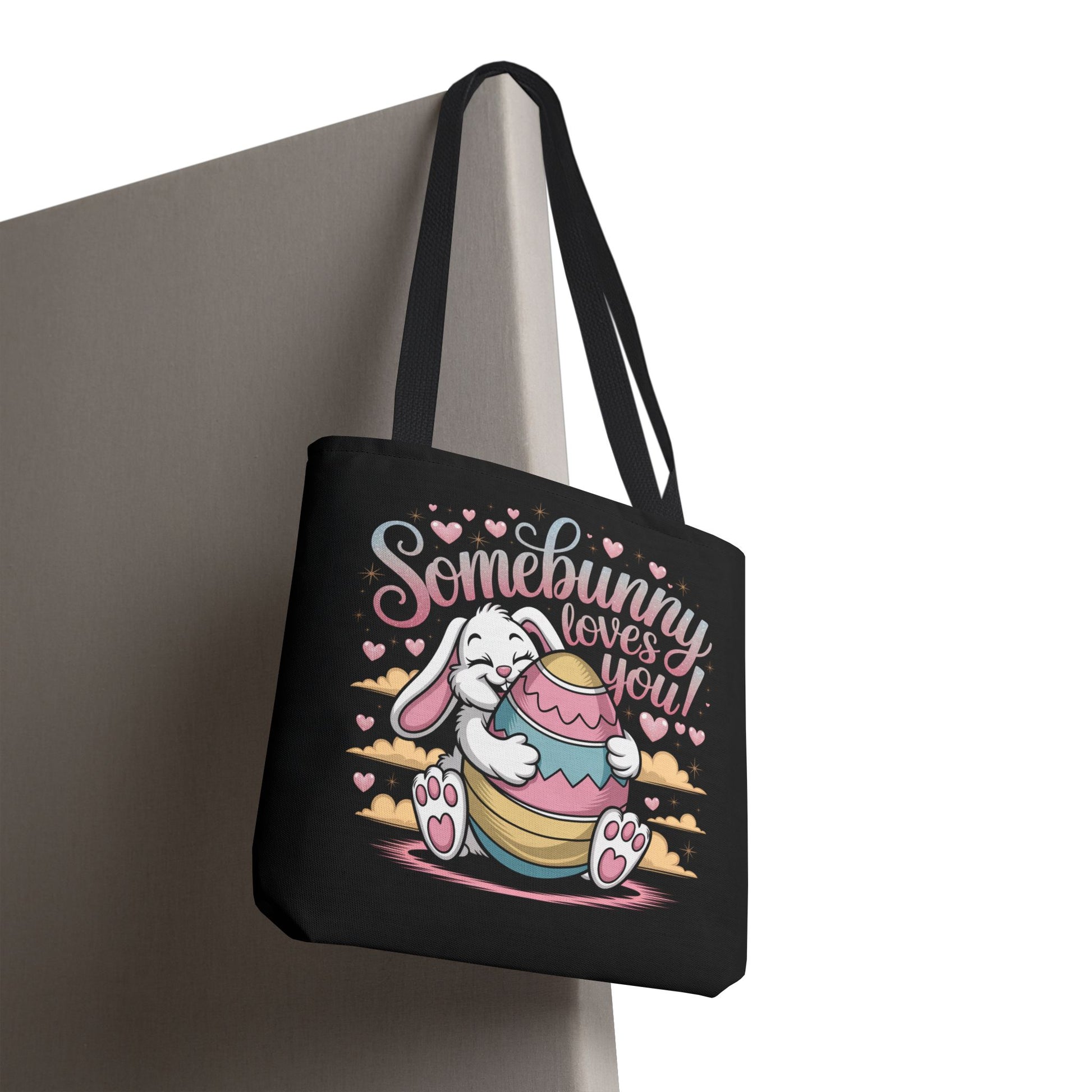 A fun tote bag featuring the Easter Bunny with the phrase 'Somebunny Loves you'. Perfect for Easter celebrations and to spread some love. Ideal for those who love cute and festive accessories.