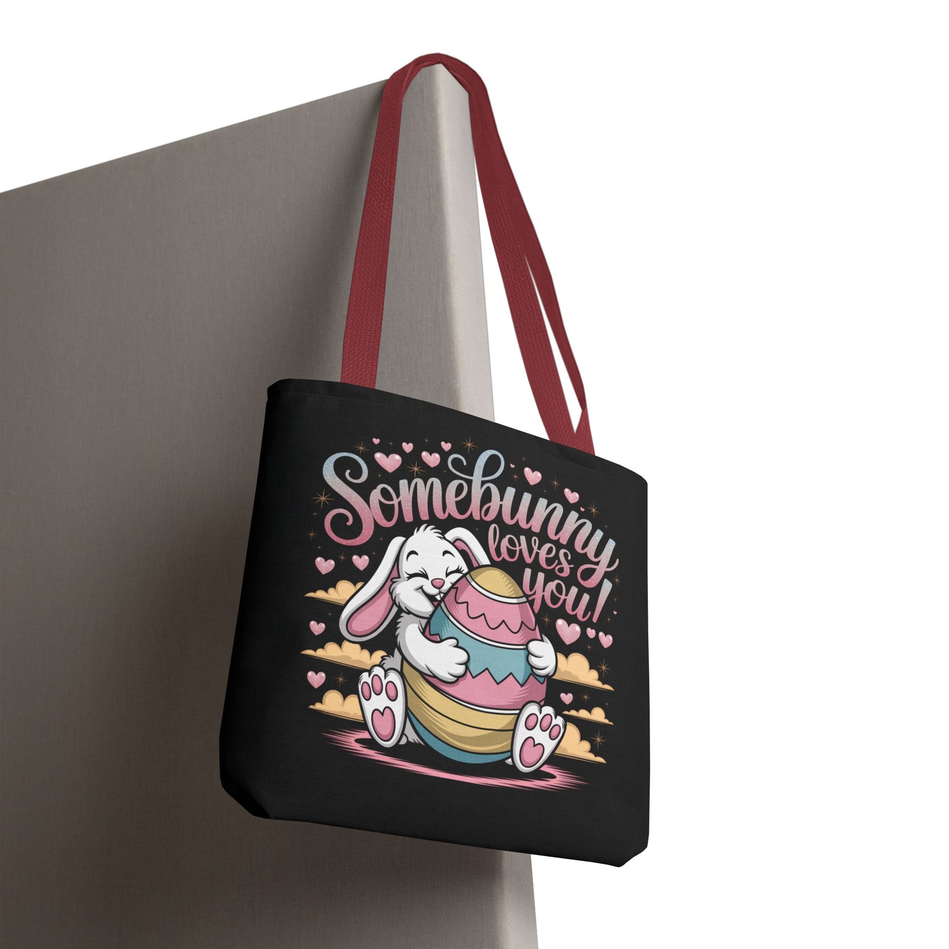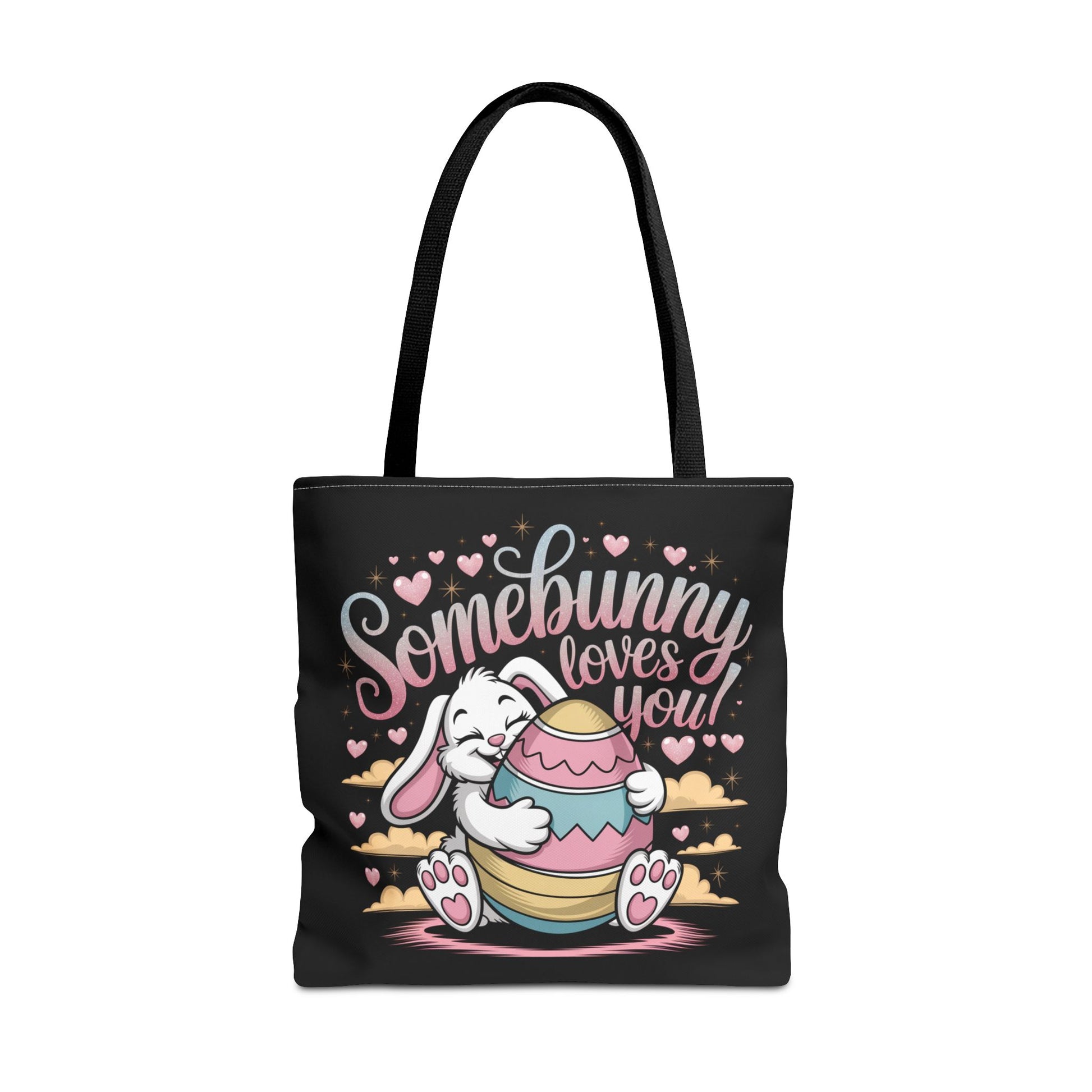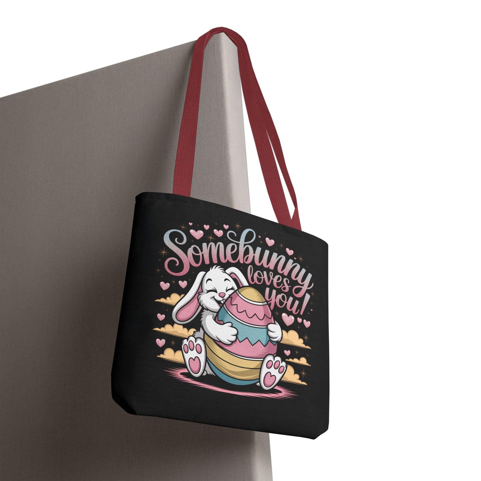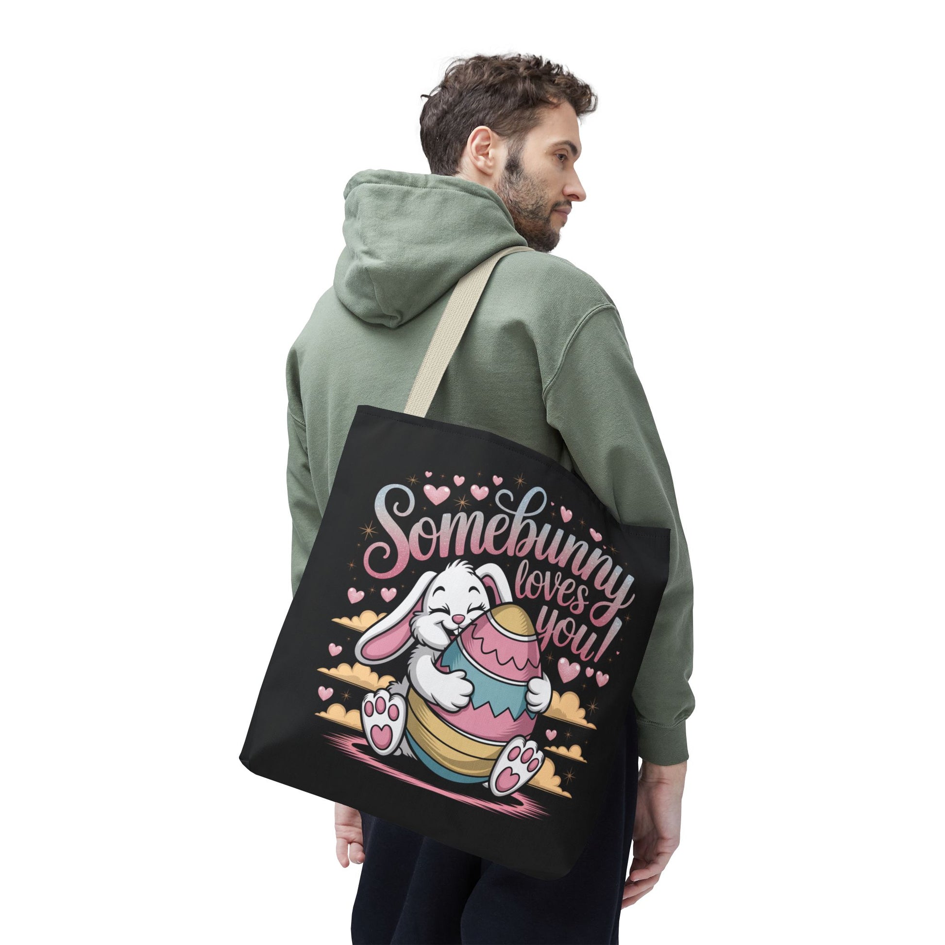 A fun tote bag featuring the Easter Bunny with the phrase 'Somebunny Loves you'. Perfect for Easter celebrations and to spread some love. Ideal for those who love cute and festive accessories.